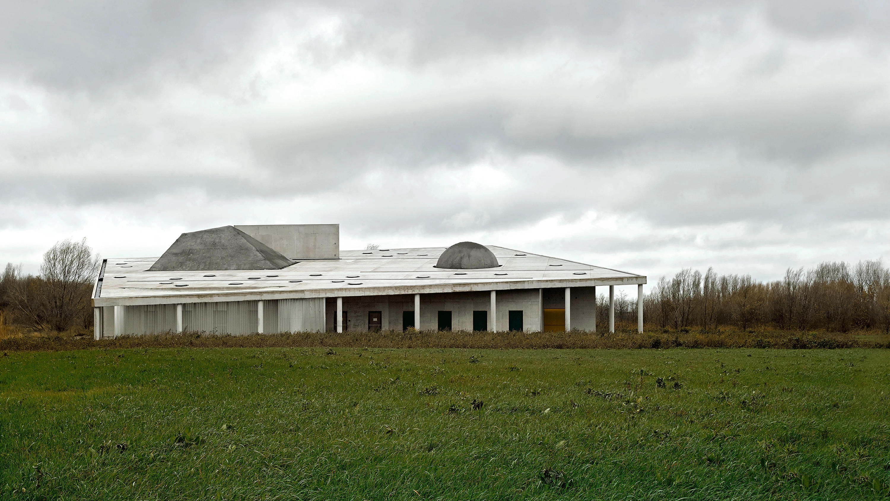 A crematorium is an important public building. It has, however, a conflicted attitude towards self-expression, torn between its technical content and its ceremonial character. To overcome this, the building is designed as a big inclined table, of which the roof is the protagonist, emerging from the polders around the coastal city of Ostend. The roof itself is dotted with skylights and abstract shapes that fulfill both technical and symbolic requirements. Underneath it is a mix of public, administrative and technical functions in a single-storey building. The spaces are organized in lateral strips of various widths, containing reception areas, waiting rooms, and the centrally located ceremonial halls, alternating with thin bands of auxiliary functions and passages. The cremators are located under the highest point of the building. The relation of the spaces to the surrounding landscape is indirect, and mediated through a double facade of glass and perforated metal panels, allowing for a discreet and serene atmosphere in the halls. The twist in direction between the programmatic strips and the roof surfaces creates a continuous set of triangular spaces of varying height, which function as a covered arcade around the building...