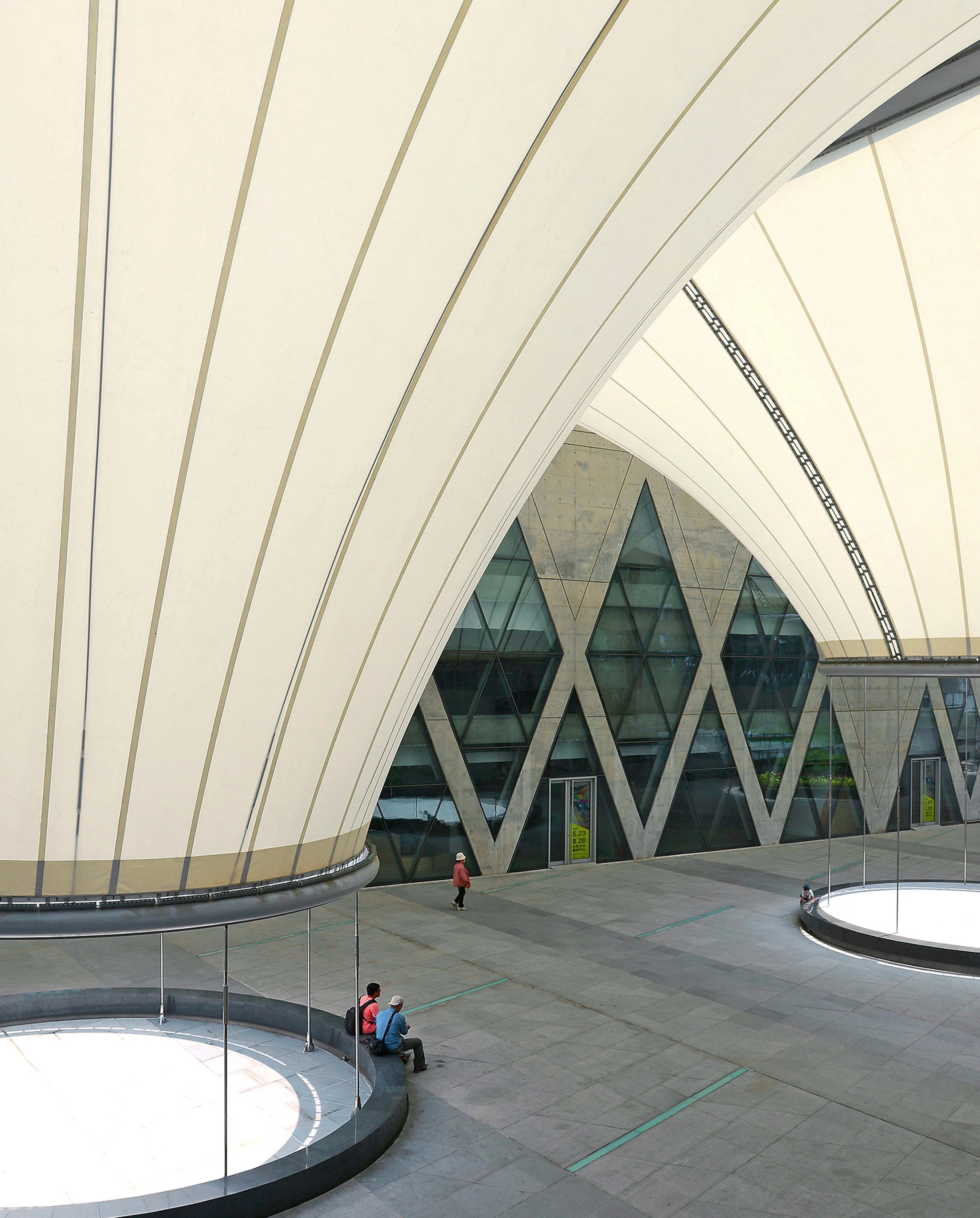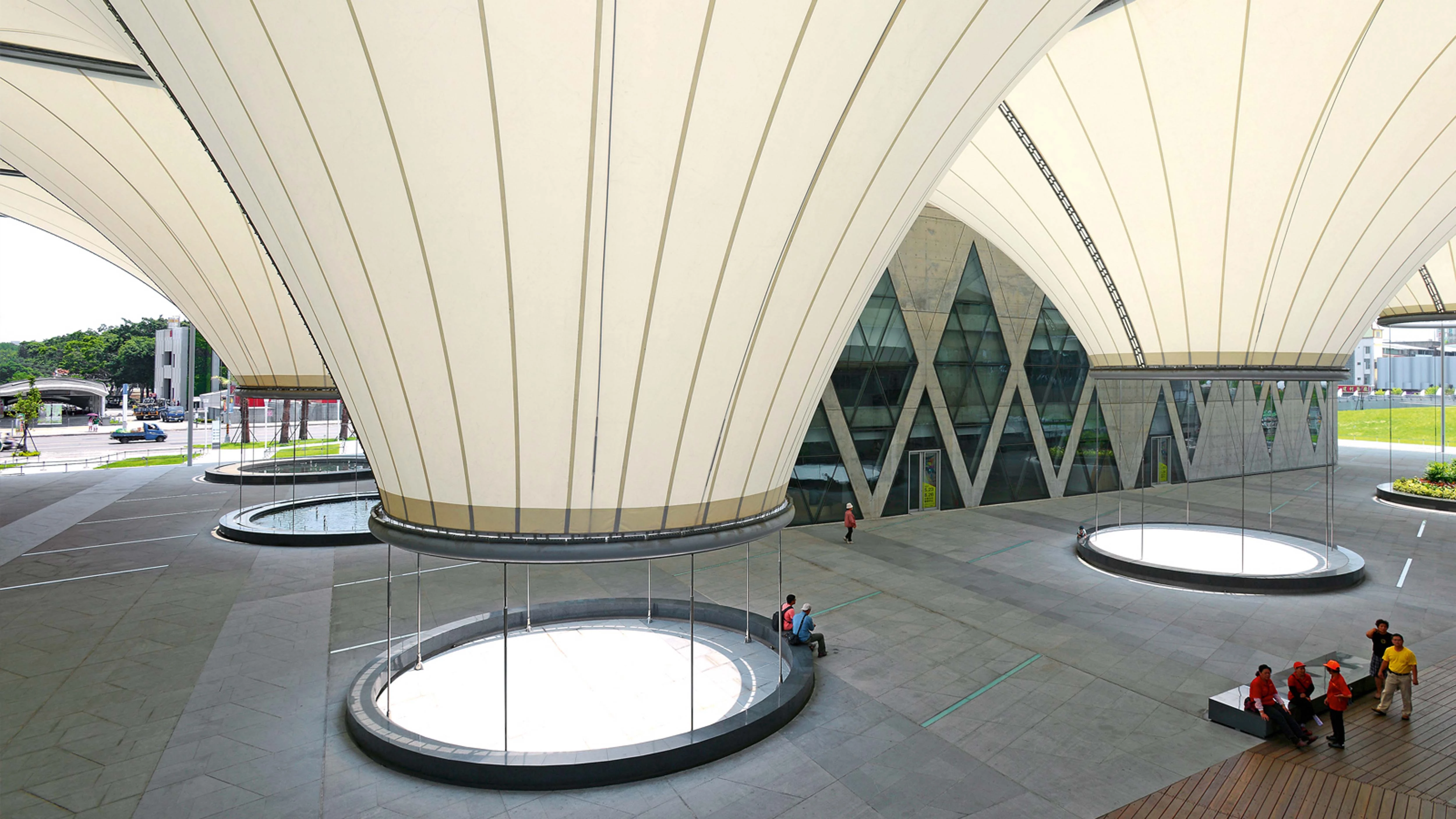A series of membranes are arranged between the four main volumes of the art center, generating a sequence of covered public spaces that offer shelter to visitors. Their shape has been designed to deal with situations of extreme rainfall such as typhoons... [+]