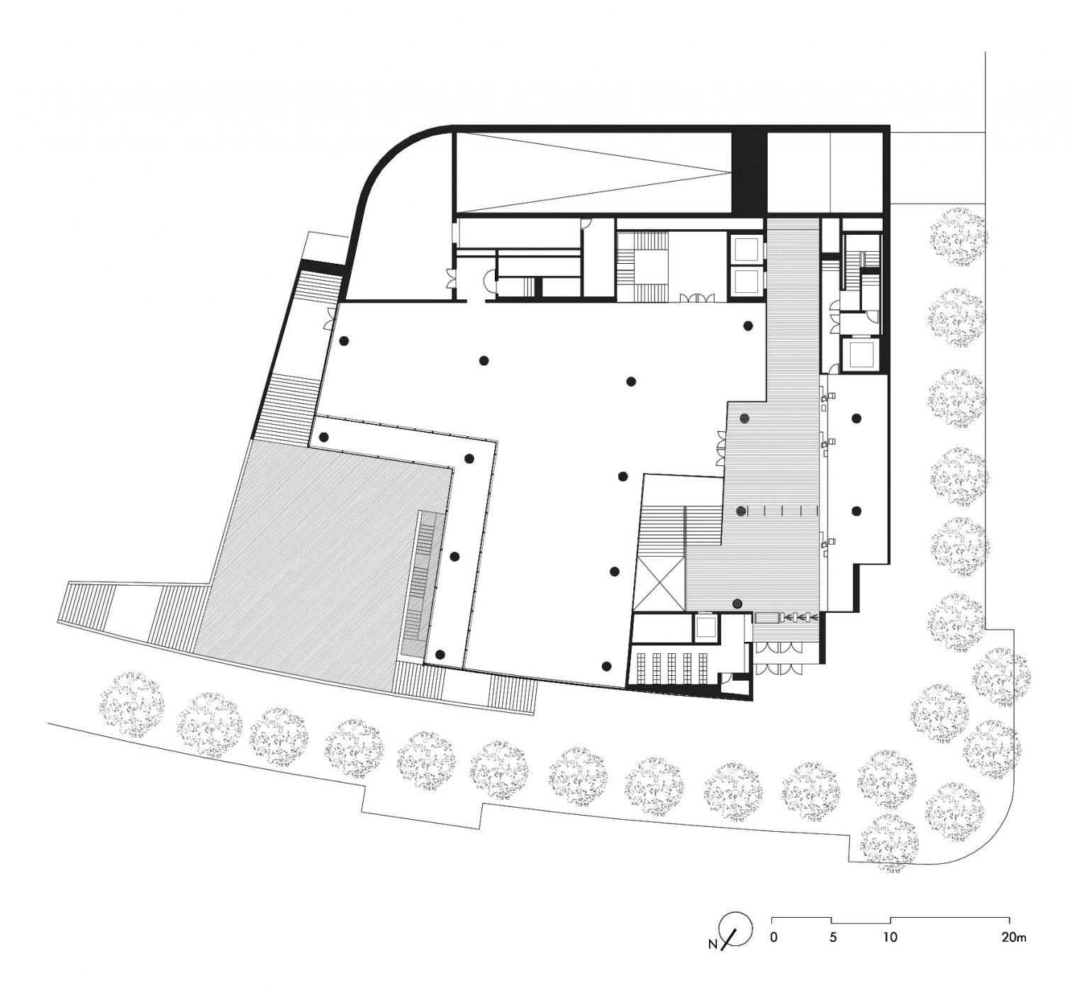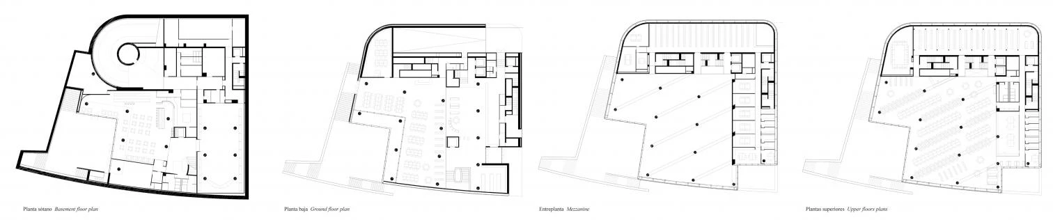 The building is a translucid solid, but the distance it establishes with the Guggenheim is reduced when one observes how much the museum has determined the orientation of the library, which subtly looks towards it, paying courteous tribute when offering its lively volumetry as backdrop in the reading rooms.