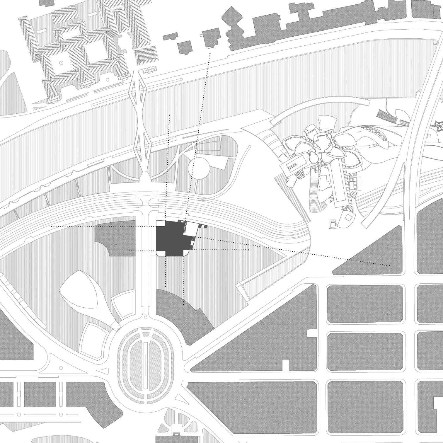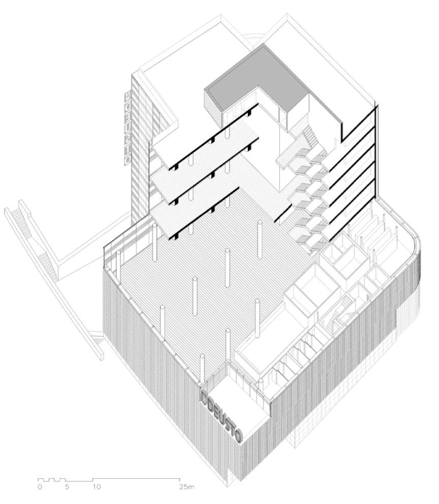 Though the location of the site and the urban configuration may seem propitious, the truth is that the ambivalence between the dimensions of an urban block and those of a free-standing building turn this project into a complex one. If on top of all this we add the imposing presence of the Guggenheim Museum, the difficulties will be more easily understood. On the one hand, the new building should not compete with the well-deserved protagonism of the museum; on the other, it should express its public role and establish the desired continuity with the university. And these two factors were not to keep the building from going up as a separate entity in the park, with a life of its own.