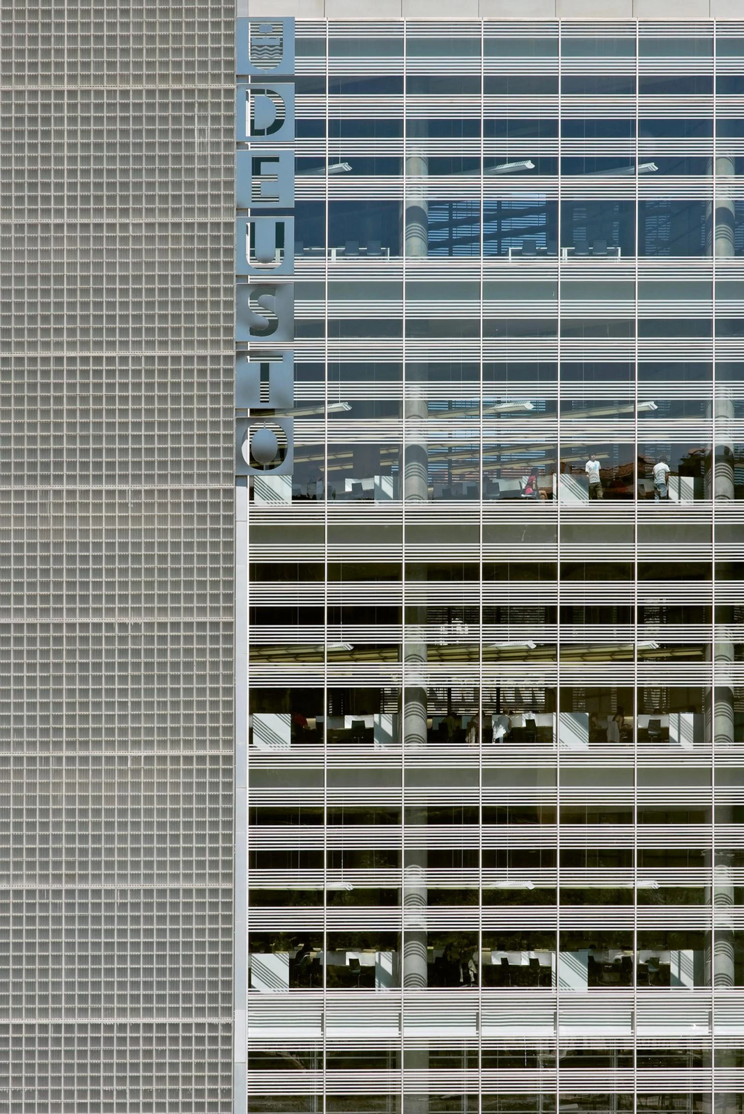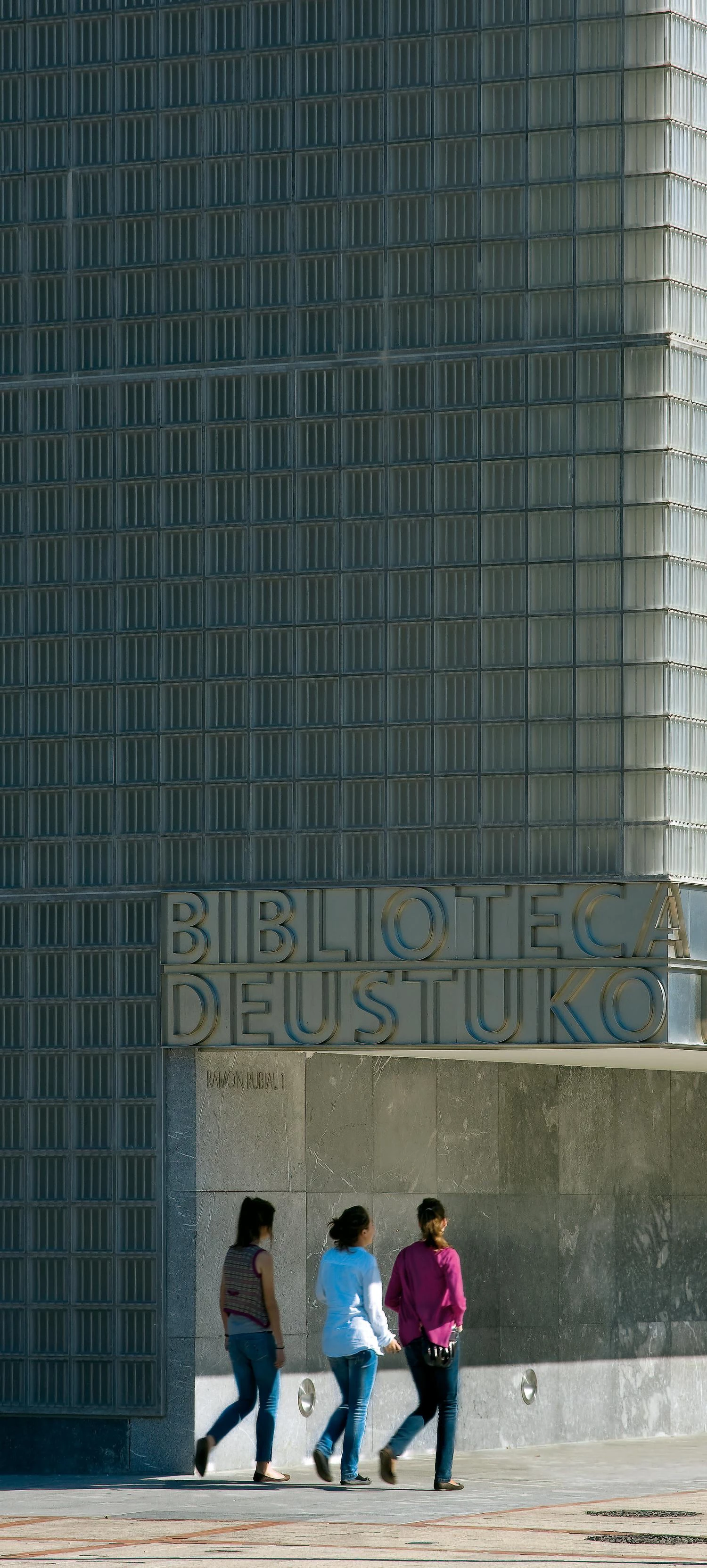 Located on the left bank of the estuary of Bilbao, across from the Guggenheim Museum, the library of Deusto University goes up as a free-standing building with a soft translucent skin of glass blocks.