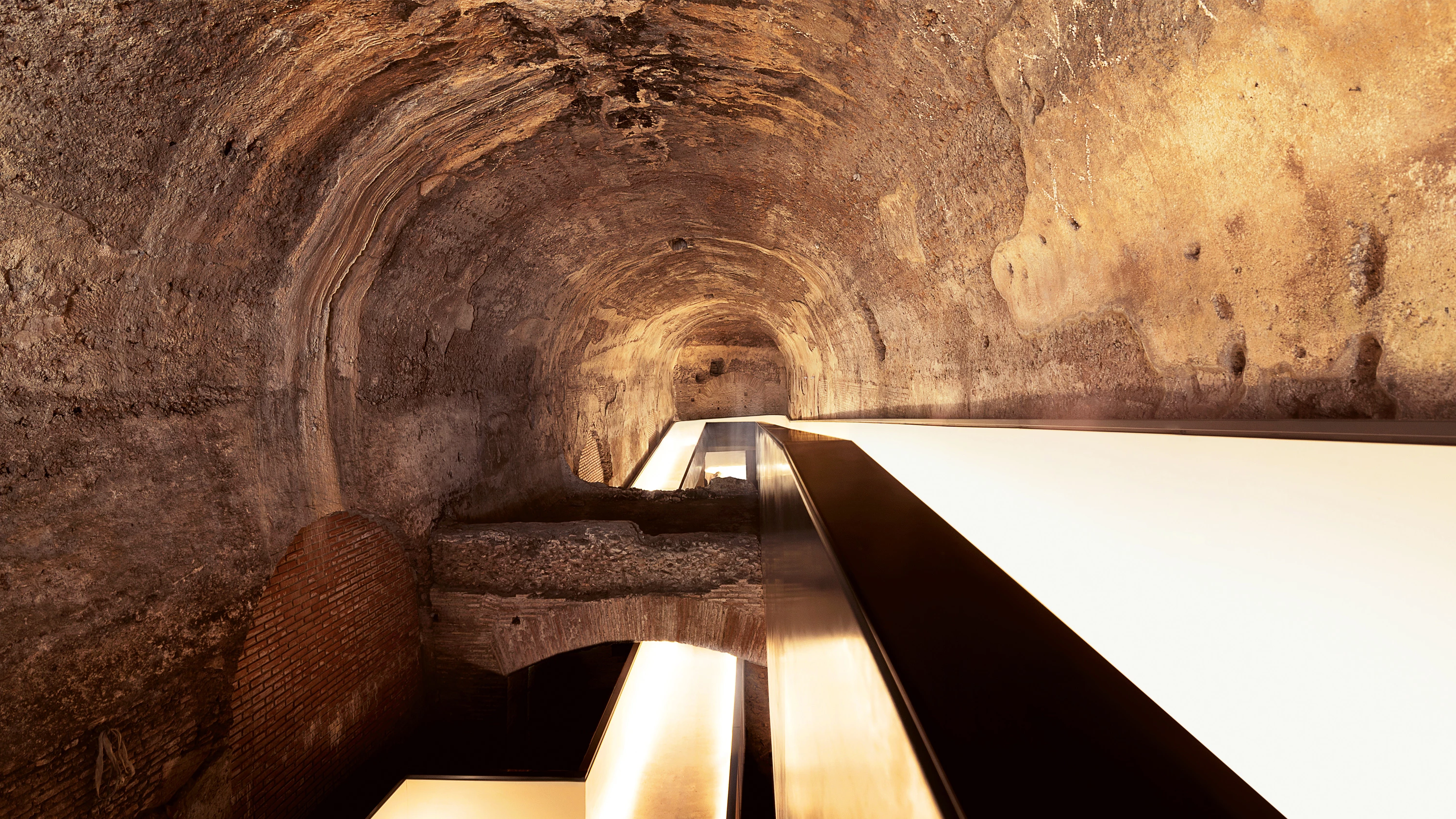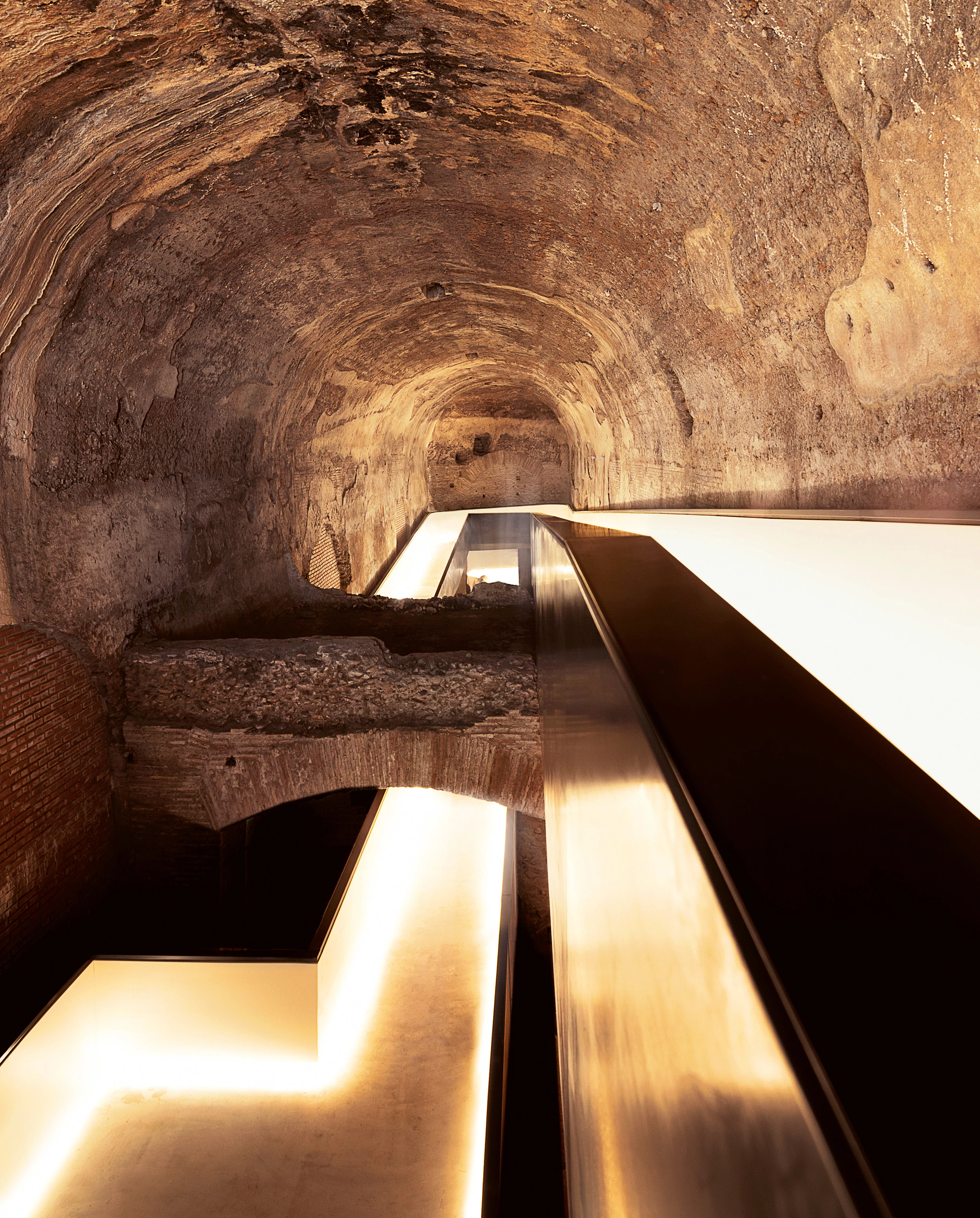 A new entrance leads from the exterior to the Octagonal Room – a rotunda six meters deep, with an oculus above which prefigures the Pantheon – through a walkway of galvanized steel, self-supporting and executed with methods needing no machinery so as not to endanger the gallery’s millenary structure. The result is a gradual descent accompanied by faint lights – integrated into the parapets – that make it possible for visitors to get immersed in the immensity of the grotte, as the great masters did with their torches.