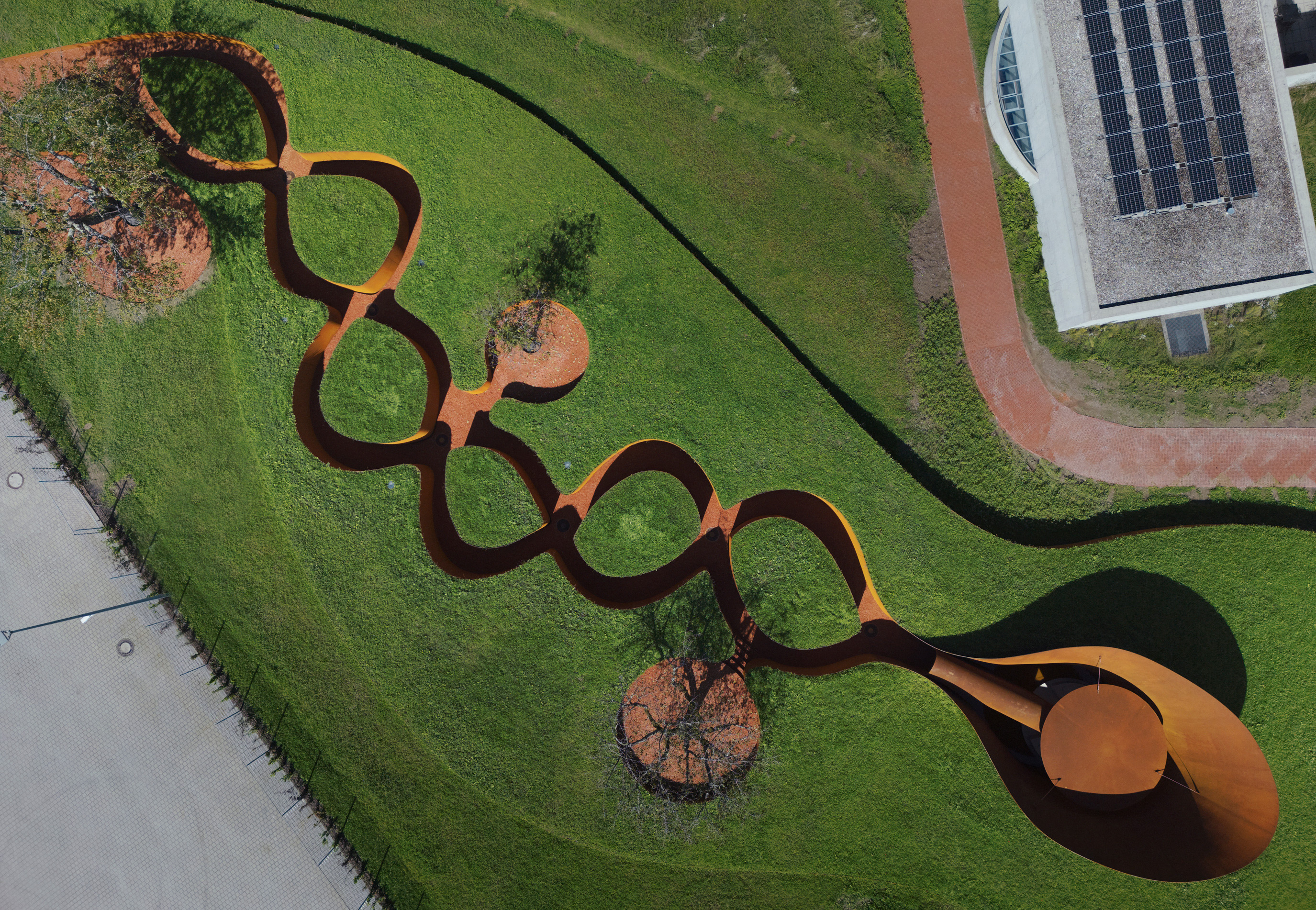 The idea arose when Rolf Fehlbaum, chairman emeritus of Vitra, showed Doshi a photograph of a small shrine in India and had him create a space for contemplation on campus. From that dialogue came a winding path conducive to introspection. Doshi Retreat is organized around two interwoven paths that go underground, crisscross, and lead visitors towards a central pavilion. The sinuous design evolved from a sketch inspired by a dream in which Doshi saw two intertwining cobras. The project draws on Kundalini – a Sanskrit term that refers to primal energy at the base of the spine, conceptualized as a coil or spiral – and completing it is a sound landscape that reinforces the fluidity of its spatial geometry.