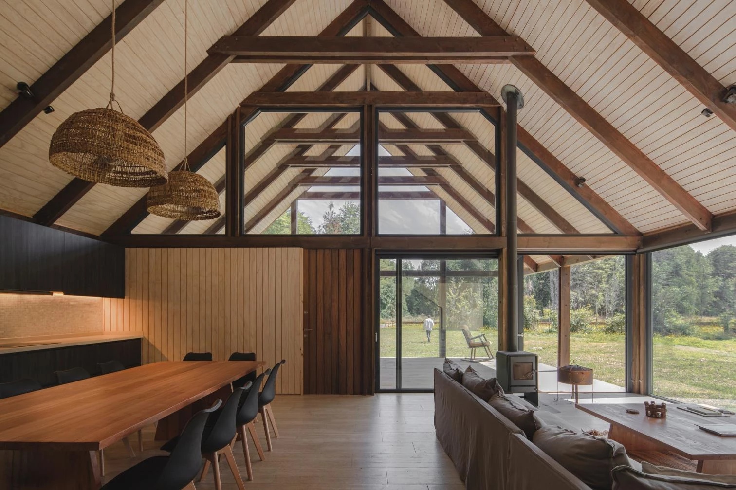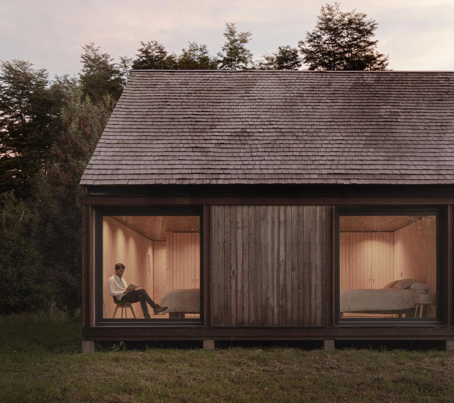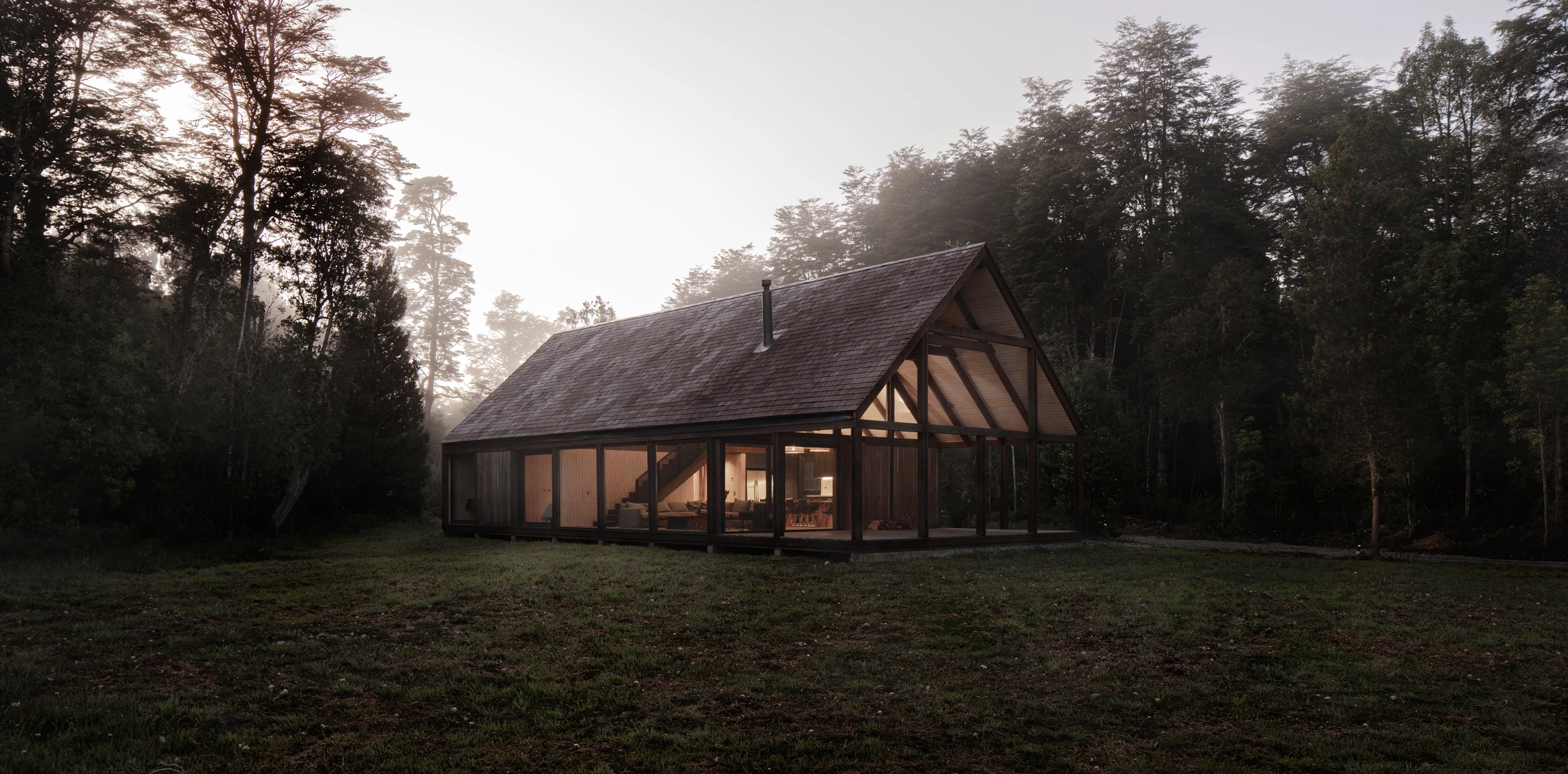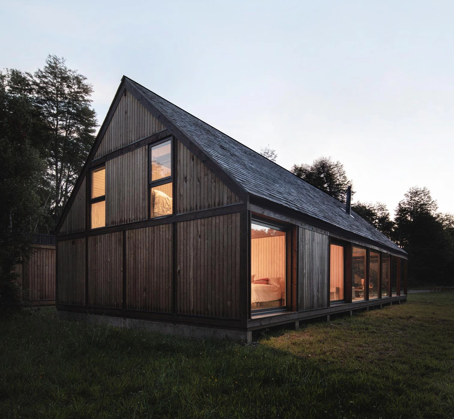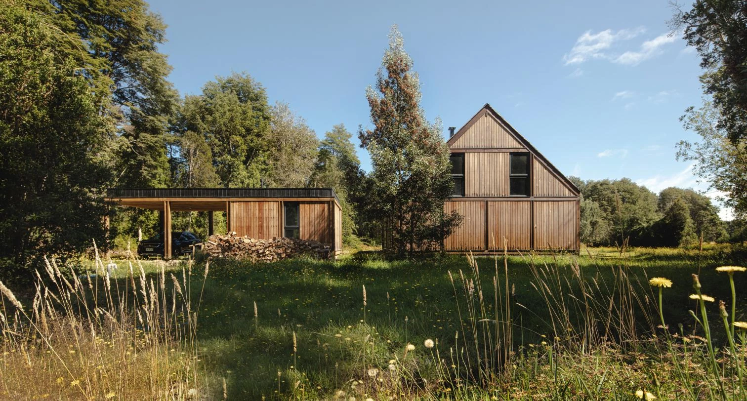 The firm of Juan Pablo Duarte Macaya and Hernán Fournies Aracena was commissioned to build a house in Frutillar, on the banks of Lake Llanquihue in southern Chile. In a region of low temperatures, abundant rain, and lush vegetation, the timber construction recalls the sheds that define the local identity. To maximize natural light and impact less on the landscape, the 230-square-meter house stands on a clearing in the woods. The shared areas take up all the height available, while the bedrooms rise 2.4 meters, following the standard formats of the wooden elements commercialized in the country. The communal spaces and the main bedrooms face north to optimize views and sun, whereas the wet zones are grouped on the south. This layout is reflected on the facades. Translucent materials seal the north, while the south side, opaque, closes up by incorporating solutions for the wet areas.
