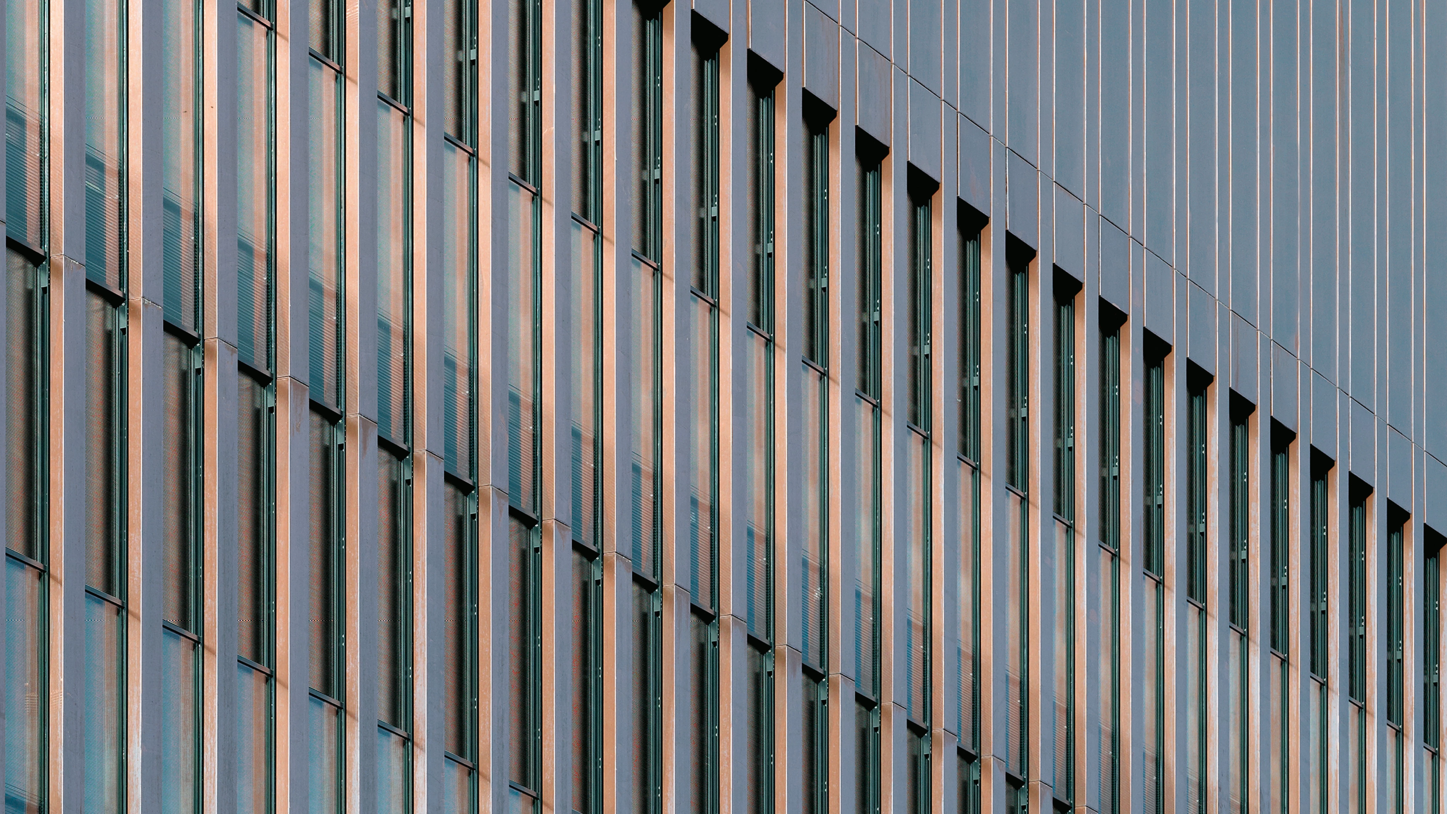 From a constructional point of view, the building’s main point of interest is its ventilated facade, formed by panels of folded copper, 15 millimeters thick, which cover a layer of wool rock insulation 20 centimeters thick and are held up by a metallic subframe anchored to the loadbearing skin.The complex presents varying finishes, with different textures and colors ranging from brownish matte to shiny metal tones, all resulting from the pre-oxidation treatment given to the copper panels.