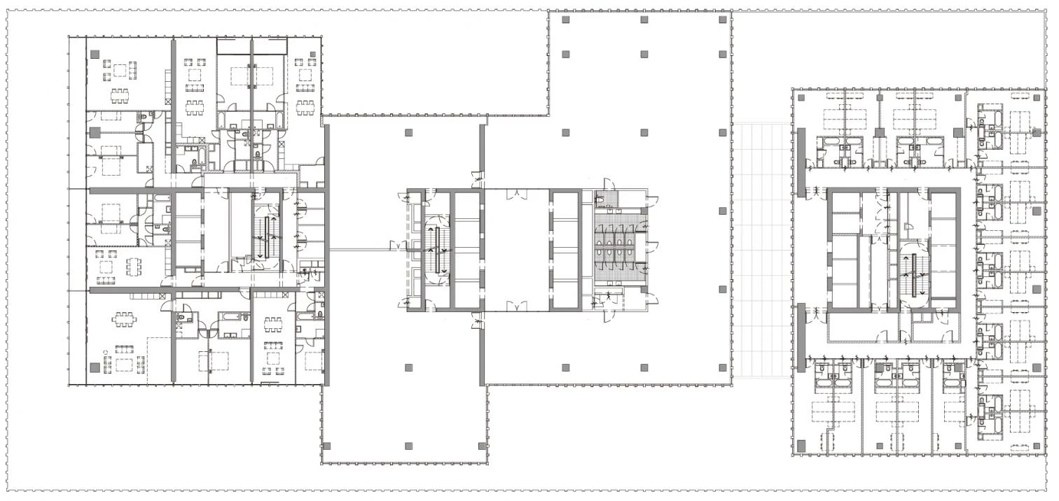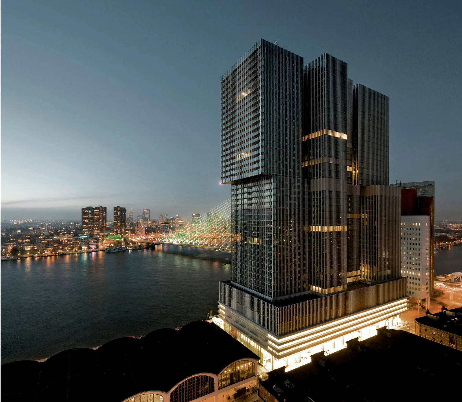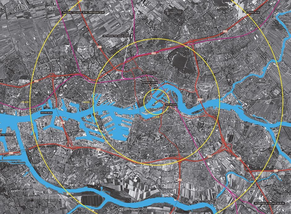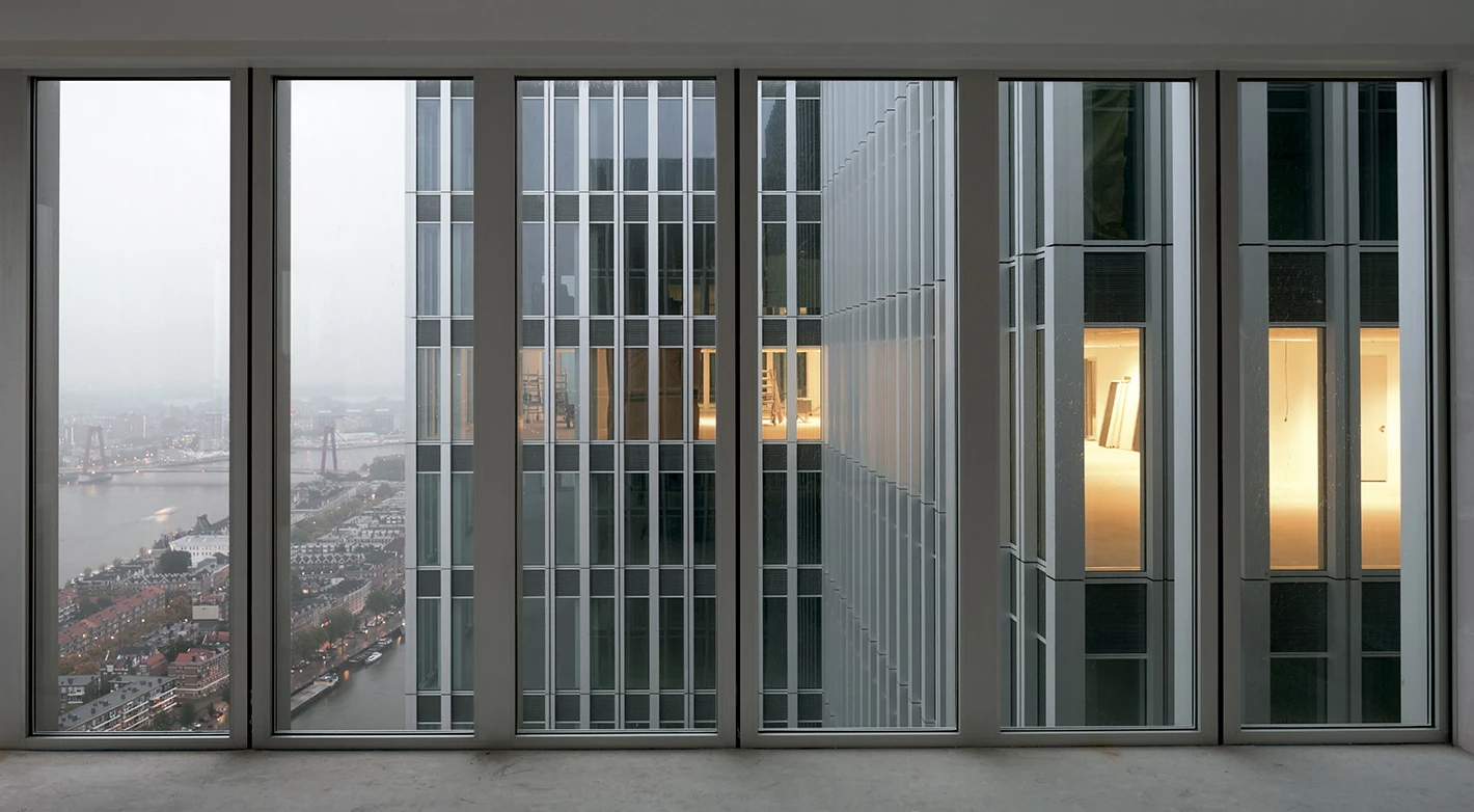 De Rotterdam is conceived as a vertical city: three interconnected mixed-use towers accommodating offices, apartments, a hotel, conference facilities, shops, restaurants, and cafes. The towers are part of the ongoing redevelopment of the old harbor district of Wilhelminapier, and aim to reinstate the vibrant urban activity once familiar to the neighborhood. The three towers reach 150 meters high, with a gross floor area of approximately 162,000 m², making De Rotterdam the largest building in the Netherlands. However, more than sheer size, urban density and diversity – both in the program and the form – are the guiding principles of the project. De Rotterdam’s stacked towers are arranged in a subtly irregular cluster that produces intriguing new views from different perspectives. The various programs are organized into distinct blocks, providing both clarity and synergy: residents and office workers alike can use the fitness facilities, restaurants, and conference rooms of the hotel. And these private users of the building have contact with the general public on the ground floor, with its waterfront cafés. The lobbies for the offices, hotel, and apartments are located in the plinth – a long elevated hall that serves as a traffic hub for a wide variety of users.