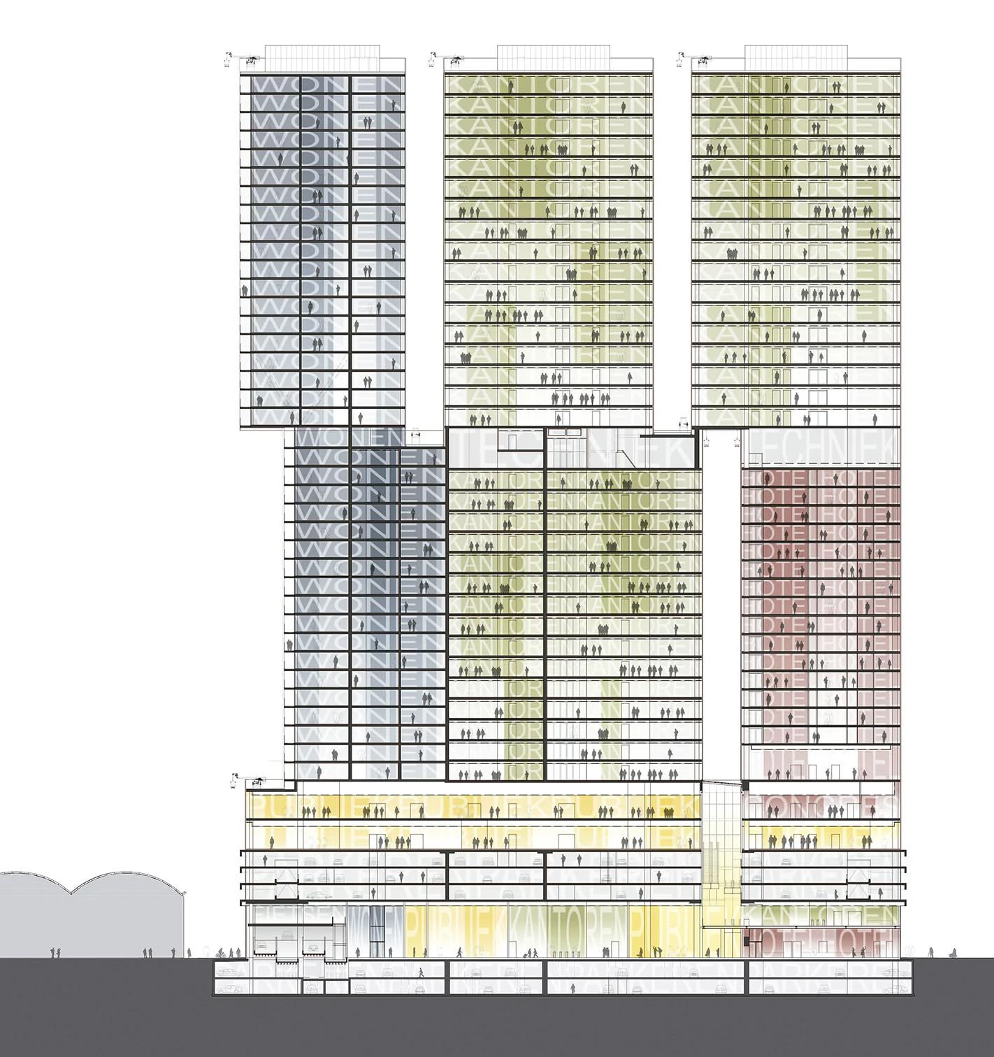 Building code consultant: ABT Bouwkunde, Velp / Delft. Structural engineer: Corsmit, Rotterdam. Structural advisor in SD phase: Arup, London. Service engineers: Techniplan, Rotterdam (offices, hotel) / Valstar Simonis, Rijswijk (apartments, plinth). Facades: Permasteelisa, Middelburg (offices, hotel, plinth) / TGM, Asten (apartments). Fire safety / building physics: DGMR. Lighting consultant ground floor / atrium: Arup. Scenography / lighting consultants hotel: Ducks Scéno / Les Eclaireurs