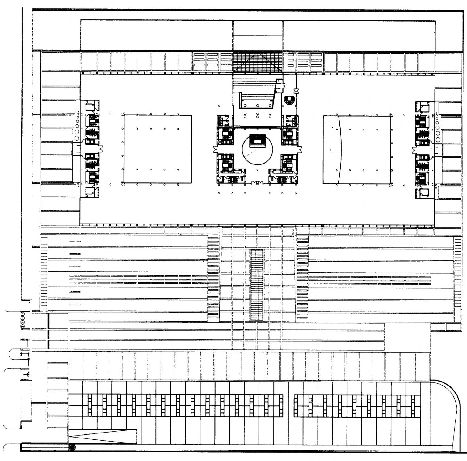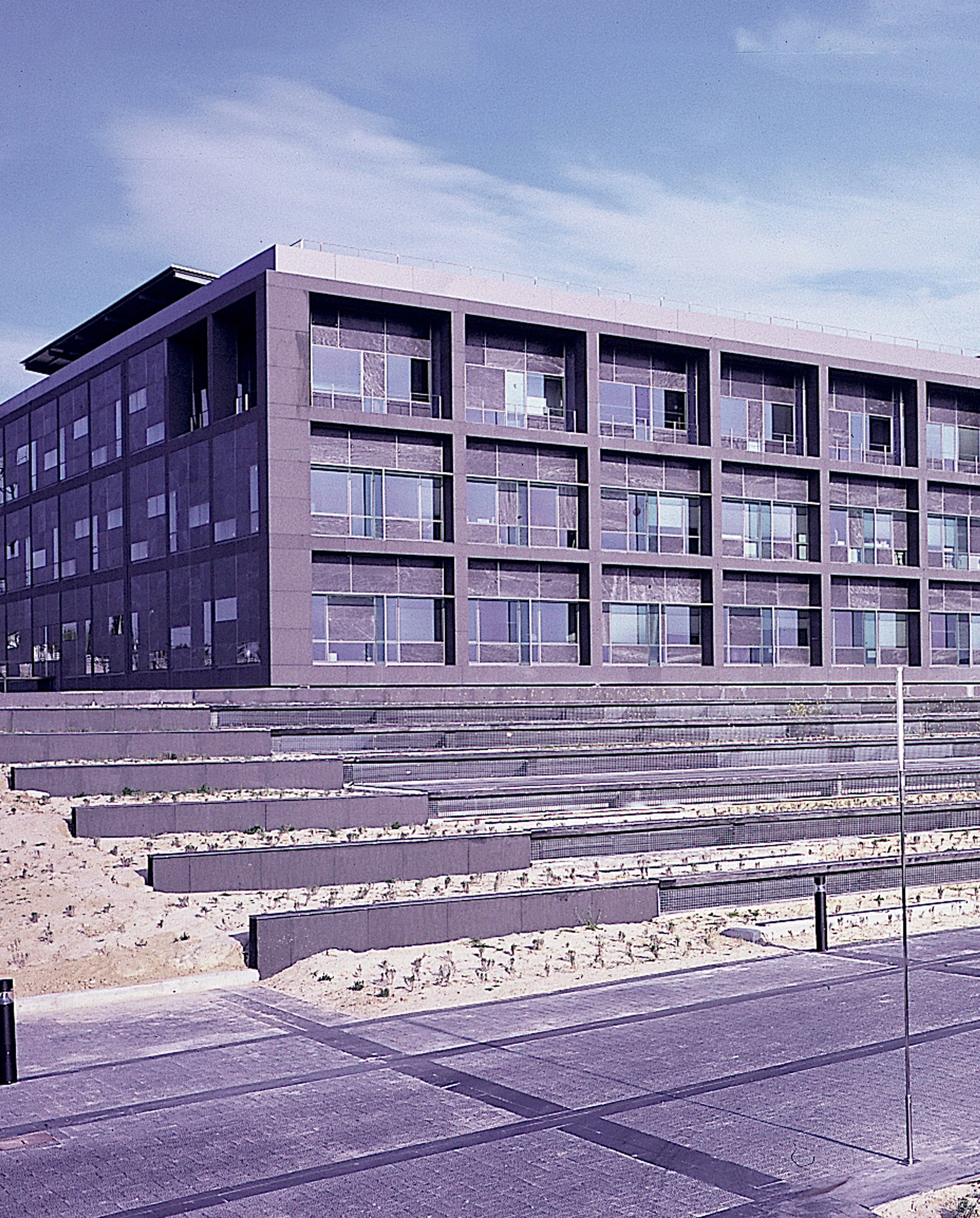 Seated on the stepped base of a parking lot, this impressive, black parallelepiped of 140 by 60meters houses a bank computing center. The structural grid of the building applies also to the facade composition, the edges being cladded with singed African granite. Moreover, the intermediary panels are formed of pre-fabricated steel, glass and black slate modules which function together as a curtain-wall, recessed in respect to the granitic grid of the longitudinal facades. The walls of the interior patios are continuous glass surfaces, and the roof is a horizontal plane whose floating, paved surface creates a thermal buffer. In order to counteract such gray, geometric rigor, the interior shows compositional variations in rhythm, texture and color, and incorporates circular forms in the void of the vestibule and in the light fixtures.
