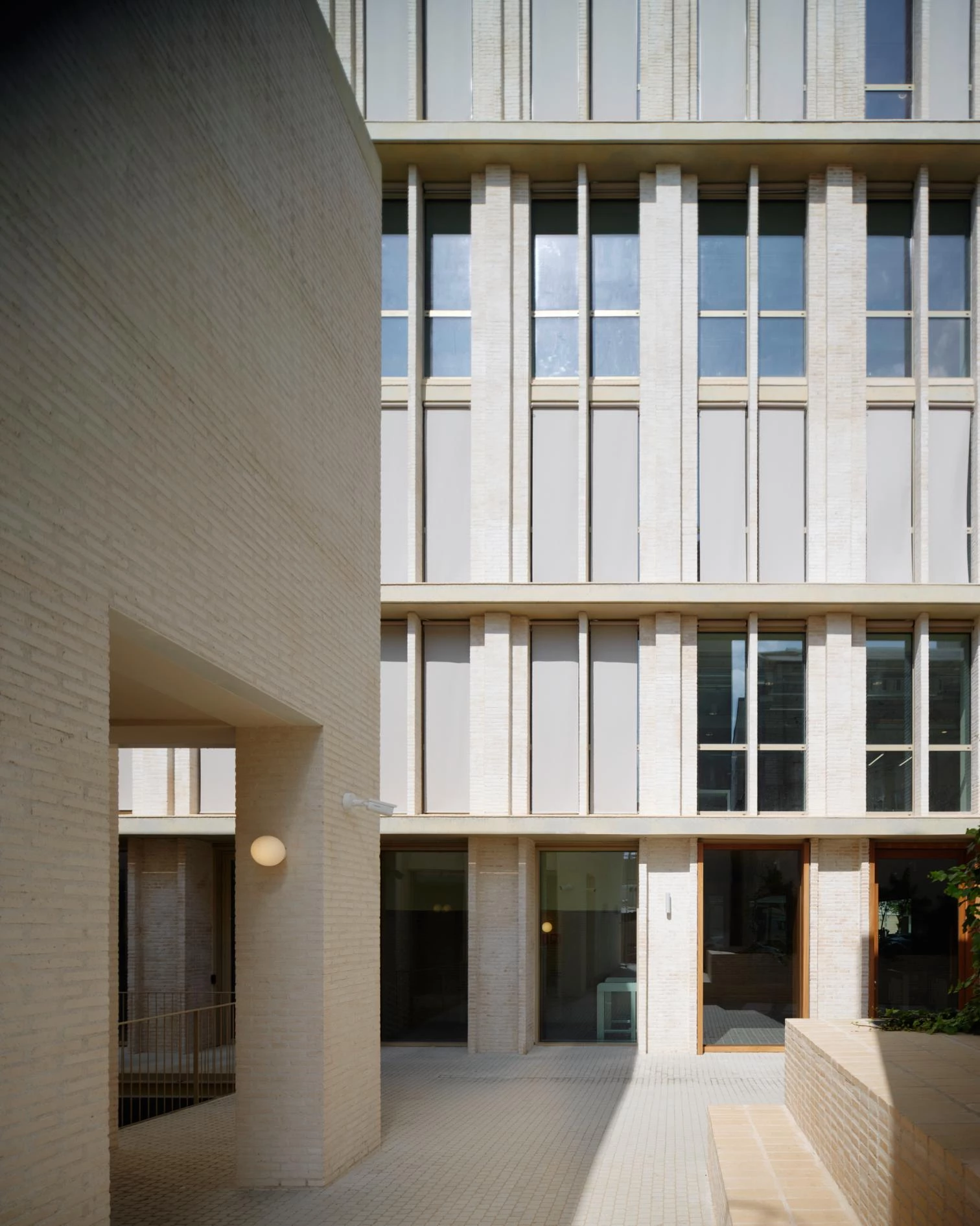 Located at Carrer de Pallars 180, in Barcelona’s Poblenou neighborhood, the project sought to give the block a sense of continuity and engage with preexisting elements. A work of BAAS, a Catalan firm led by Jordi Badía, the office building presents a morphology of traditional architecture, combining materials, colors, and textures that connect with its historical industrial context, but in a contemporary language. The Eixample’s typical diagonal corner, which in Poblenou has been gradually disappearing, was maintained. One enters the building through this chamfer.
