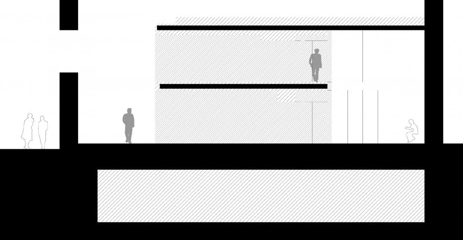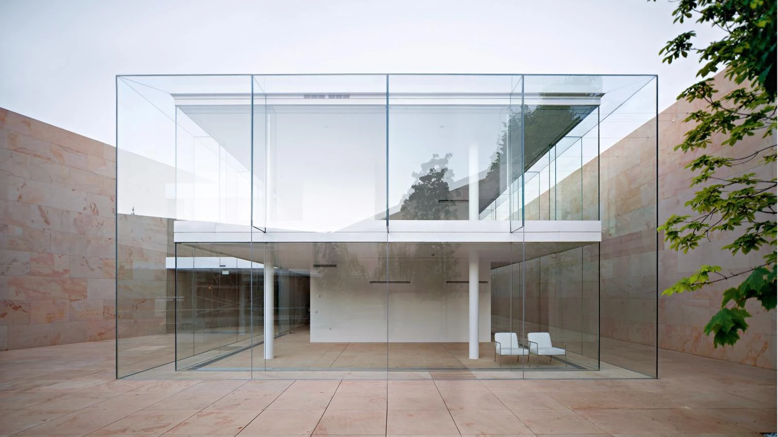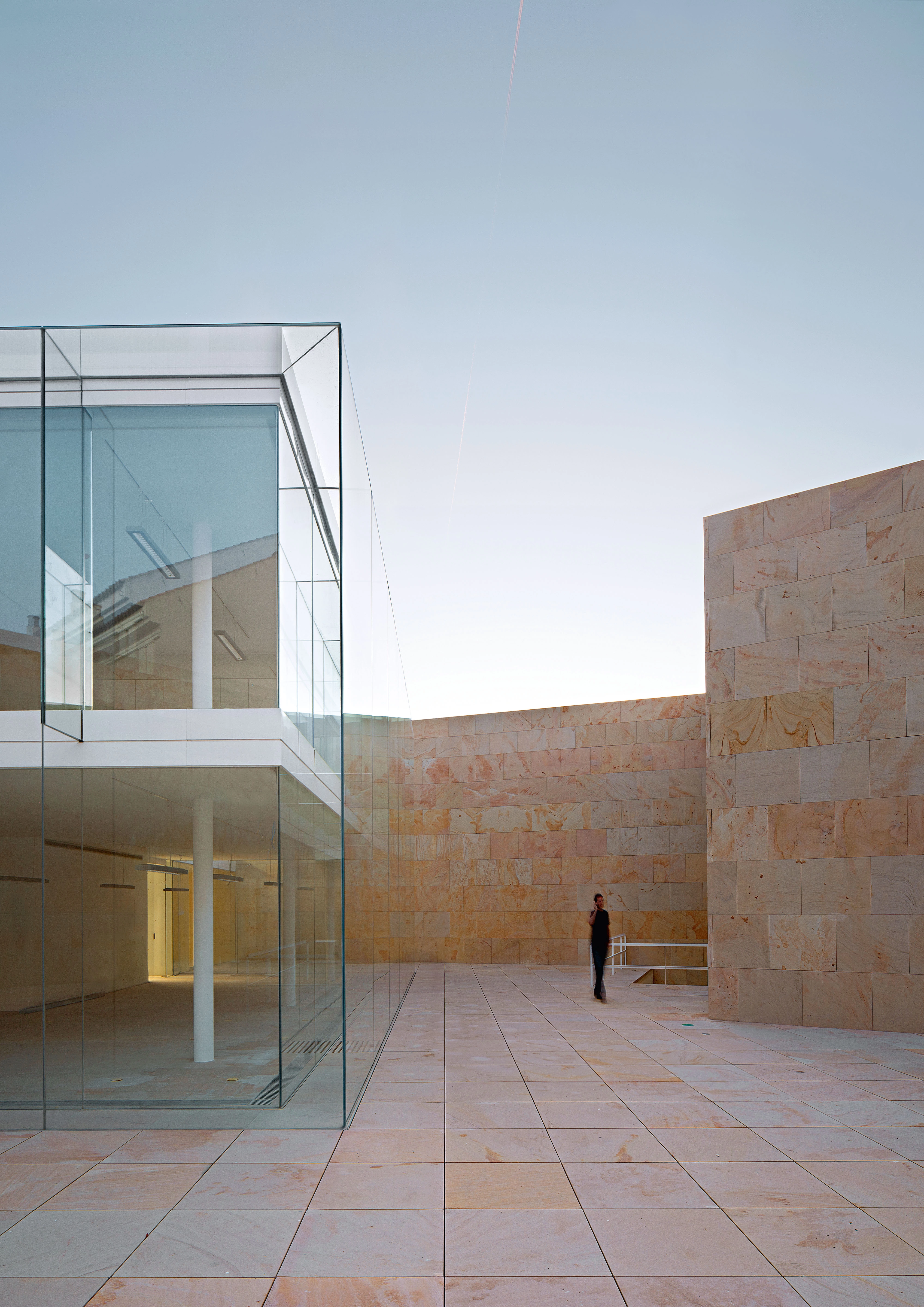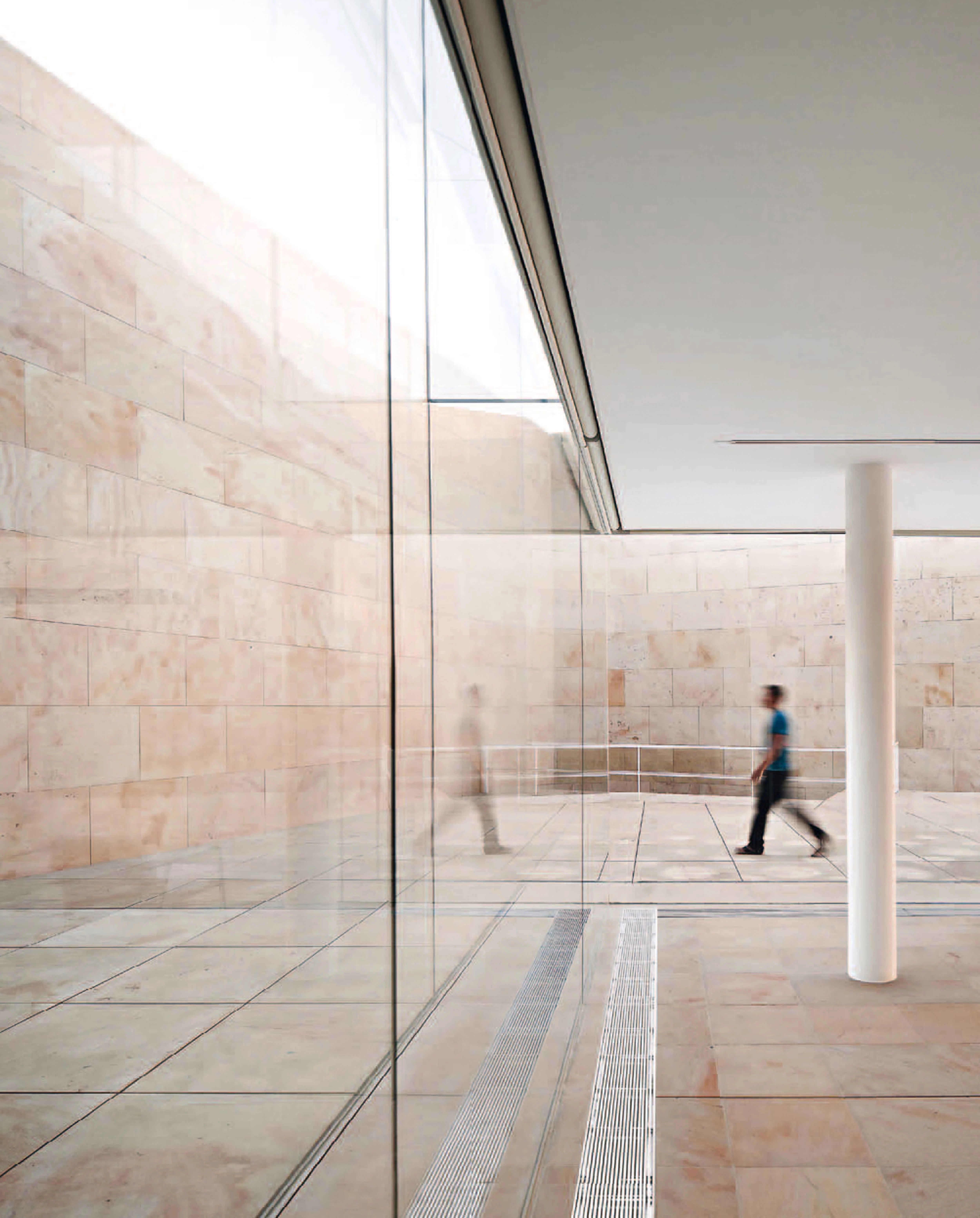 Within the perimeter of the stone box, the glass box is configured as a double facade that takes on an active role controlling temperature throughout the year. The outer glass is built with sheets measuring 6x3 meters.