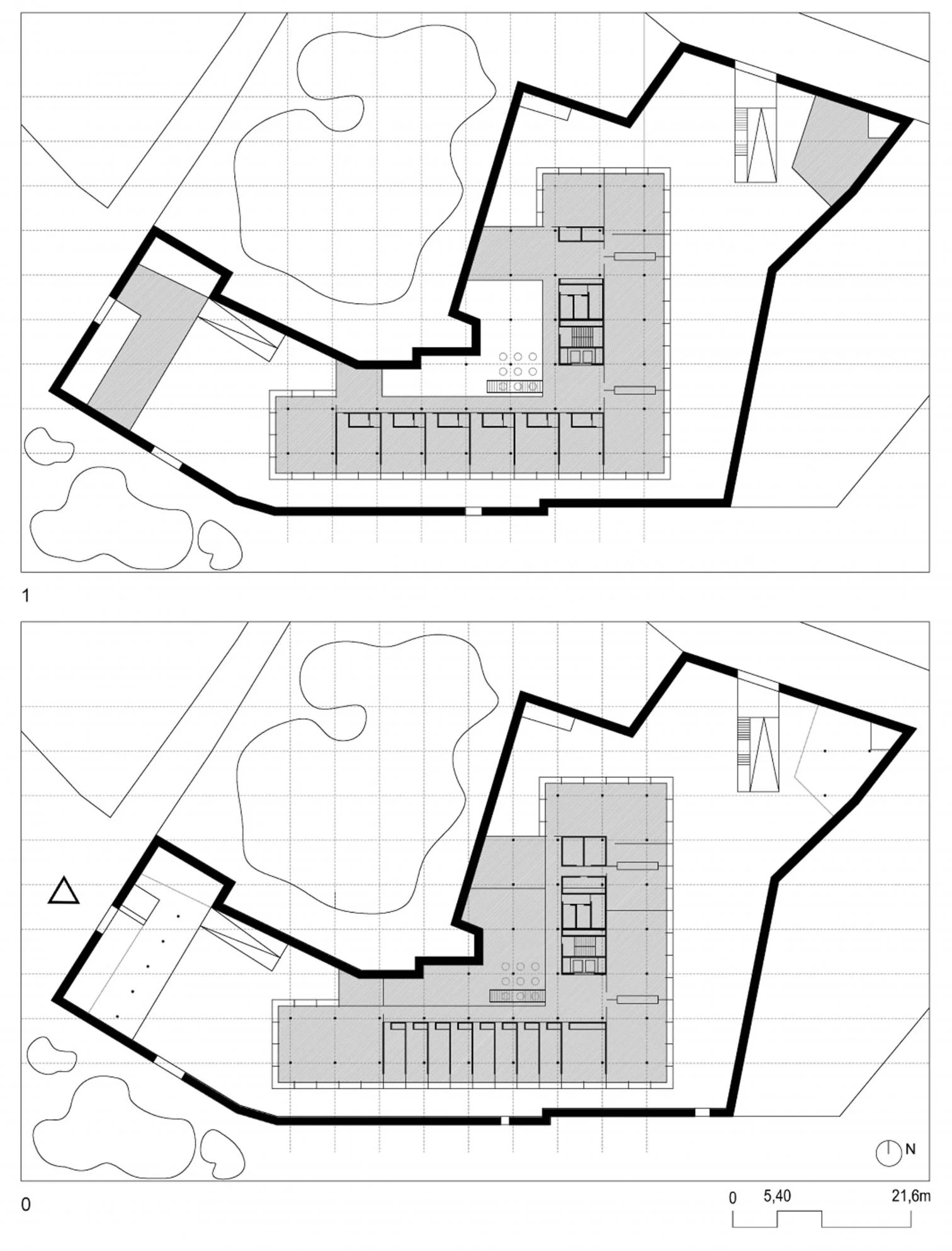 The building’s program adapts well to this layout, giving the advisory board staff a quiet space for work as well as the security needed, with a strict control of both views and access. Since the stone walls guarantee security, the building’s facade can be entirely transparent, allowing the interior spaces to open up to the garden around them. The perimeter wall transforms the plot into a large stone box, closed to the surrounding views but open to the sky and dotted with several trees to create an introverted garden presided by a modern building.
