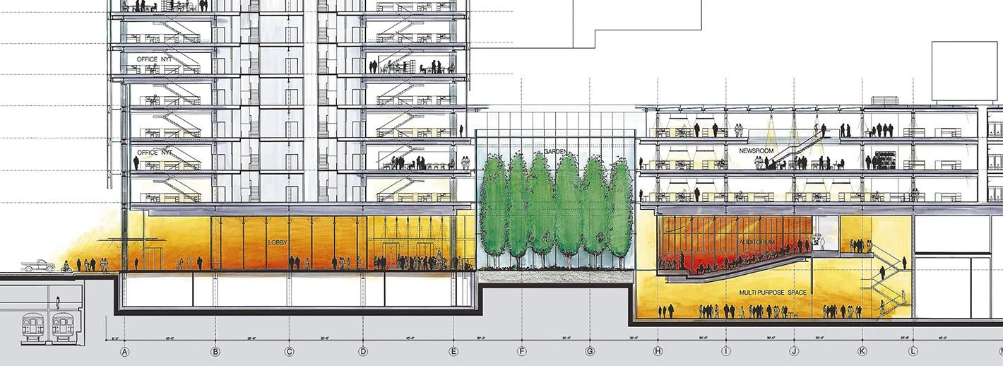 The building’s basic shape is simple and primary, and relates to the Manhattan grid of streets. Occupying nearly half a block between West 40th and 41st streets, the slender, cruciform tower meets the ground at 8th Avenue. Floors zero to four step out behind the tower to fill the plot with a four-storey podium. Wrapped around a courtyard garden, this lower section of the building is the newspaper’s newsroom, nicknamed ‘the Bakery’ because the journalists work all night here preparing the next day’s paper.
