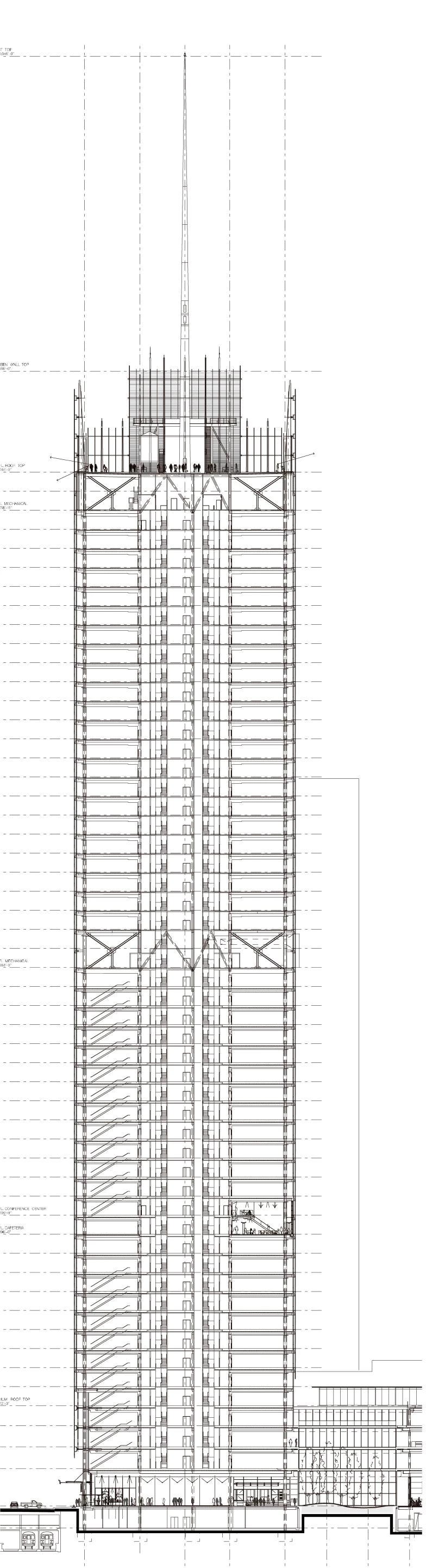 The facade extends vertically 32 meters beyond the top of the building. Here the rods are more widely spaced so that the ceramic screen appears to fade out as it rises. The building is topped with a 91-meter mast.