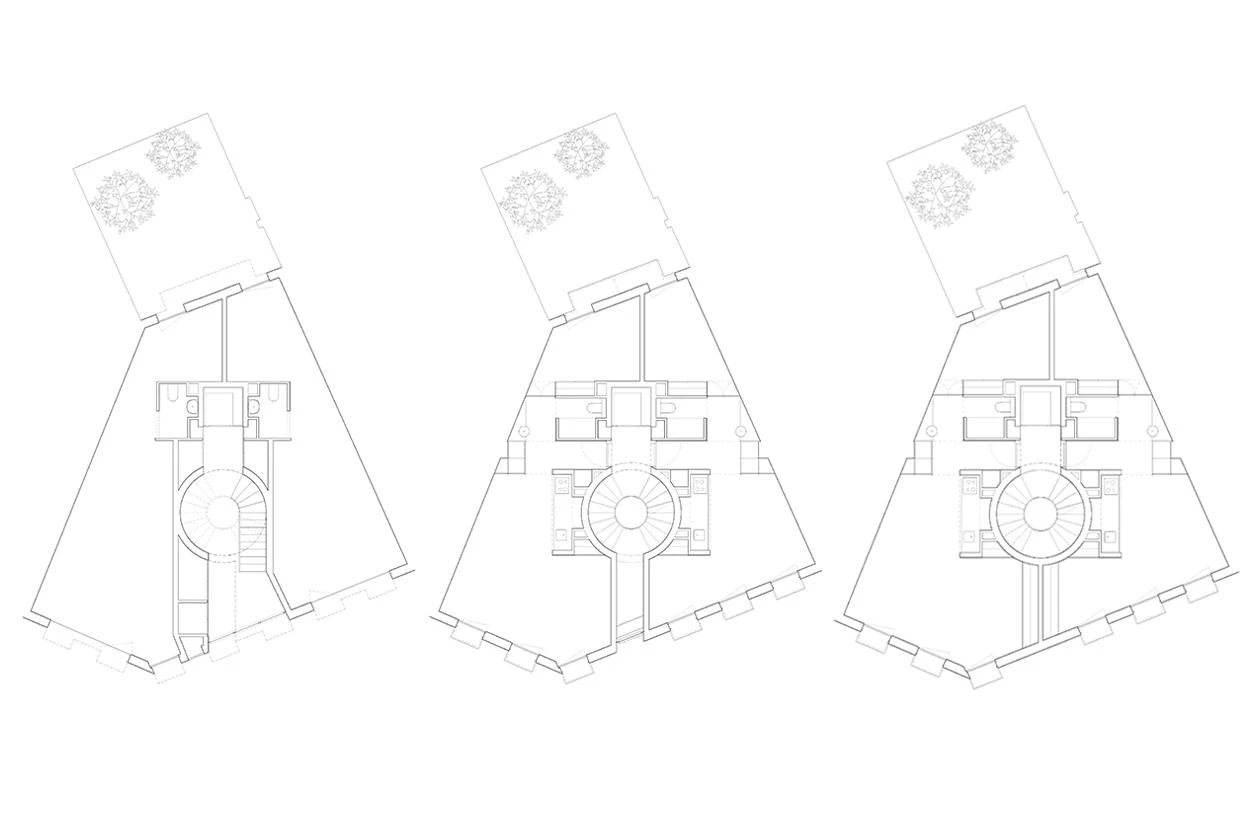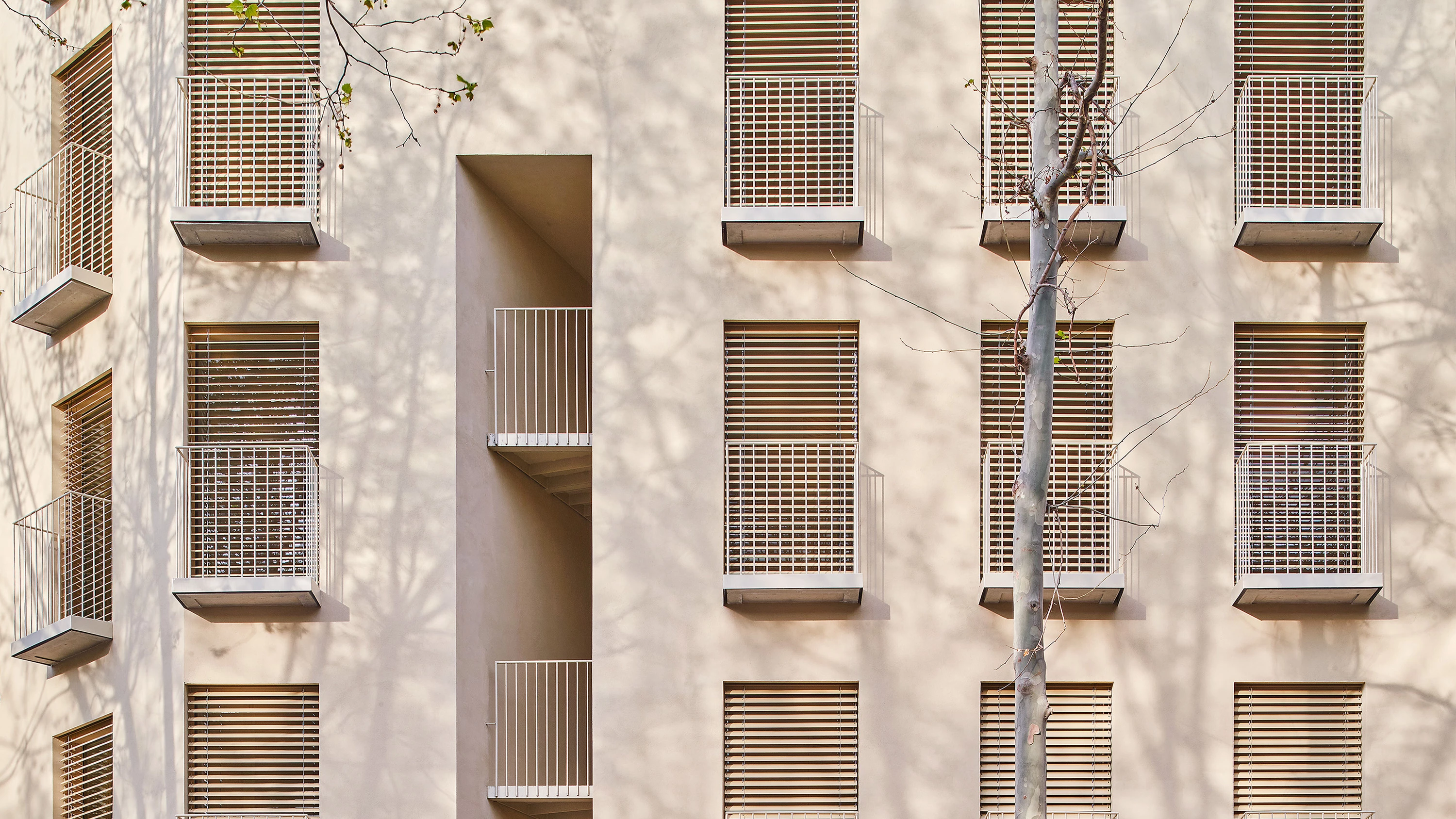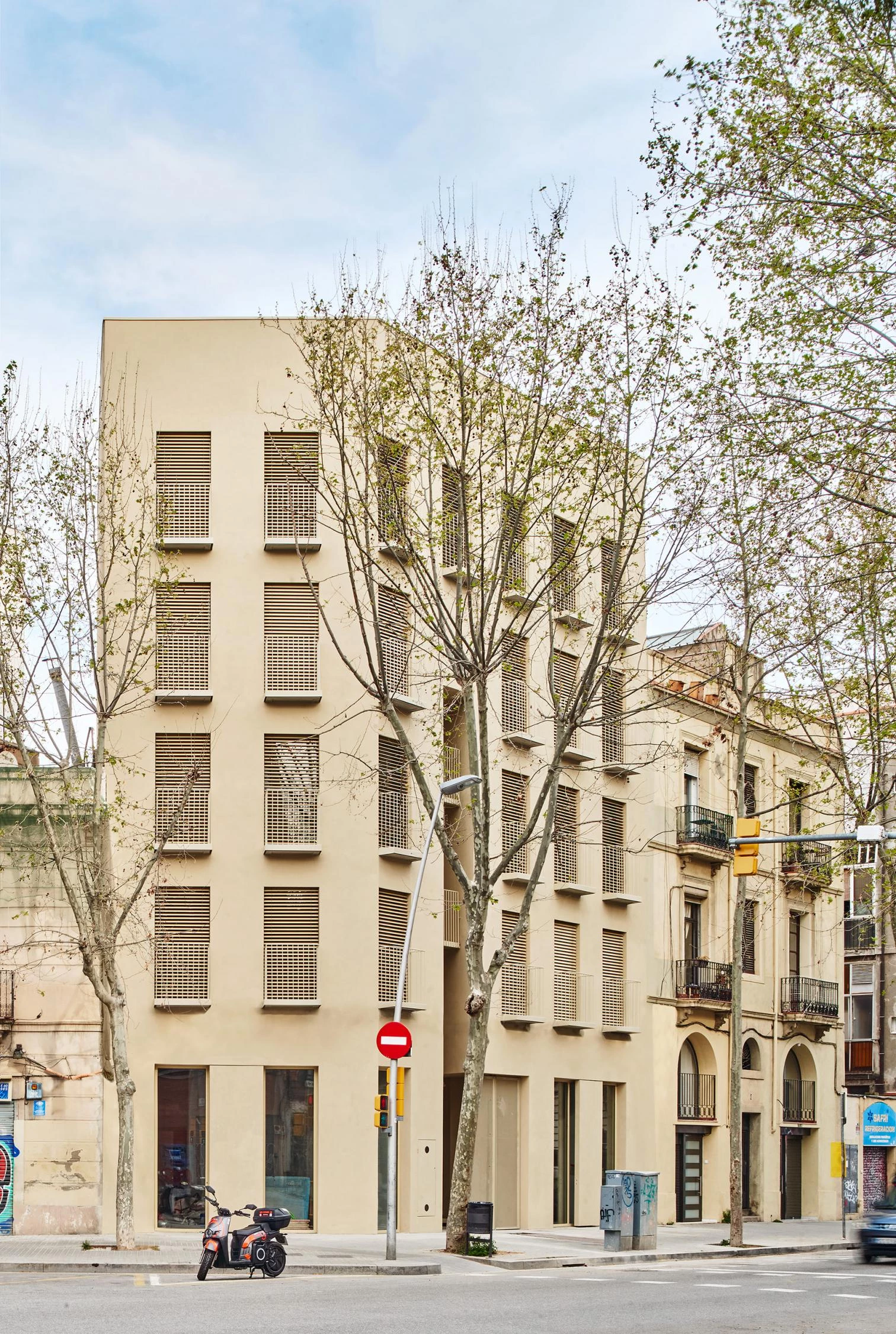 This building containing five apartments and two commercial units stands at an irregularly shaped corner lot in Barcelona’s Poblenou neighborhood, discreetly complementing a block of the Eixample. Inducing natural lighting and ventilation, the cylindrical core for circulation elements and MEP services is placed at the center, freeing up the perimeter and allowing two floor-through flats on the second and third stories. The attic is a single dwelling laid out in a circle around the core.