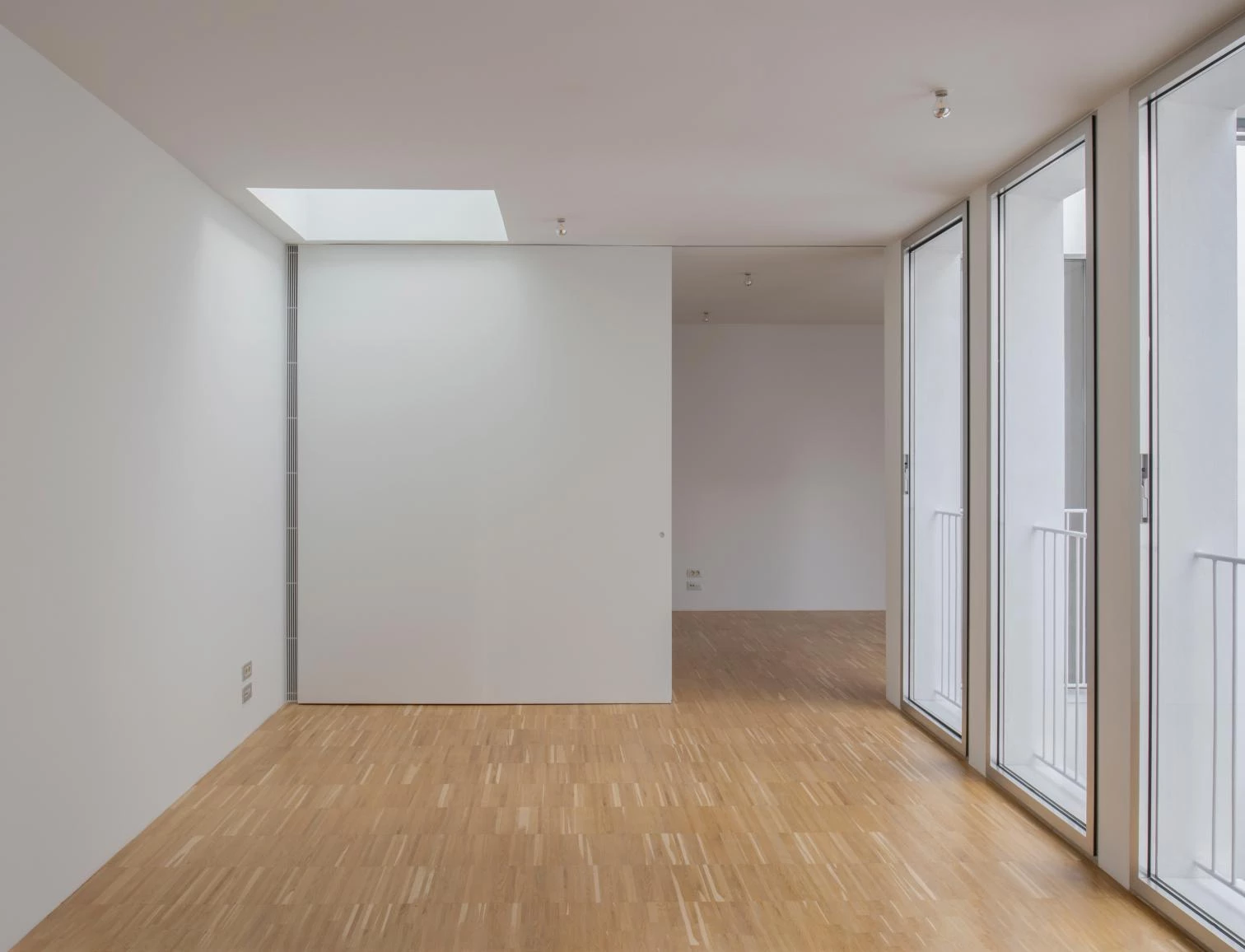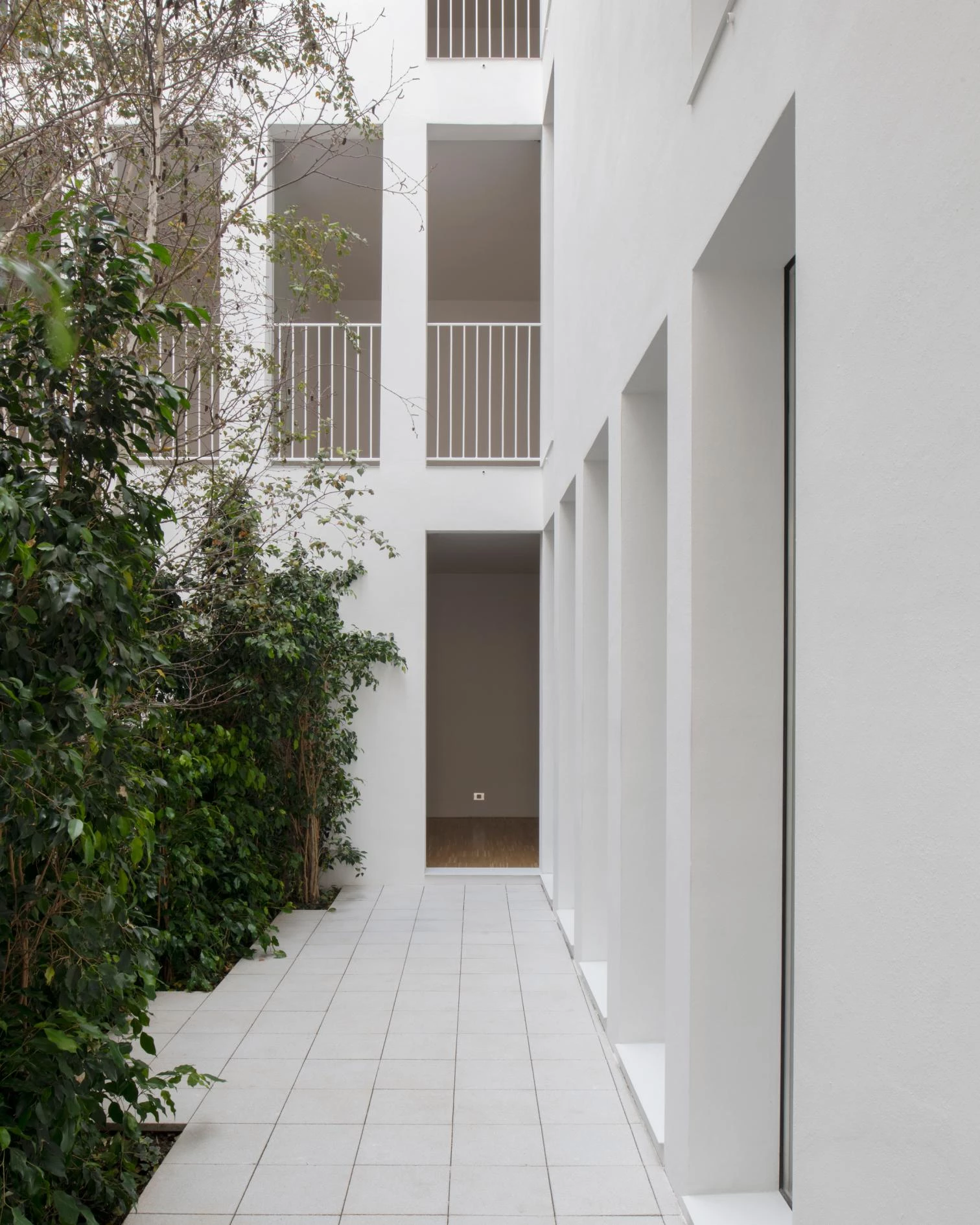 The Barcelona firm Arquitectura-G – headed by Jonathan Arnabat, Jordi Ayala-Bril, Aitor Fuentes, and Igor Urdampilleta – designed this 1,000-square-meter block containing four flats and two duplexes. Carrer Praga bends toward the interior of the plot, forming a courtyard with plants onto which balconies at different altitudes open. The gesture results in a building that has no rear, but instead an urban exterior that brightens up and airs all the units. The circulation core is a small tower that generates interferences enriching the residential typologies, prioritizing use flexibility by means of movable dividers.