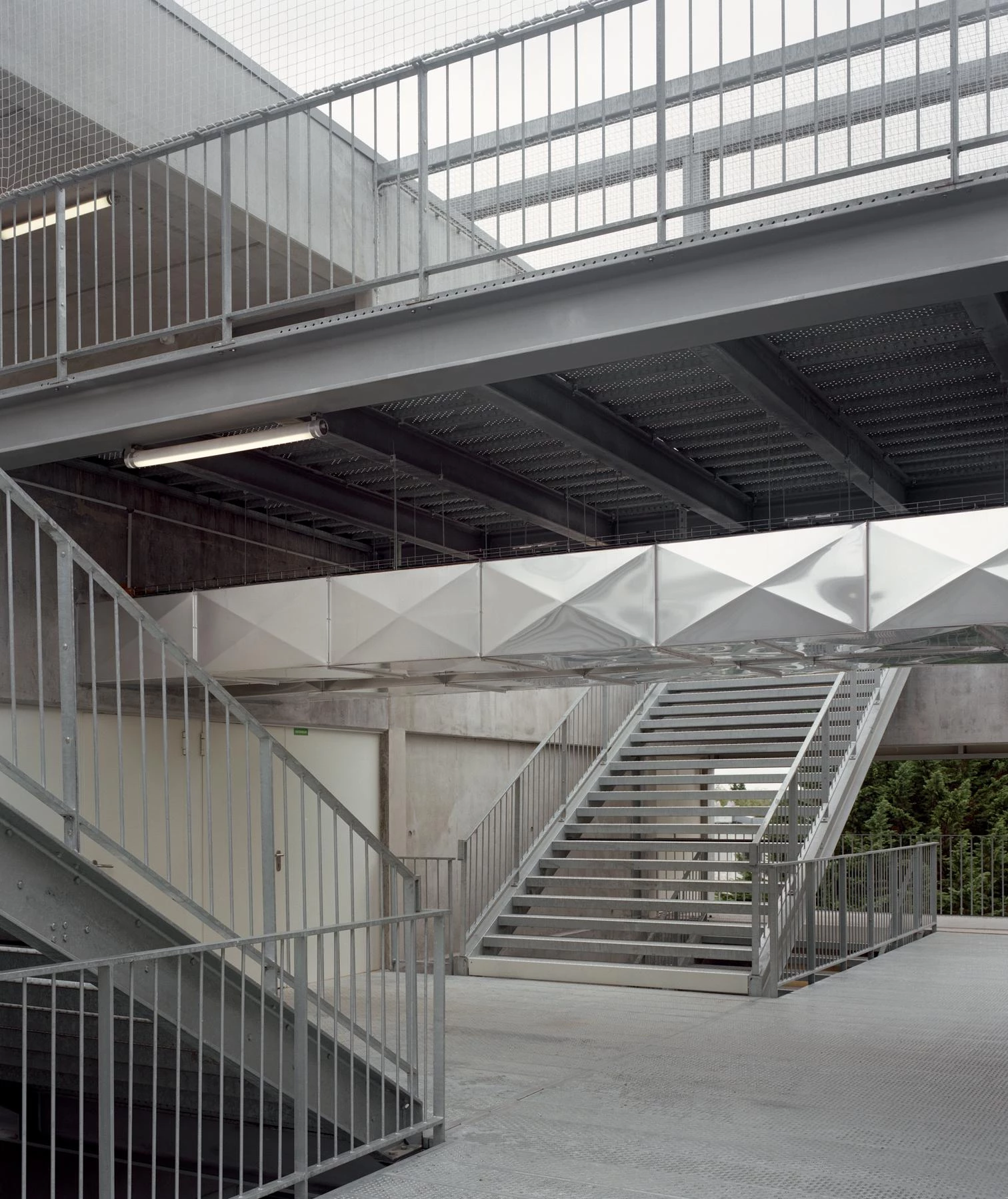 Auxiliary services and recreation amenities are stacked within a distinctive structure that provides users of the outlying Saclay campus with a new space for meetings and activities.
