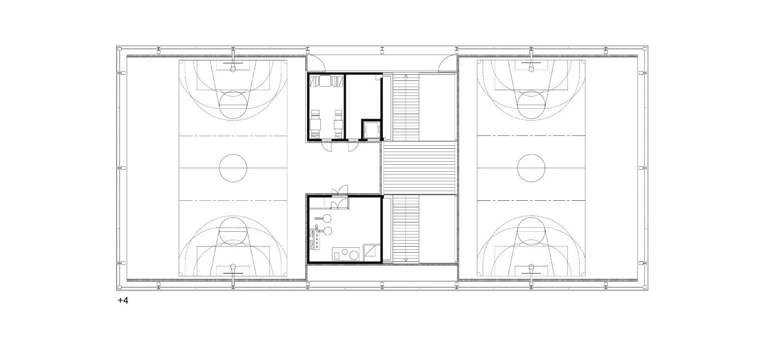 The different programs are organized floor by floor, from the public square up to the rooftop sport courts, with an open double staircase giving independent access to each level on an all-day basis.