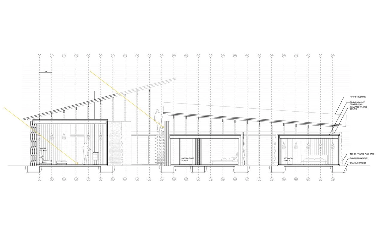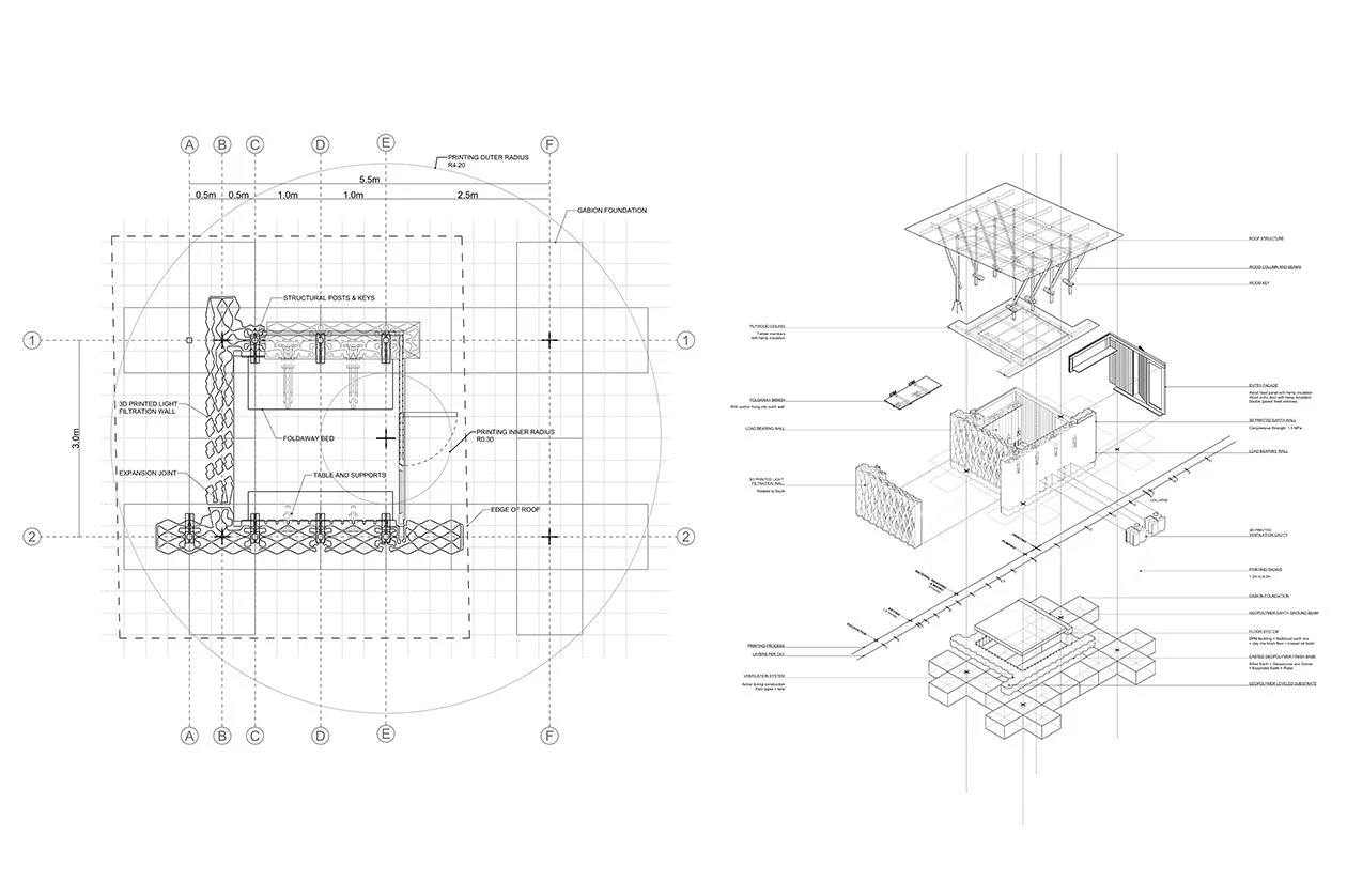 The building process generated zero waste because it used local earth, mixed with additives and enzymes to ensure the structural integrity and the elasticity needed to optimize large-scale 3D printing. The foundation is made of geopolymer and the roof is a timber construction. A waterproof coating using materials like aloe and egg whites contributes to durability. The walls are made of a network of cavities that insulate and contain air flow, preventing heat loss in winter and providing protection against solar radiation in summer. The possible applications of this model include homes and temporary lodging during emergency and other humanitarian crises.