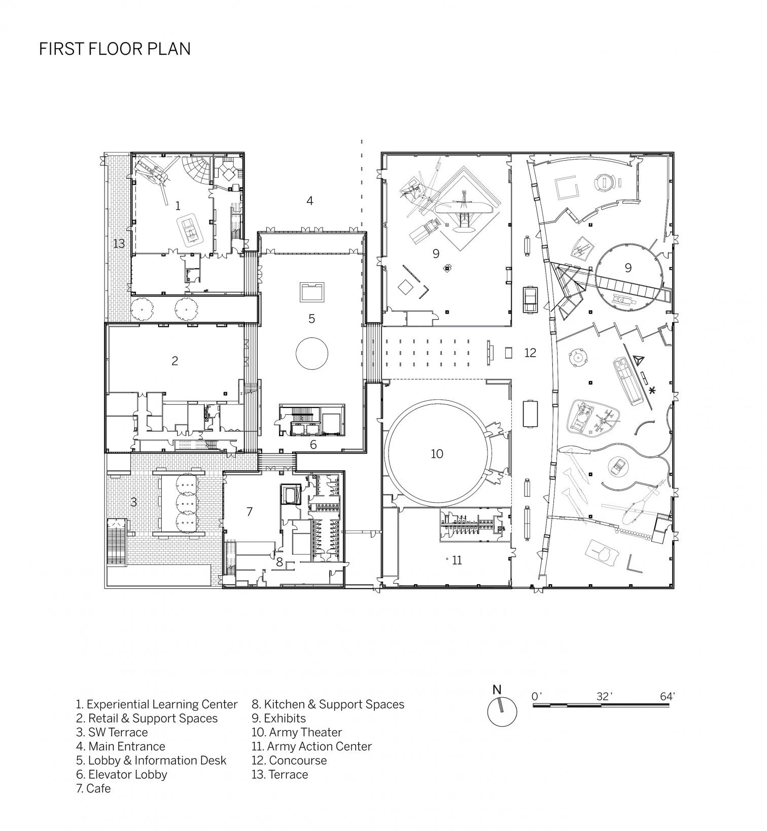 The ground level of the three-floor museum features shops, a café, some exhibition spaces, a theater, and a terrace. A wide wooden staircase in the lobby leads to the mezzanine, where there are additional exhibition spaces. The Veterans’ Hall on the second floor is lined in wood, forming part of a natural material palette that includes stone, American white oak, and ash. It connects with the Medal of Honor Garden.