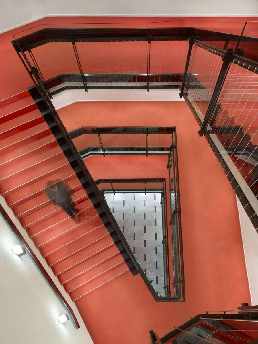On the other hand, the new building containing the library and the concert hall – which can seat 1,800 – engages in dialogue with the preexisting construction without imitating its forms nor radically lording over it. Instead, special attention has gone to details like color, materials, and geometry, with red maintained as the institution’s leitmotif.