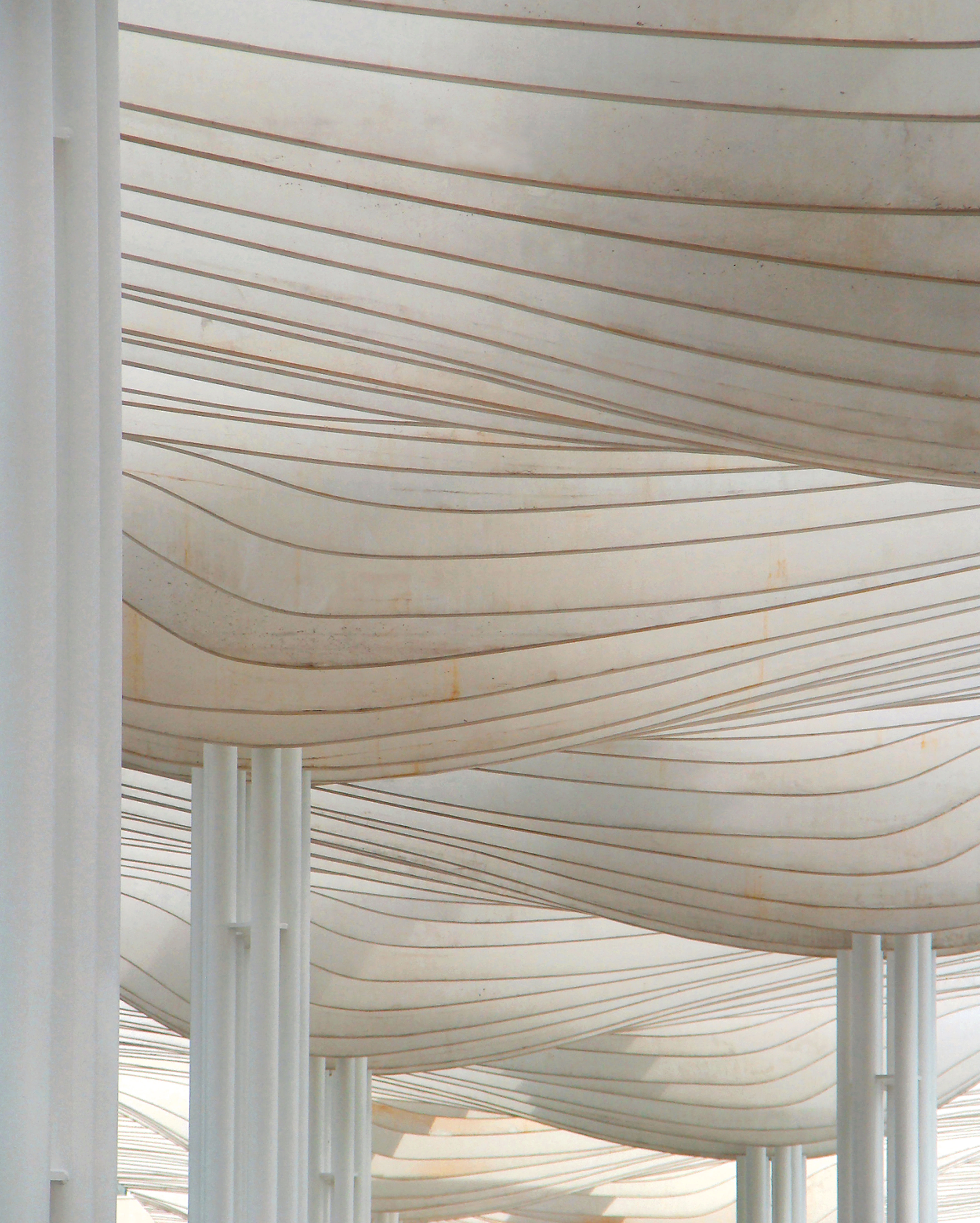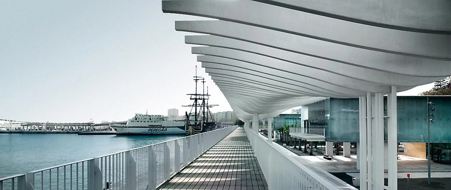For its part, the pergola is the element that unifies the whole waterfront, receiving passengers arriving by sea and providing strollers with shade. It is a metallic box beam of 1.60 meters in height and varying width, between 0.55 and 1.15 meters, which runs along a sinuous 400 meter stretch with only 16 supports placed along two parallel lines. The beam runs at a height of 11 meters, and from it hang 265 shading pieces of white reinforced concrete.