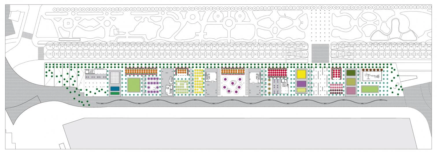 To recover for the city this stretch of coast once devoted to port activities, the scheme uses a pattern of palm trees, inspired in the Mediterranean palm groves, with a pergola that shelters the promenade by the sea.