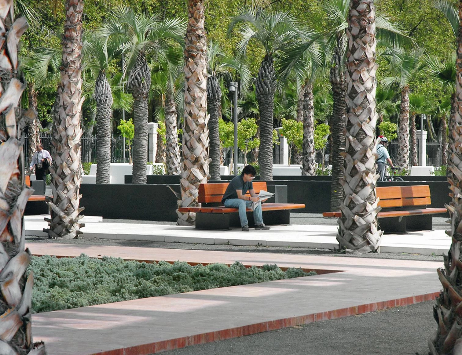 The traditional Arab garden type, with an essentially domestic character, was discarded in favor of the Mediterranean park type, which took form inspired by the Mediterranean plantations, where the palm trees, separated three meters from one another, are the elements that structure farmlands in 20x20-meter squares. The dimension of these squares stems from millennarian experience, because it generates a microclimate to protect from sun and wind, necessary for crops to grow in a harsh climate such as that of northern Africa. The Palmeral of Elche provided proof of why this was a good choice, and the fields have thus become the scenic spaces for the variety of uses a park demands without giving up its unitary character. In contrast with the large size of the palm, each precinct is conceived as a unique garden, trying to attain a human scale with furnishings and plants of different sizes, as well as a certain degree of variation through text precinct is conceived as a unique garden, trying to attain a human scale with furnishings and plants of different sizes, as well as a certain degree of variation through textures, flowering periods, scents and colors.