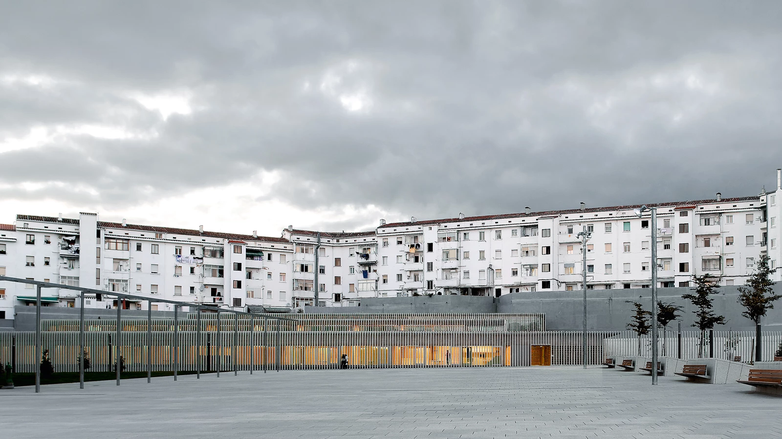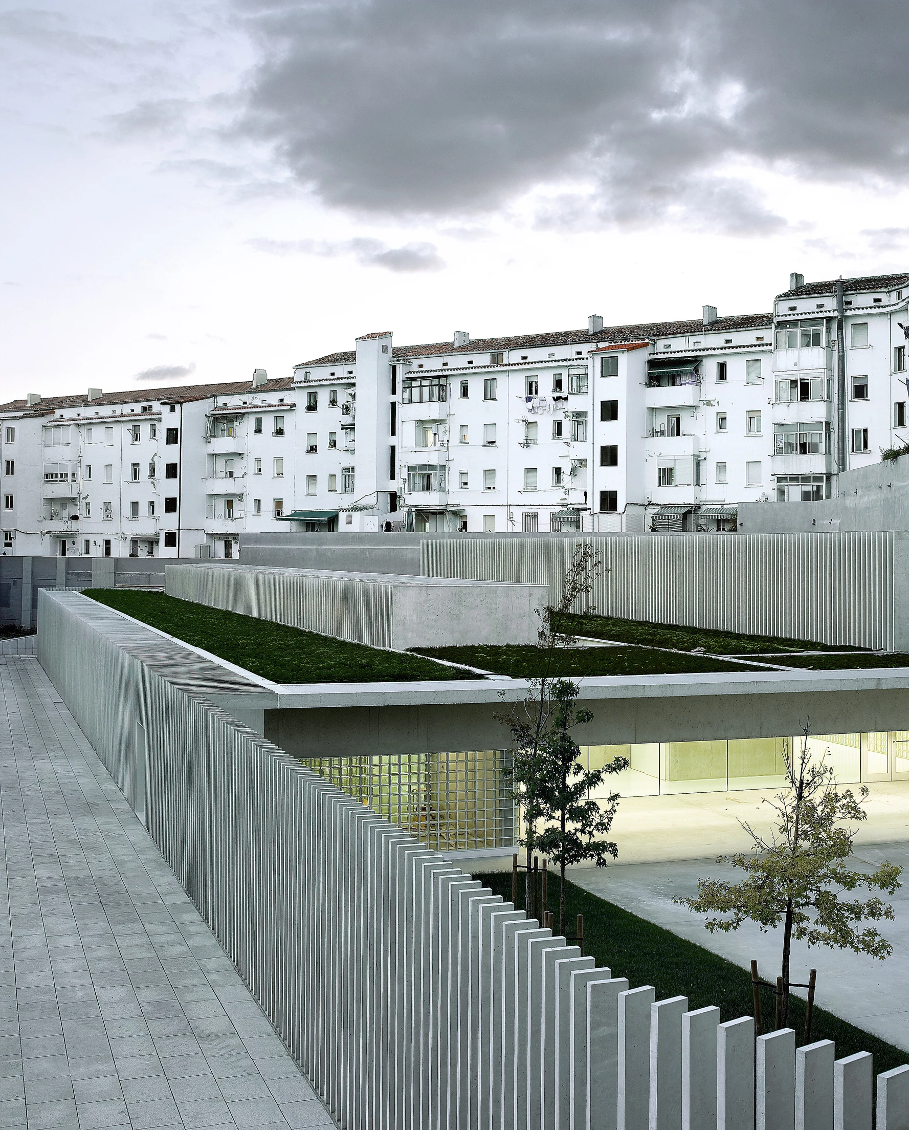 The value of the place was the determining factor when designing this elementary school. The plot became available after reorganizing the site, located on the edge of a peripheral neighborhood of Pamplona. Its almost triangular geometry is composed of two sides adjoined to the party walls of the rear part of a residential building, while the third side, of greater dimensions and facing south, opens up to a large square. The extreme conditions of the plot imposed two main priorities: collecting sunlight and devising a functional scheme of uses. The proposal is therefore constituted as the plinth of the existing building, to which it is attached with its concrete perimeter, asserting its presence as an abstract, orderly, modular and bold piece towards the square.