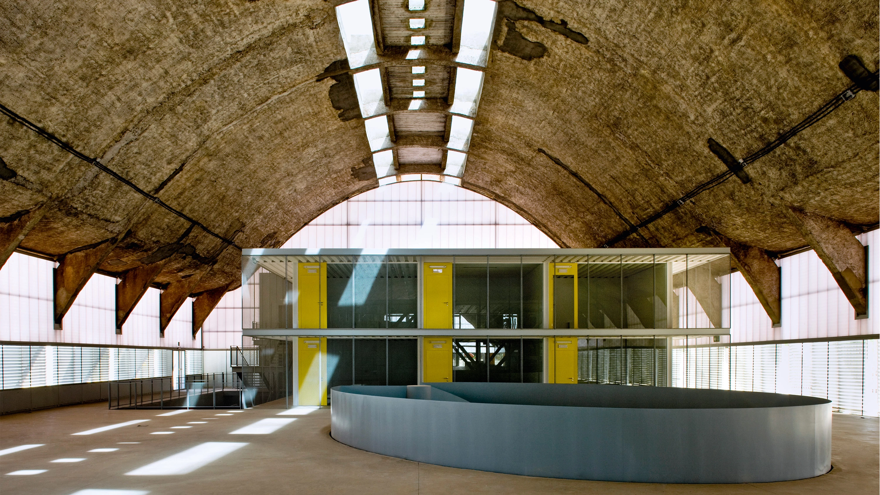 These coexist in a single space. A ramp descends to an underground floor linked to higher levels through large openings. Four new steel and glass structures create a sequence of spaces distinguished by use, shape, size and color. A small tower incorporating photovoltaic panels is the complex’s new reference point. The parabolic original shed maintains features of its reinforced concrete structure, such as the thin sheet of the roof.