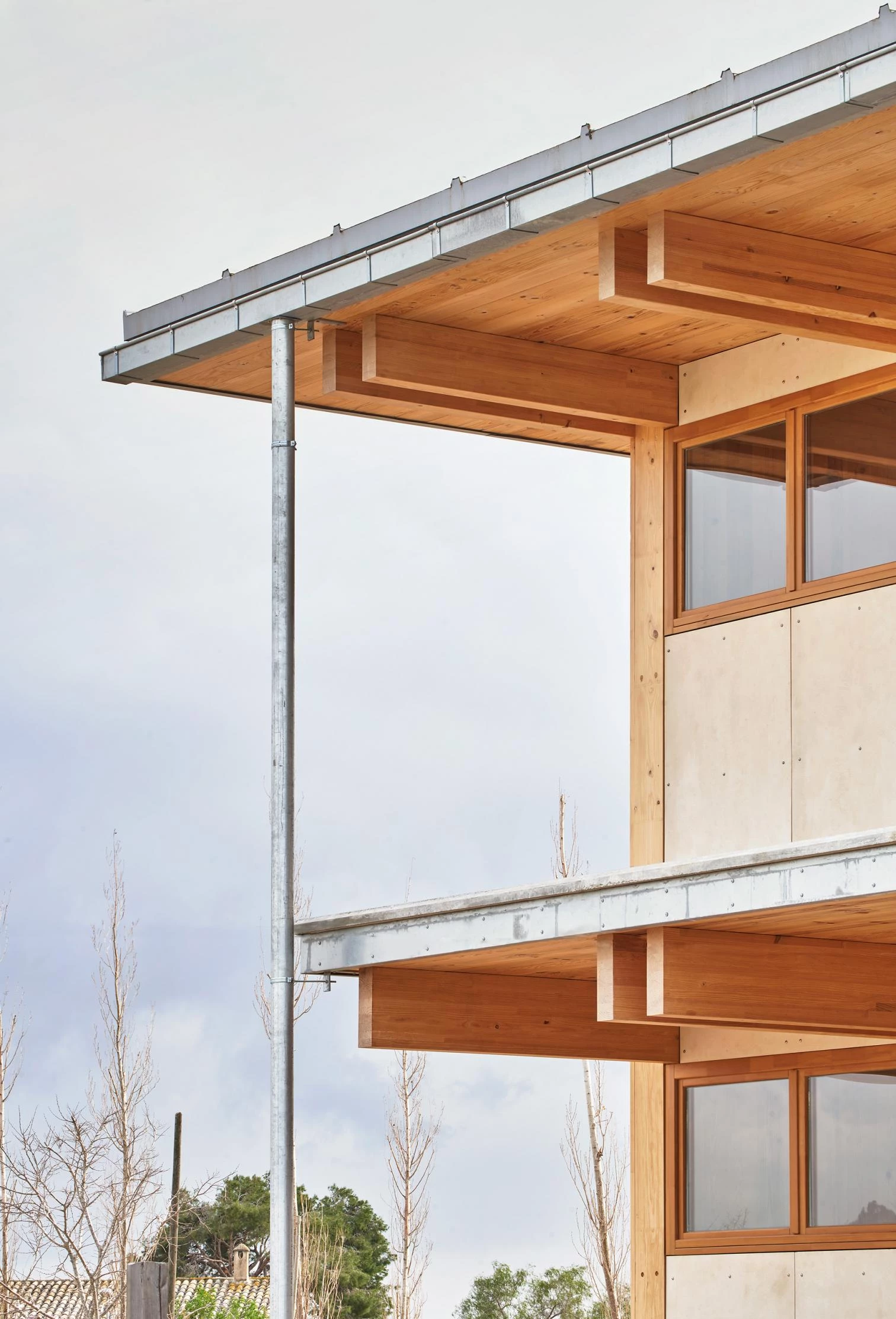 Each structural element is determined by the pressure it is subjected to: on the one hand, the pillar-and-girder portal frames transmit the vertical load to the foundation; on the other hand, the slabs of cross-laminated timber (CLT) absorb the horizontal load and produce the structure’s diaphragmatic effect; finally, CLT walls brace the building.