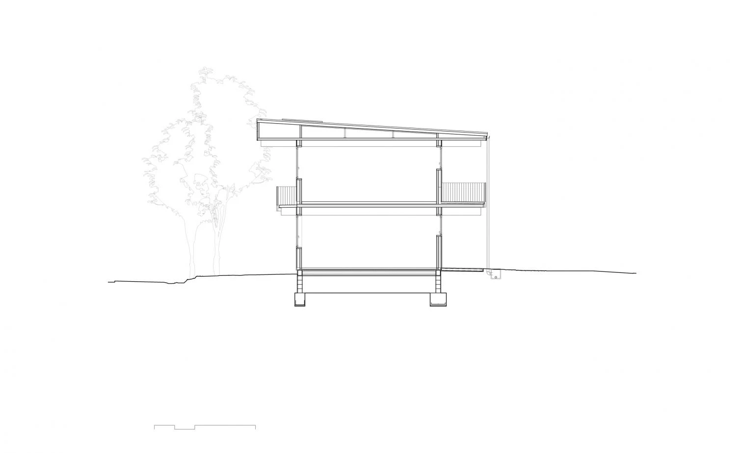 Radiata pinewood is used for the structure and frames. The floor is covered with linoleum (linseed oil and sawdust), and the exterior panels of cement with wood shavings ensures durability. The eaves of the roof and the cantilevers are protected with zinc plates.