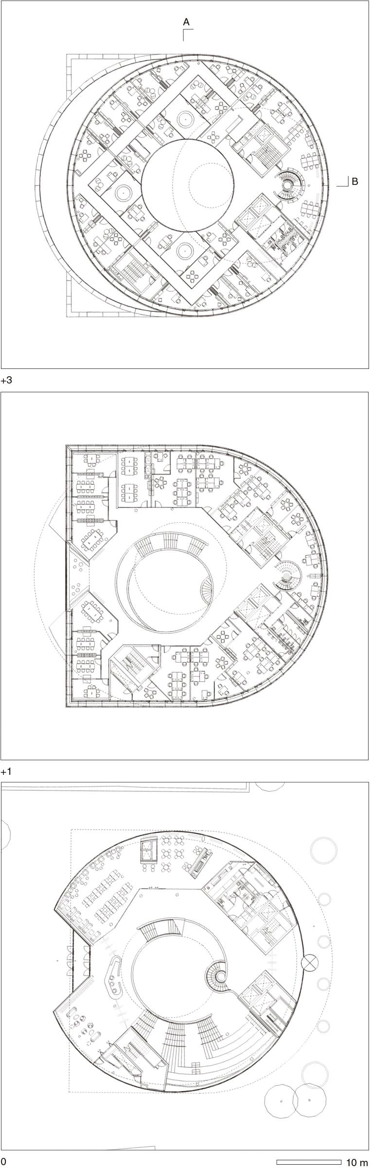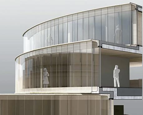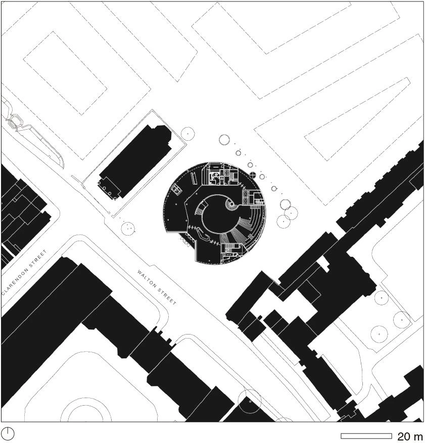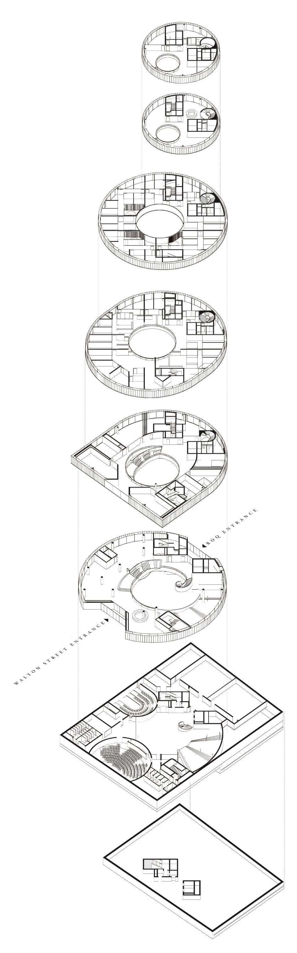 The proposal of a series of shifted discs is developed from the parameters of the site and plot boundaries. The shifting in floors creates overhangs and covered volumes and reflects the principles of the masterplan massing with the mass of the building moved northwest towards the center of the ROQ site. The main entrance is located in the middle of the elevation in a classical manner, centered underneath the main teaching floor of Level 1 whose circular geometry is transformed into a rectangular form along Walton Street, resulting in a ‘Sheldonian’-like shape. The introduction of this orthogonal form addresses the historic setting by continuing the line of St. Paul’s Church portico and echoing the symmetrical entrance of Oxford University Press.