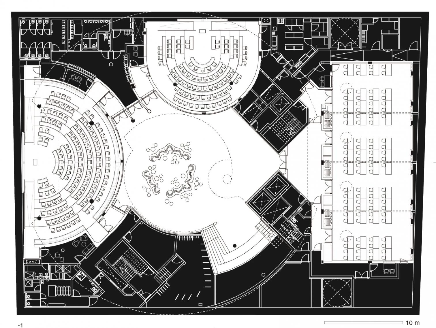 Such a vision requires a specific response and building. The starting point is from the heart of the building, the Forum. This space cuts through the school as a vertical public space connecting all the levels and programs together into one whole. Central to a school of government is the idea of openness, communication and transparency. The central forum takes this principle literally by stitching all levels together and providing congregation, meeting and social spaces. Its arrangement is in many ways like that of an auditorium with a series of interconnected terraces that step up from the ground floor all the way to the upper levels of the School. Each terrace could operate as a separate space, for example as a study area or as part of one connected whole volume for a larger presentation. The Forum will be a space that encourages communication and discussion, formal and informal, planned and accidental.