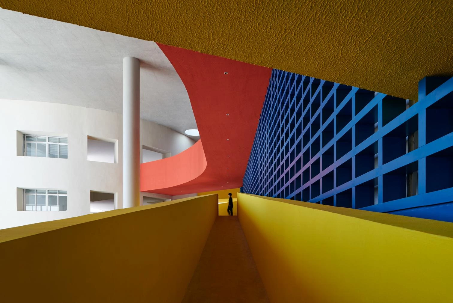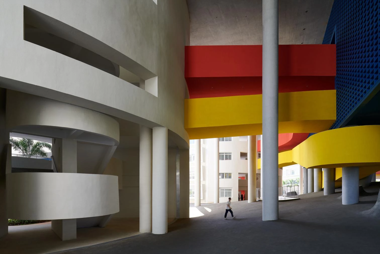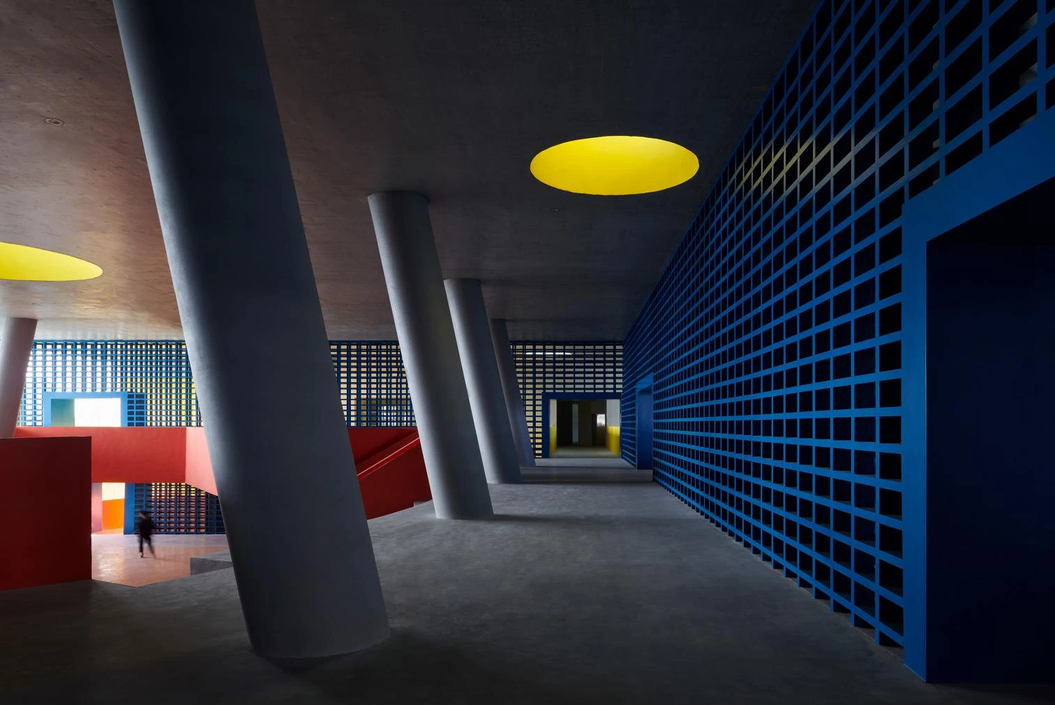 Under a ‘floating’ concrete roof, cantilevered volumes and double-height columns are inserted into a dynamic spatial sequence of semi-exterior spaces appropriate to the local tropical climate. The bridges and ramps at different heights are entwined with the solid suspended volumes. The blue cube and the red cylindrical block correspond to the multipurpose event hall and exhibition room, respectively. In a interplay of light and shadows, the interior and exterior spaces are woven together forming a labyrinthine space.