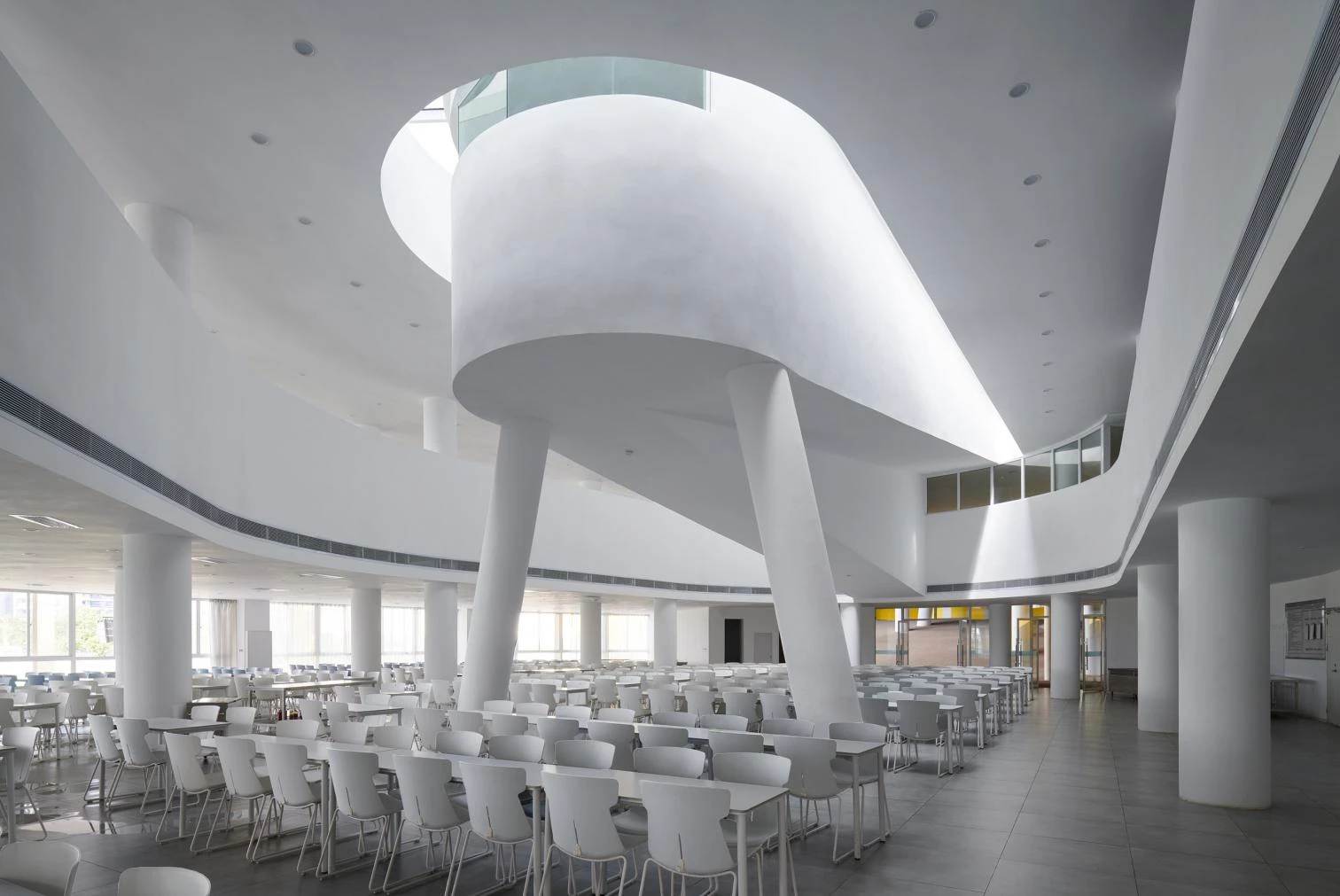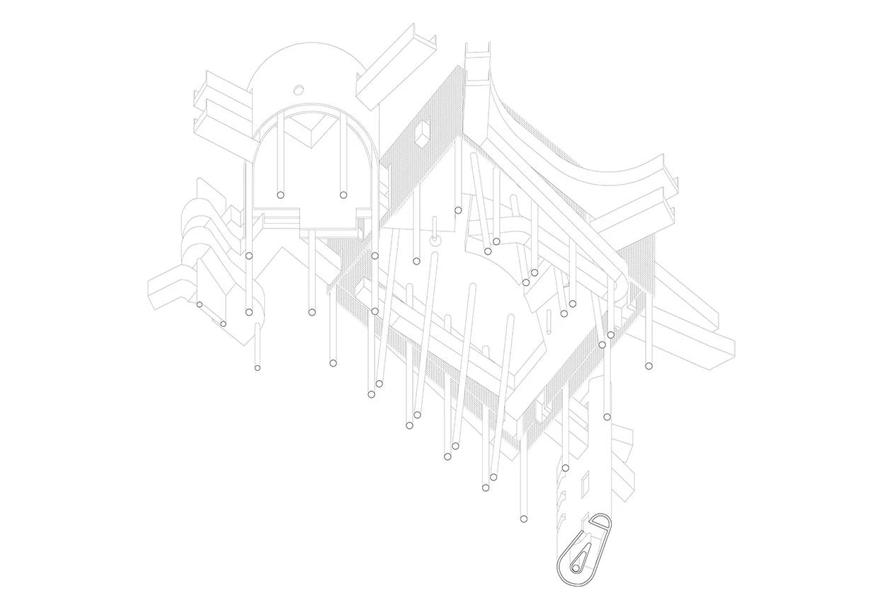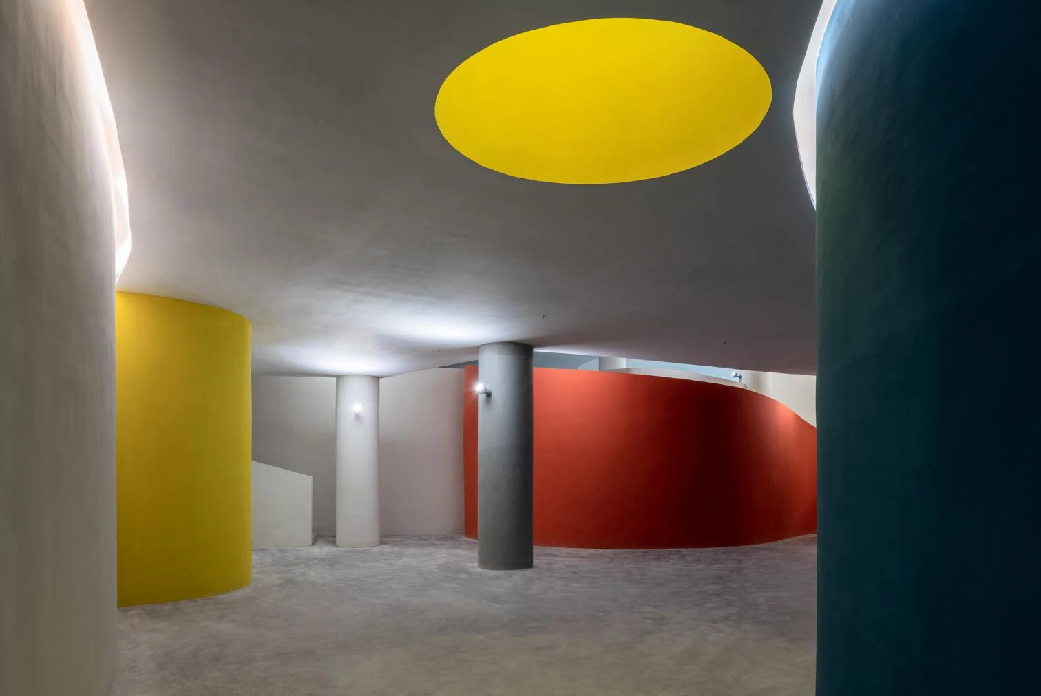 Under a ‘floating’ concrete roof, cantilevered volumes and double-height columns are inserted into a dynamic spatial sequence of semi-exterior spaces appropriate to the local tropical climate. The bridges and ramps at different heights are entwined with the solid suspended volumes. The blue cube and the red cylindrical block correspond to the multipurpose event hall and exhibition room, respectively. In a interplay of light and shadows, the interior and exterior spaces are woven together forming a labyrinthine space.