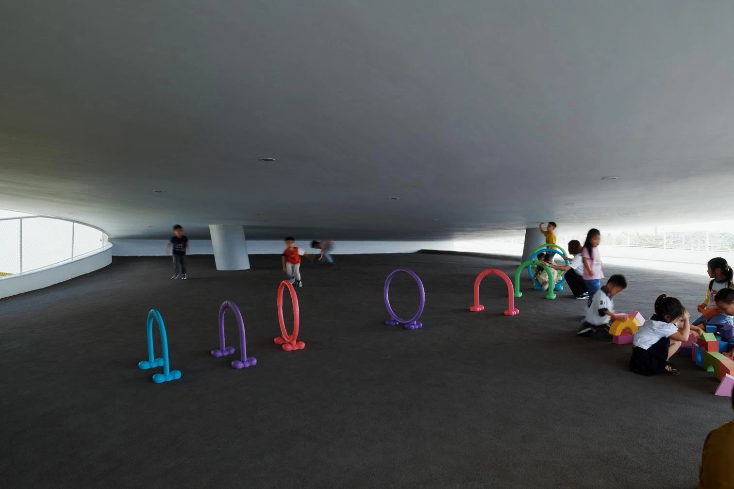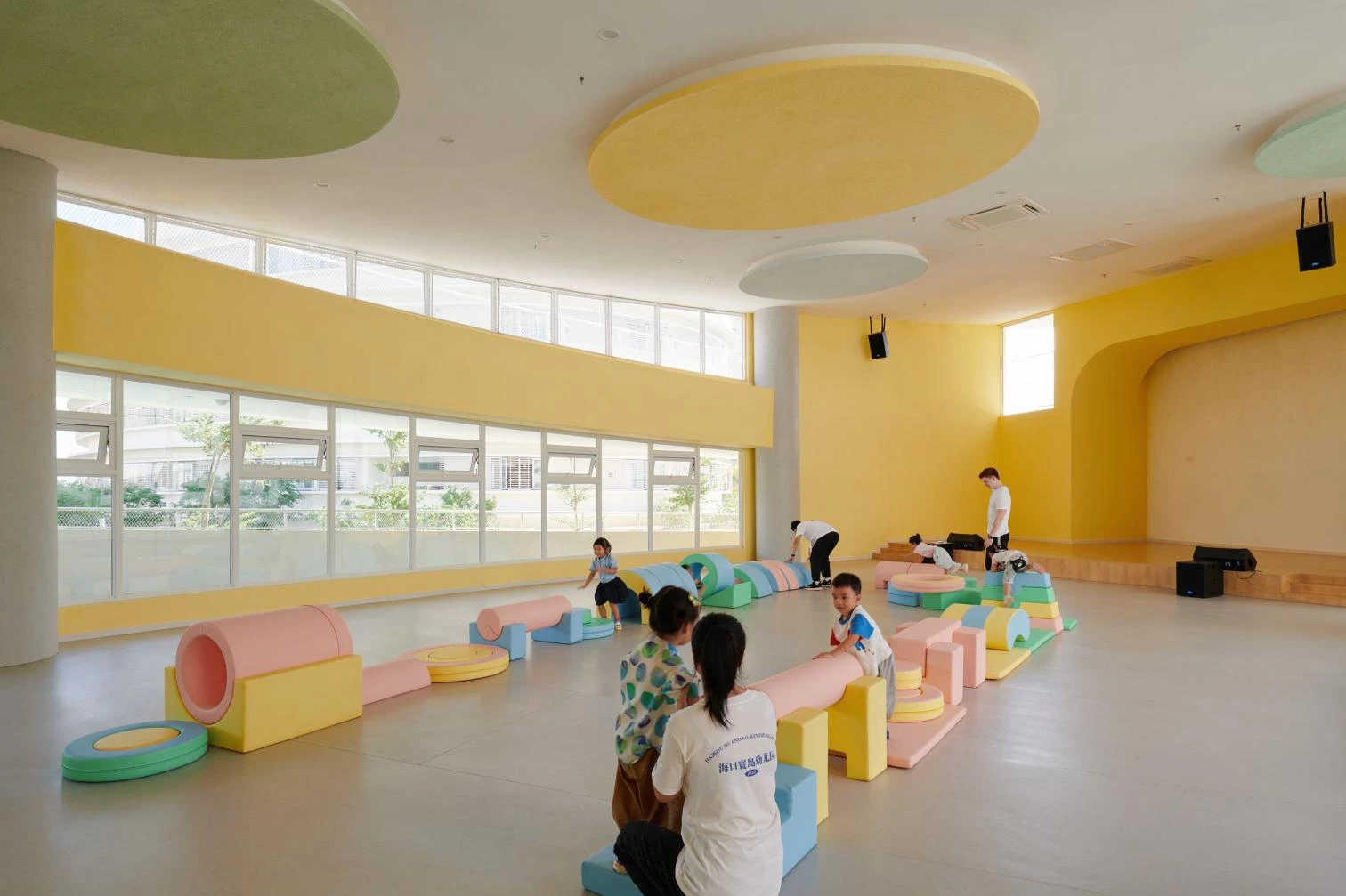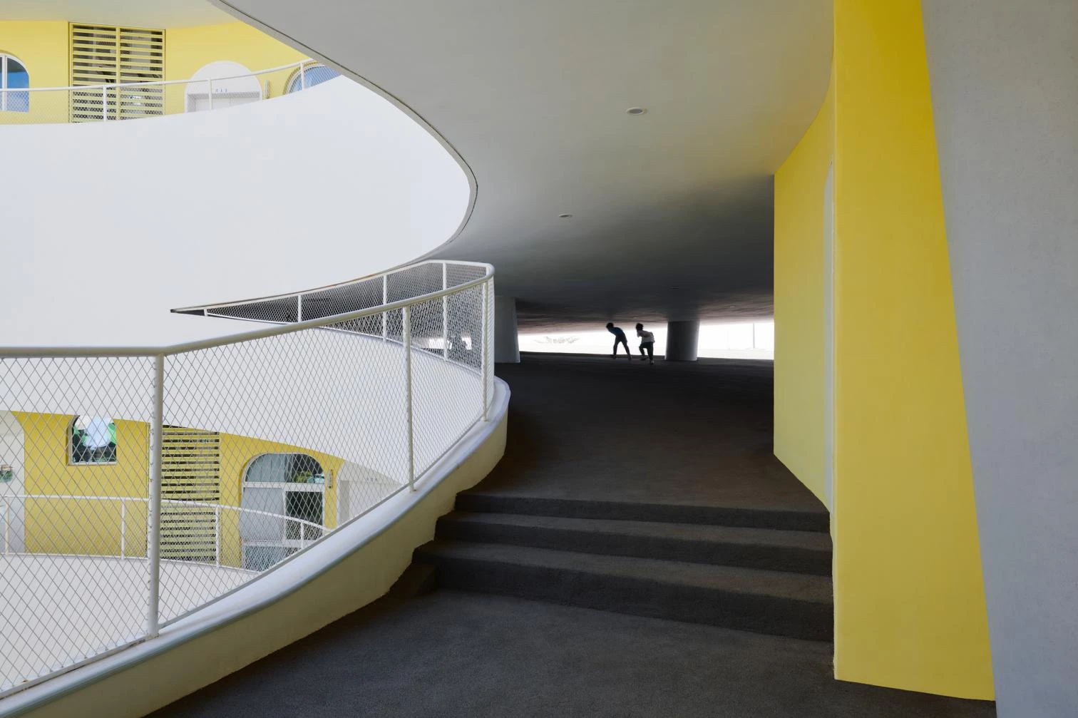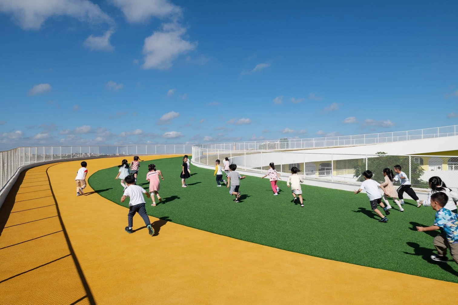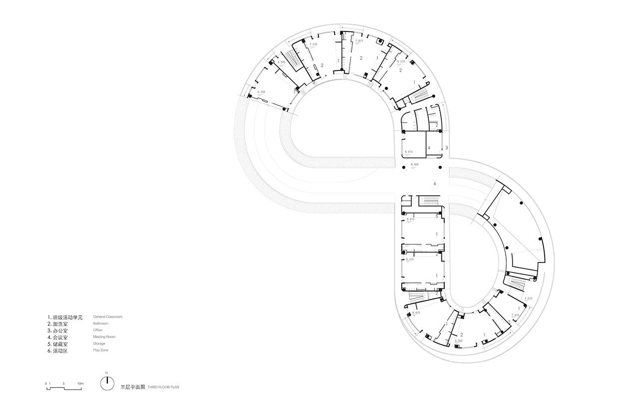 The intersection of curves and straight lines in the brightly colored volumes creates a playful atmosphere at this school in the city of Haikou, located north of Hainan Island. Situate on a sloping site, the new construction seeks, through its forms, to stimulate imagination, creativity, and communication.