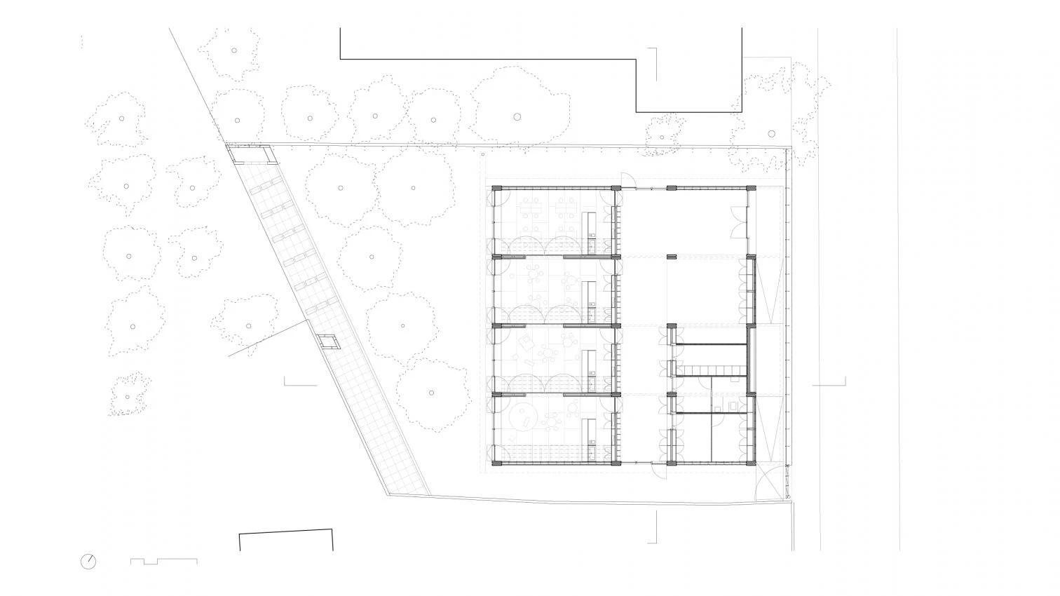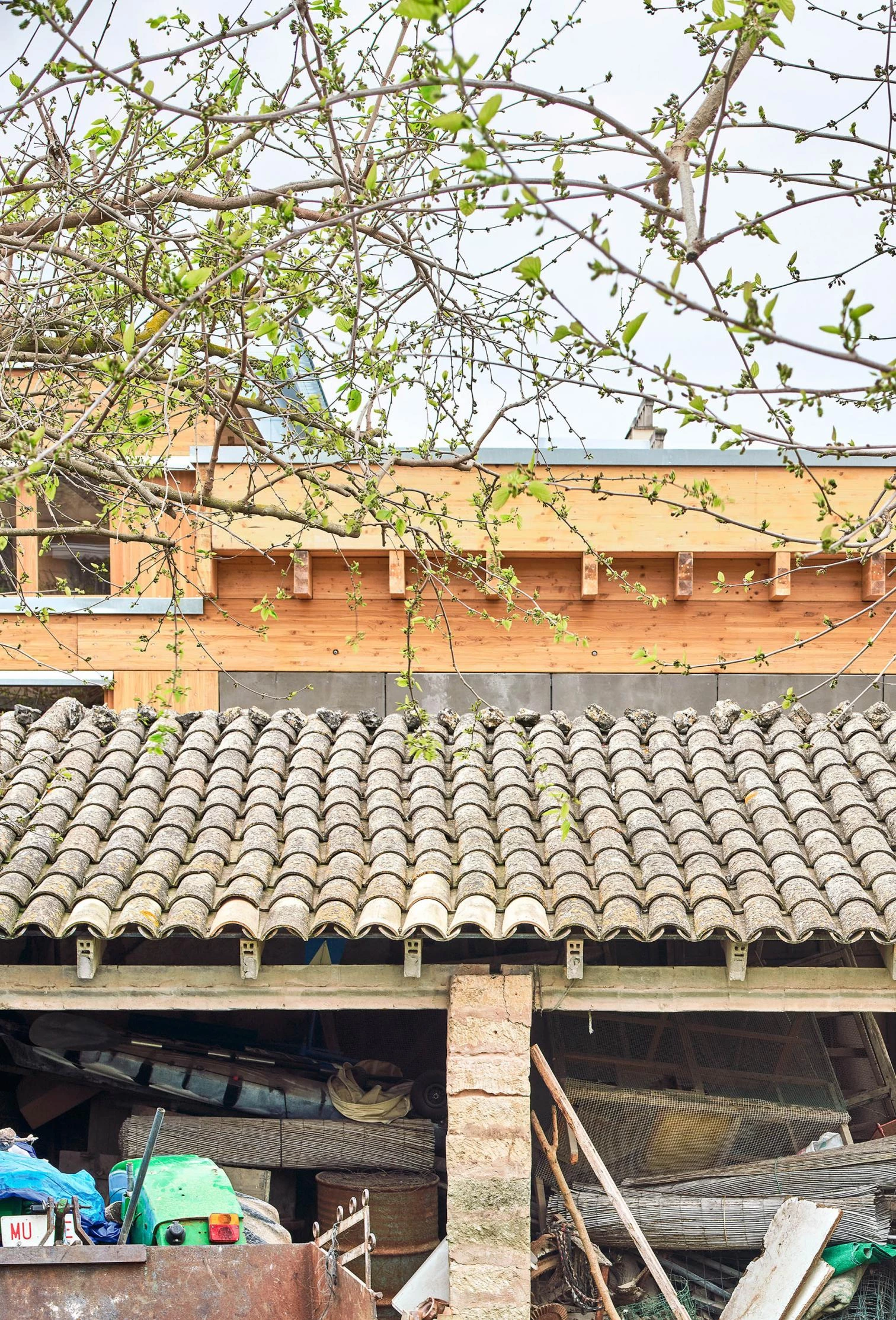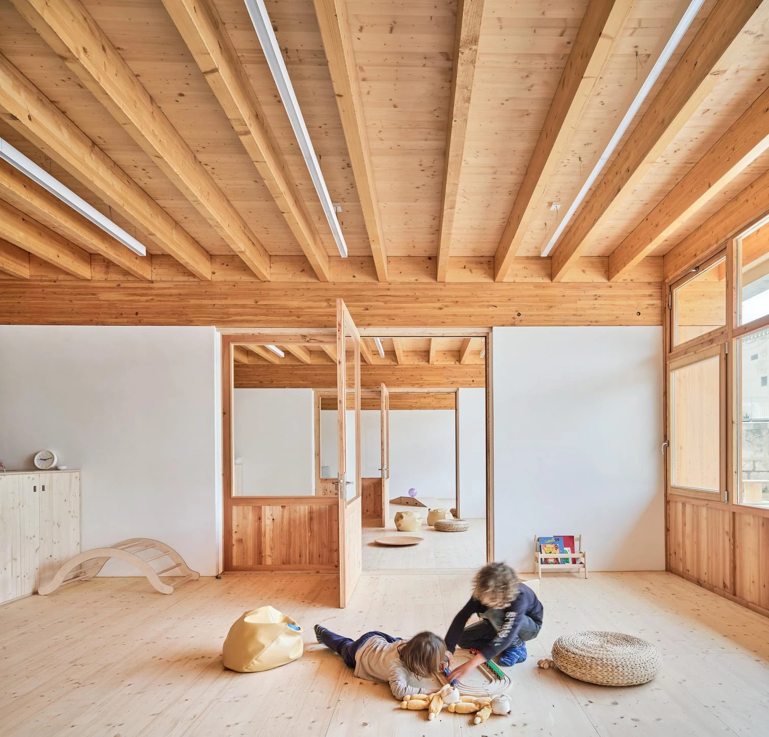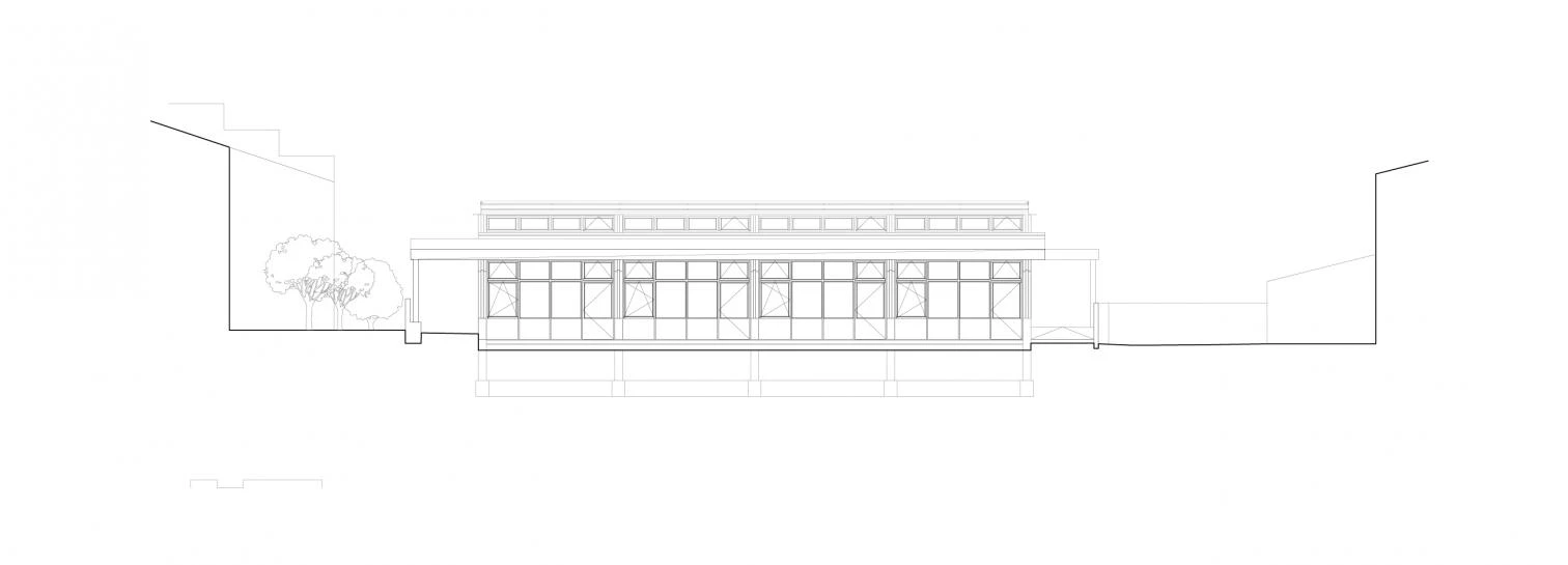 The building approaches the street to free as much space as possible on the back end, where the existing orange trees are saved. The program is organized on five stretches parallel to the street: the entry ramp, underneath a porch; the offices, toilets, dining room, and kitchen; the common space; four classrooms; the garden. These five stretches open up into each other and with the outdoors, allowing multiple uses. Longitudinally, five timber frames connect the street with the backyard. Above, slender laminated beams of different heights mark the interior character. In the shared space, these beams rise to let dusk and dawn sunlight sneak in between them, allowing as well a precise ventilation, a built ‘embat.’