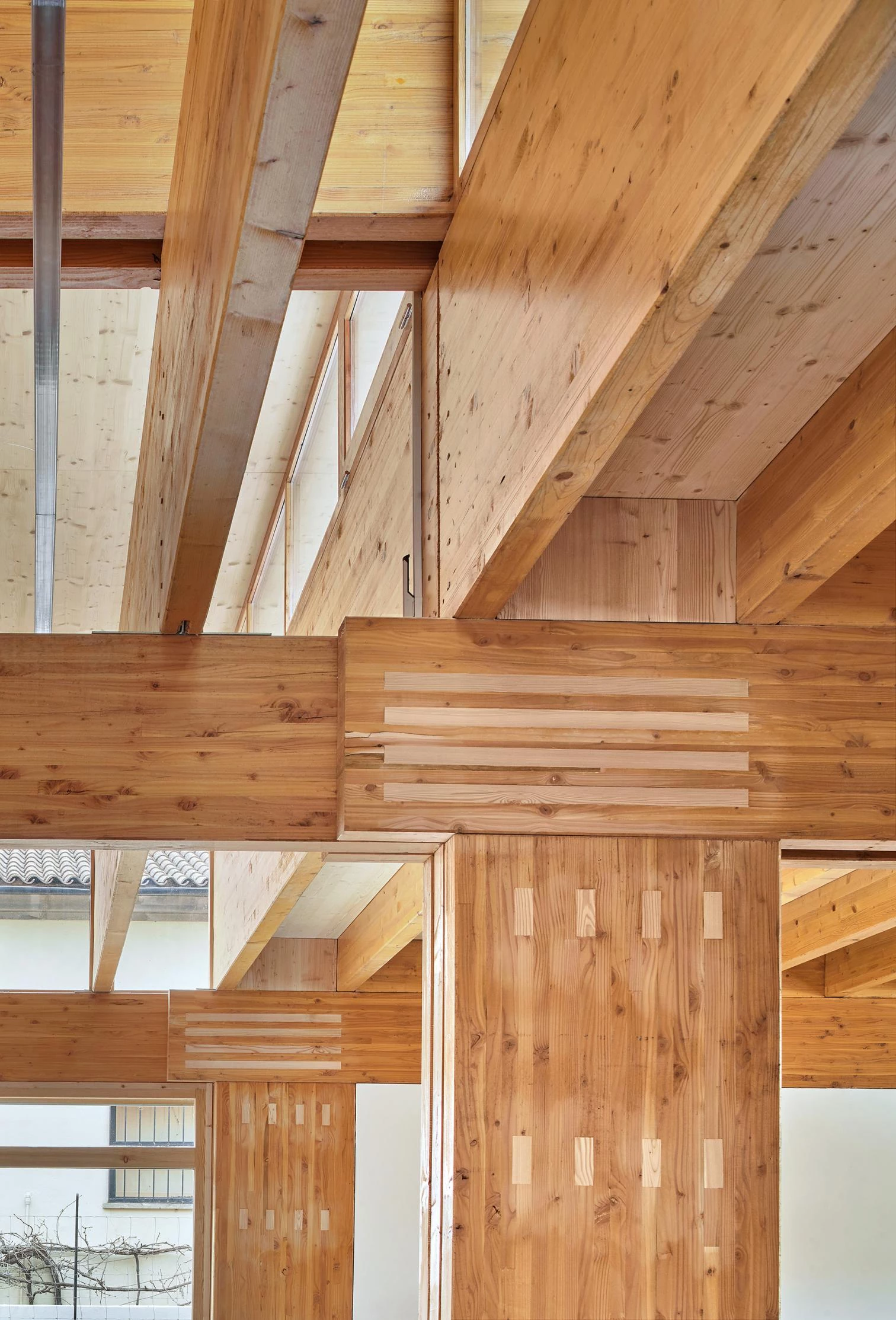 The concrete base of the structure collects sunlight during winter, warming the interior. A structure made of pine and larch laminated pillars and beams and CLT panels transforms the school into a large porch in summer, when the embat – the sea wind – cools the interior on the warmest days. The collaboration between the thermal inertia of the stone base and the thermal insulation of the light roof, as well as between stereotomic and tectonic forces, helps to order, stratify, and take the light of the island’s interior to the different spaces of the building.