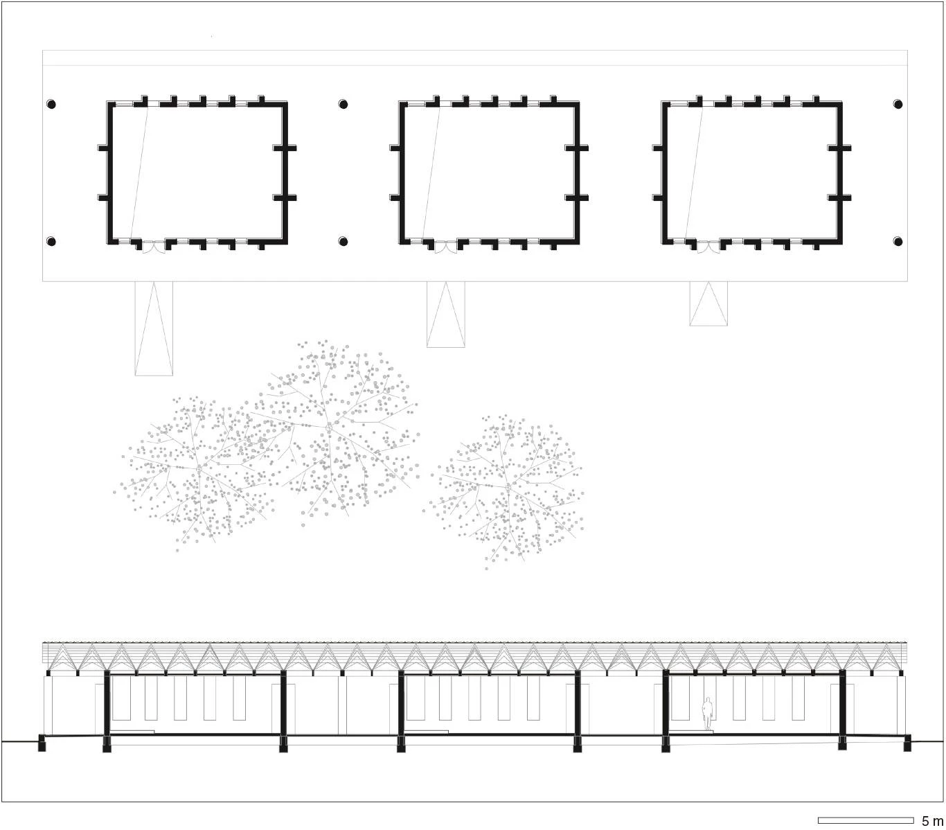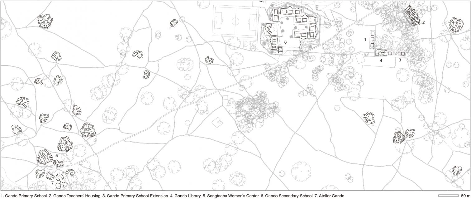 With a population of 3000 inhabitants, Gando is a small village in the southern plains of burkina faso. It is located 200 kilometers from Ouagadougou, the country´s capital. In 1998, Francis Kéré launched a project to build a school in his native village , convinced of the fact that education was the first step for the personal and economic development of his community. Three rectangular modules connected by a single roof make up the basic structure of the building, and each one of them accommodates one classroom for fifty students. The ceiling and walls are built with clay bricks, made on site by the villagers themselves, and wich play the most prominent in the project. To ensure natural ventilation and protect the school from rain and sunlight, the ceramic ceiling and zinc roof are separated by a light steel lattice.