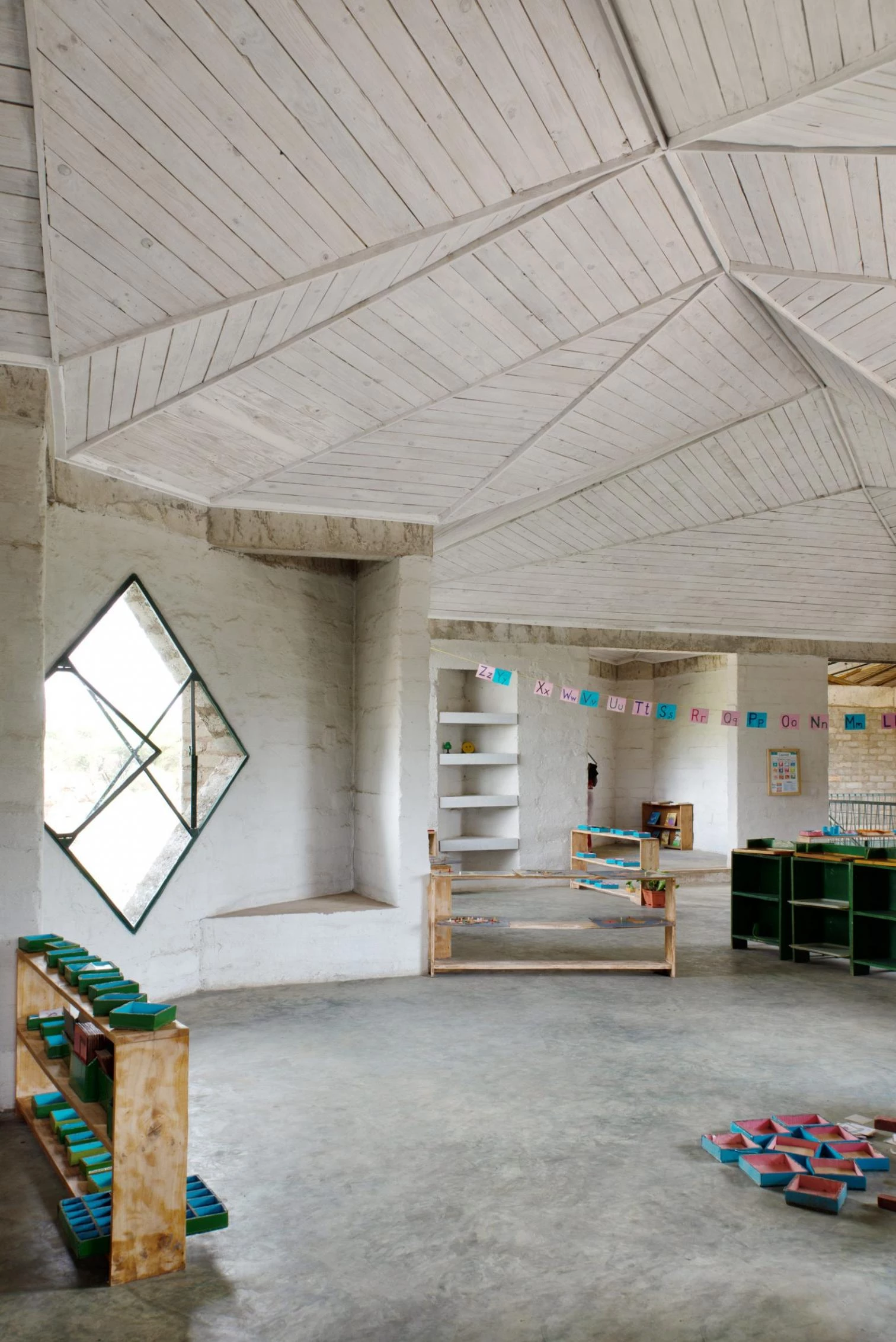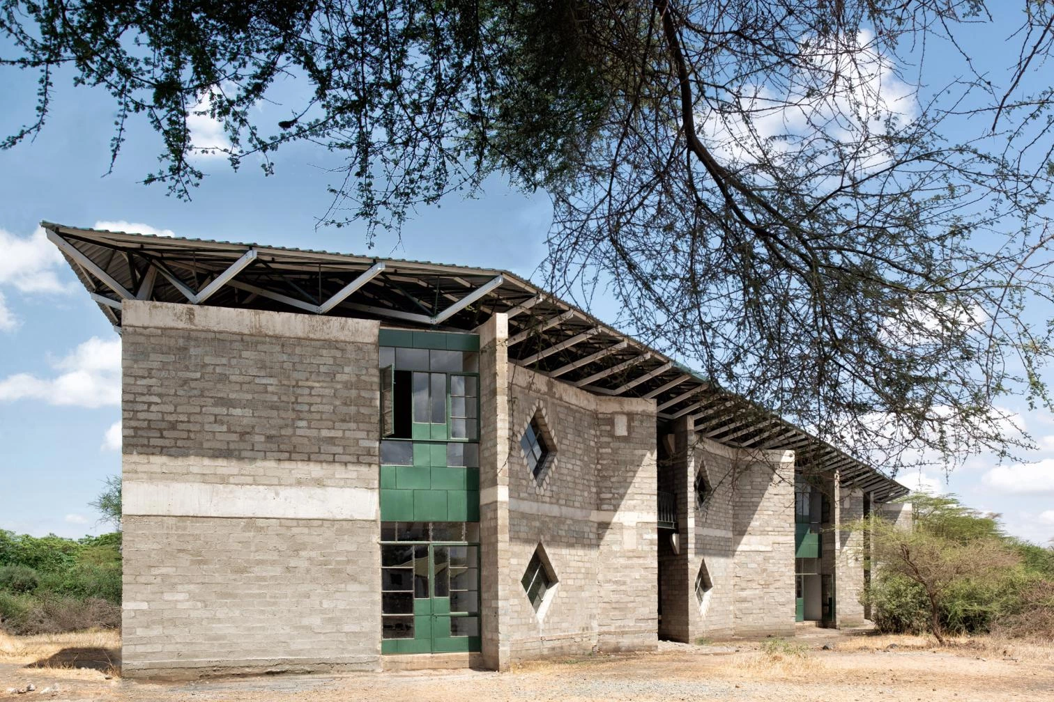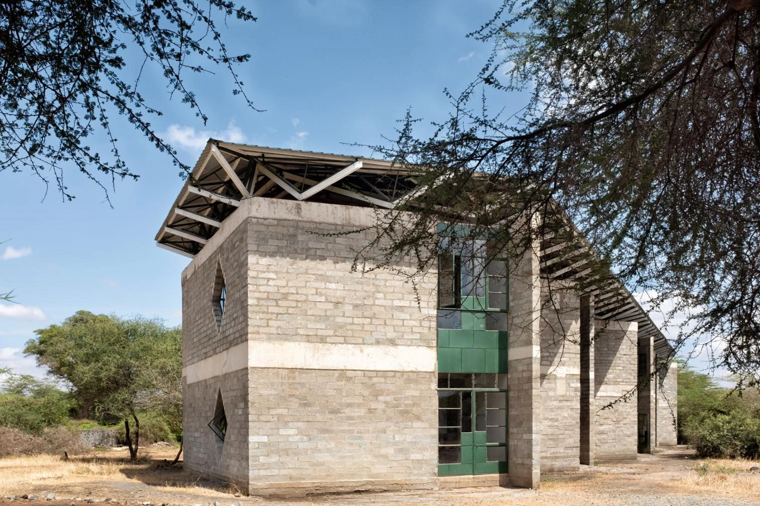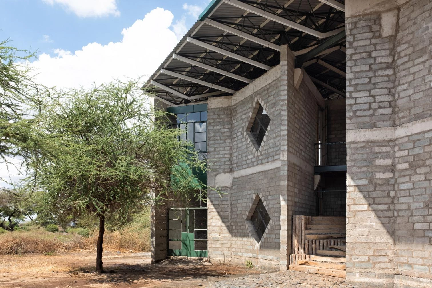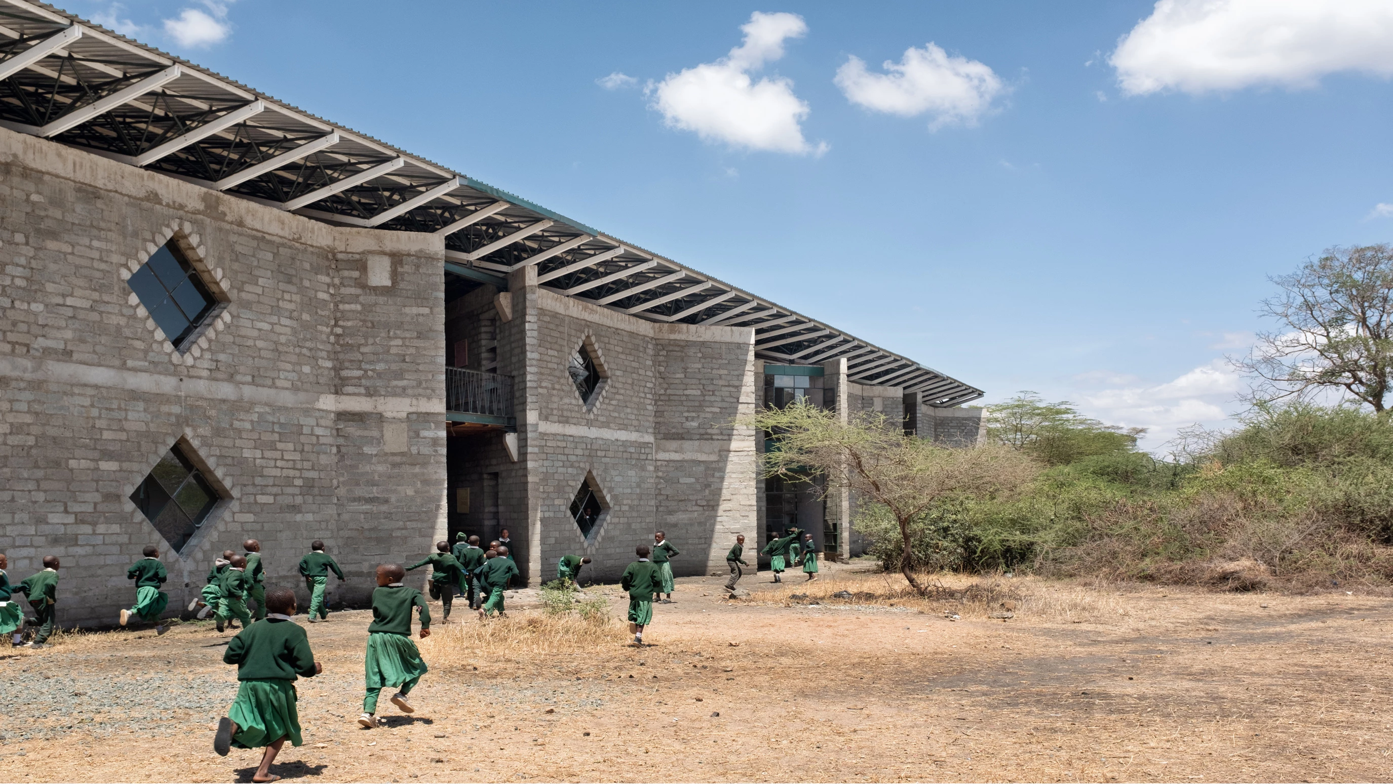 In an east-west flow, the construction crowned with a large steel roof presents walls of volcanic rock and sand arranged in 45º angles to optimize cross ventilation. The interiors are partly clad in straw and mud to enhance thermal and acoustic comfort, a vernacular technique learned from Maasai women. The different diamond-shaped windows on the facade open to smaller learning niches while capturing solar heat to warm the classrooms.