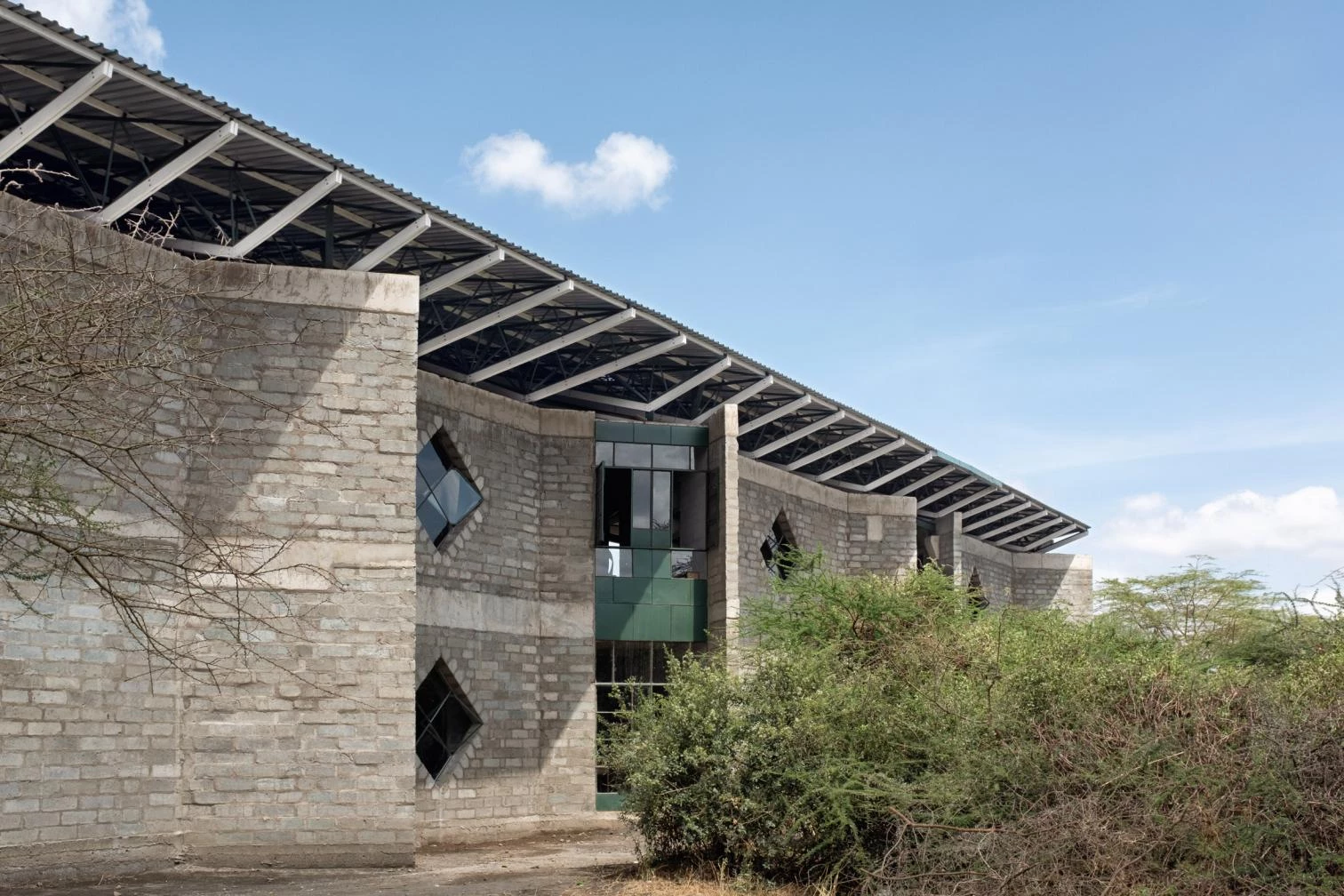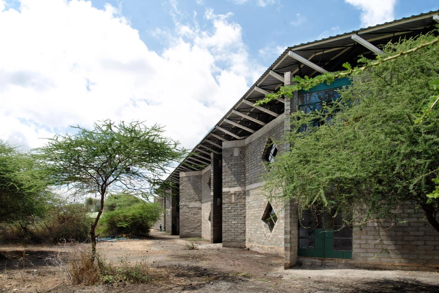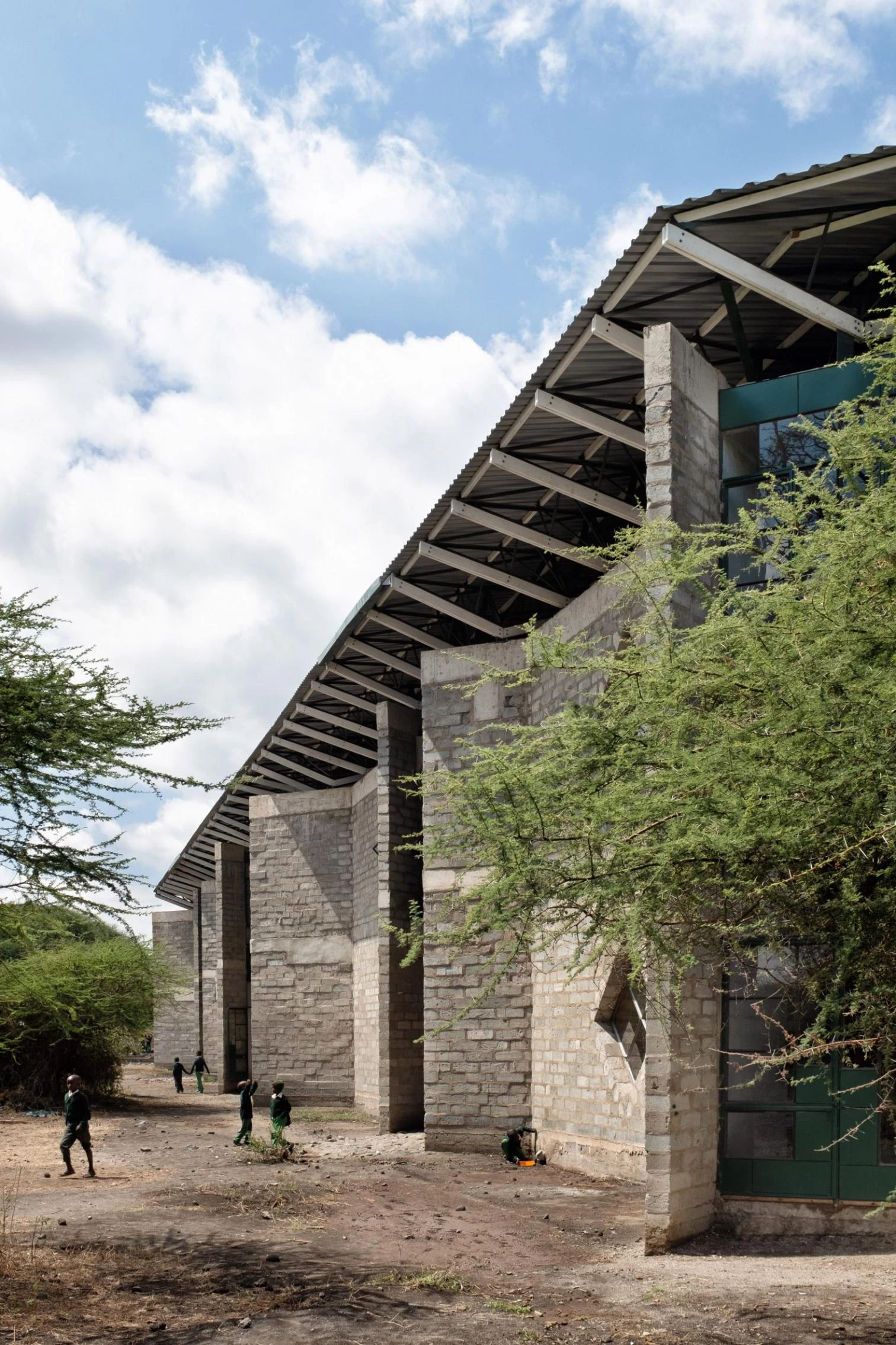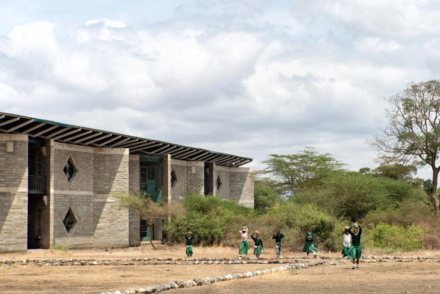 In an east-west flow, the construction crowned with a large steel roof presents walls of volcanic rock and sand arranged in 45º angles to optimize cross ventilation. The interiors are partly clad in straw and mud to enhance thermal and acoustic comfort, a vernacular technique learned from Maasai women. The different diamond-shaped windows on the facade open to smaller learning niches while capturing solar heat to warm the classrooms.