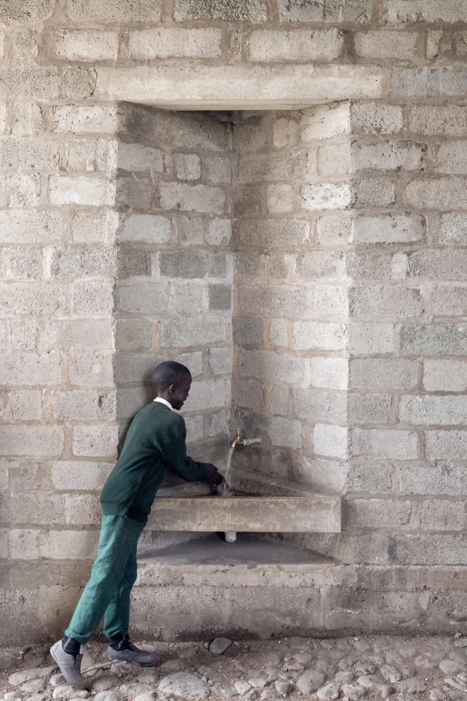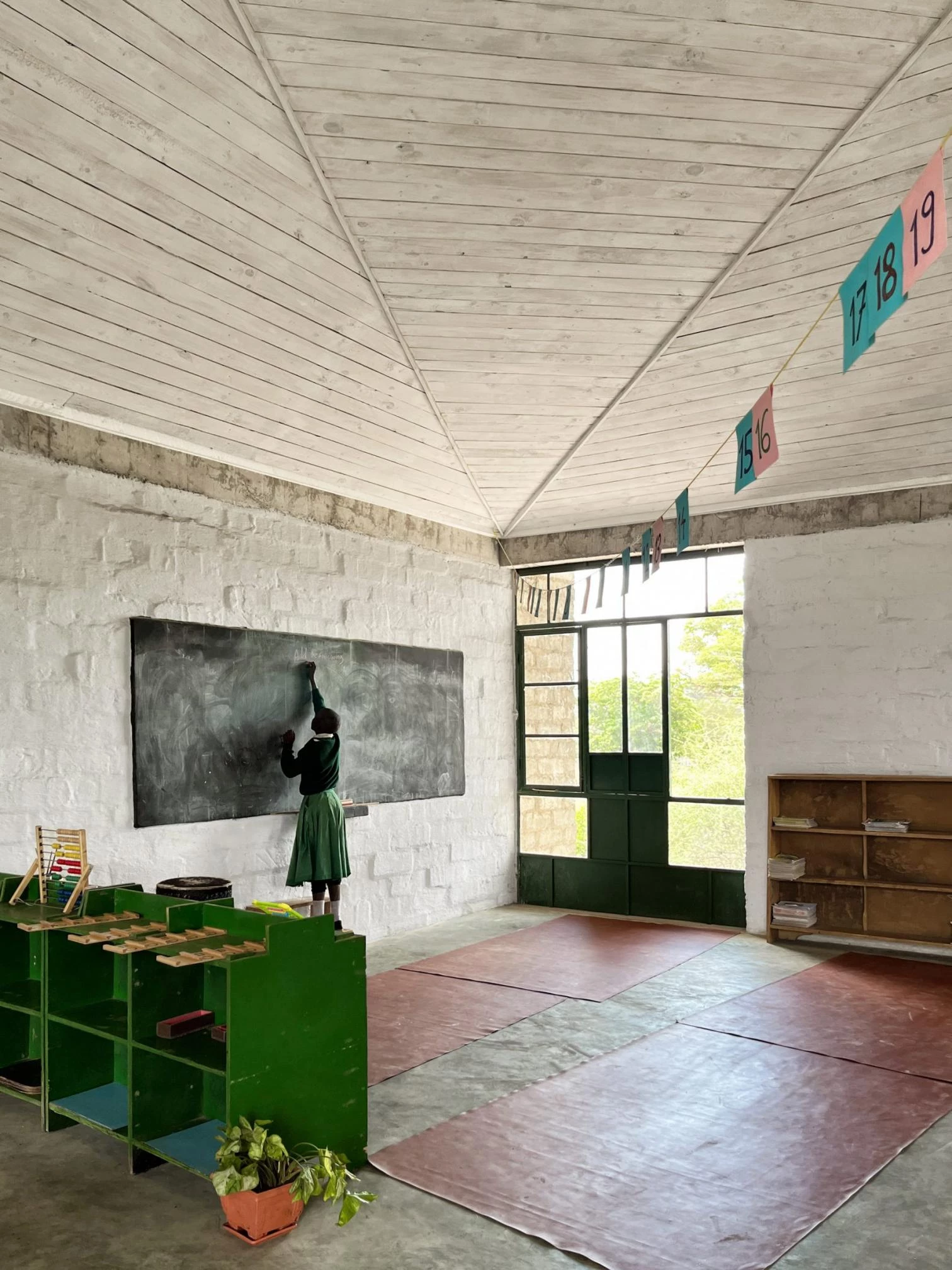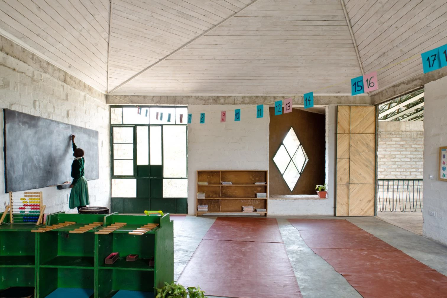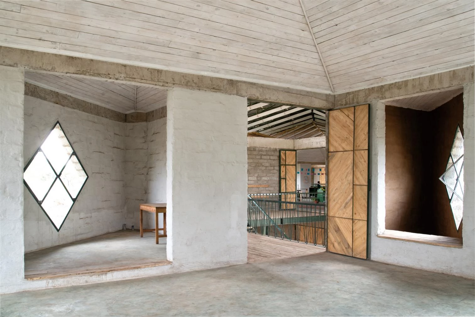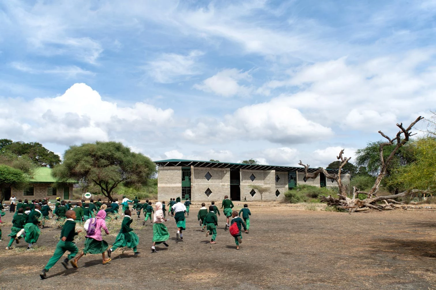 In an east-west flow, the construction crowned with a large steel roof presents walls of volcanic rock and sand arranged in 45º angles to optimize cross ventilation. The interiors are partly clad in straw and mud to enhance thermal and acoustic comfort, a vernacular technique learned from Maasai women. The different diamond-shaped windows on the facade open to smaller learning niches while capturing solar heat to warm the classrooms.