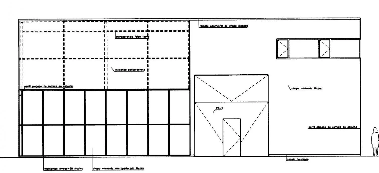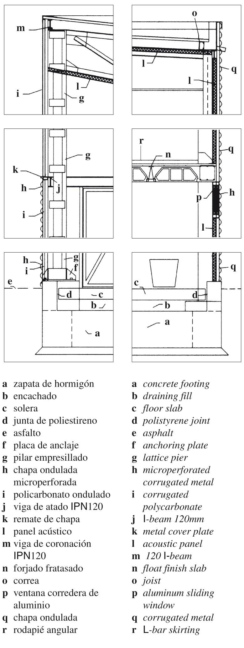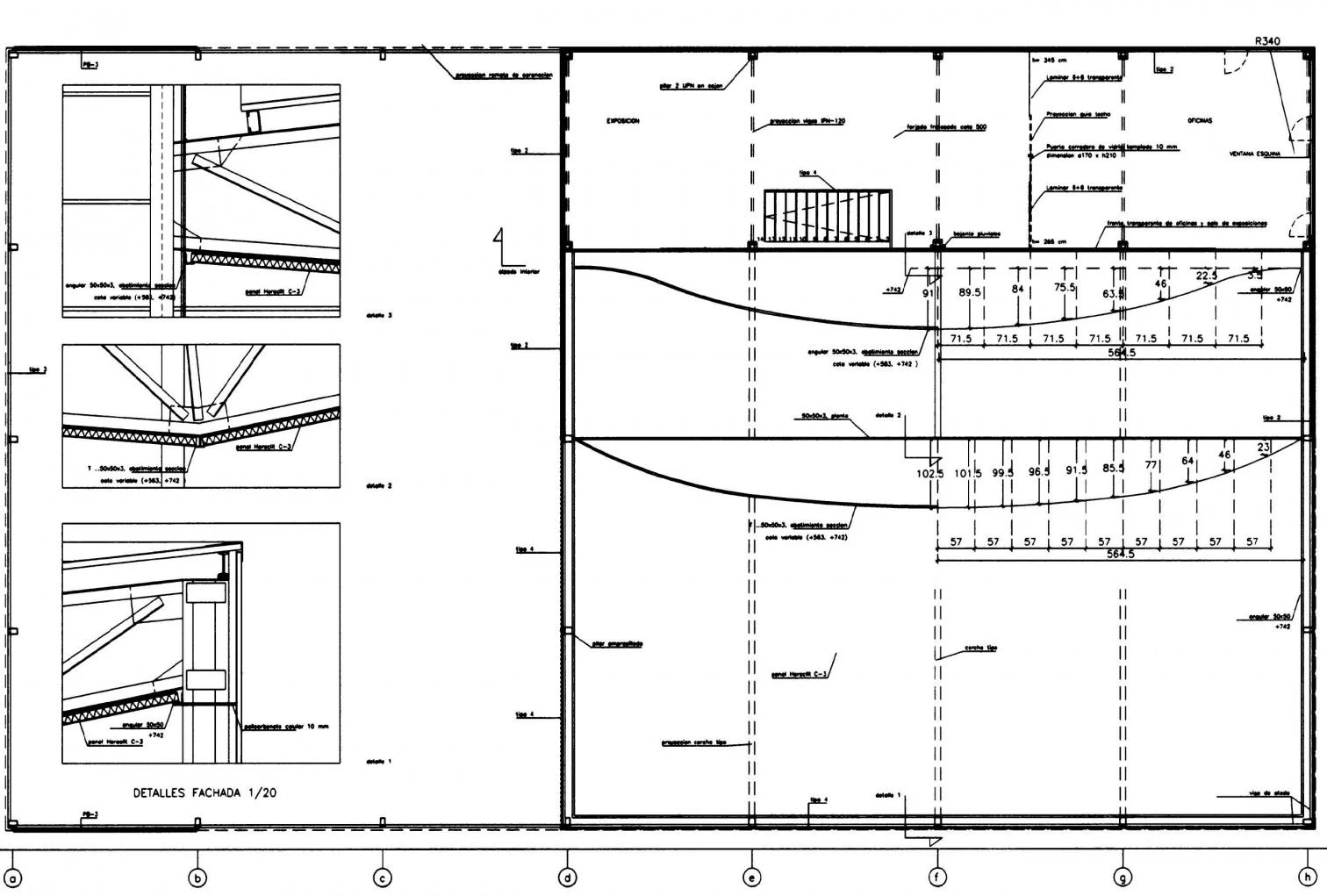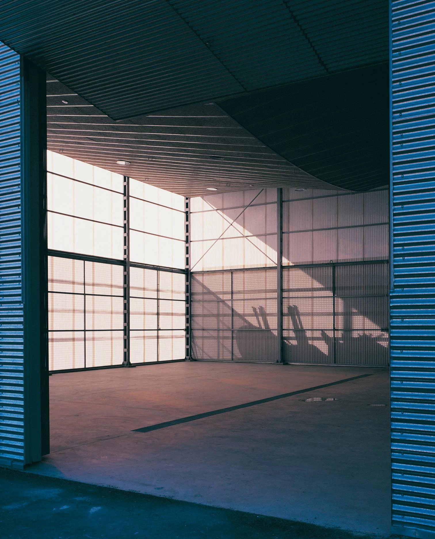 In the interior, each area becomes spatially independent thanks to the different configuration of the roof. One same triangular lattice girder spans the large bays of the workshop and shed, set in different directions in order to brace the loadbearing structure. Its slanted shape is exposed in the porch that serves as a storage shed, but is concealed in the working area behind the suspended ceiling of mineralized fiber plates, that follows the layout of a curved conoid to avoid the acoustic resonance that usually takes place in large volume spaces. Conventional floor slabs were used to span the narrower office bay. In order to avoid all constructional display, the structure remains wrapped up within the enclosure, seeking a simple use of materials through modulation and conventional detailing.