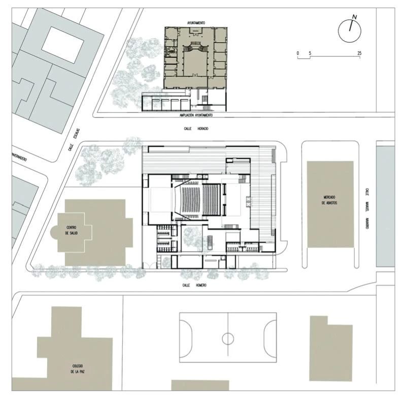 The idea of configuring intermediate spaces of transition between areas is taken to the interior, underscoring the importance of the thresholds in a building for the performing arts, aside from absorbing the essence of the Mediterranean architecture of the surroundings. Public access is through the northwest corner under the protection of the facade portico, freeing up an exterior space that separates the building from the nearby structures and generating a gathering area for spectators.