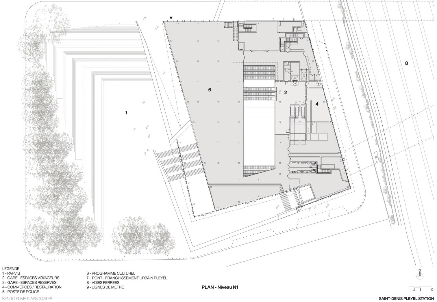 Through a series of stairs and ramps that follow a spiral formation, Saint-Denis Station expands public space and connects with the urban scheme of the Pleyel district in northern Paris. A work of the Japanese architect Kengo Kuma, the complex includes complementary programs, with cultural and commercial spaces, and it is linked to the Landy neighborhood by a bridge.
