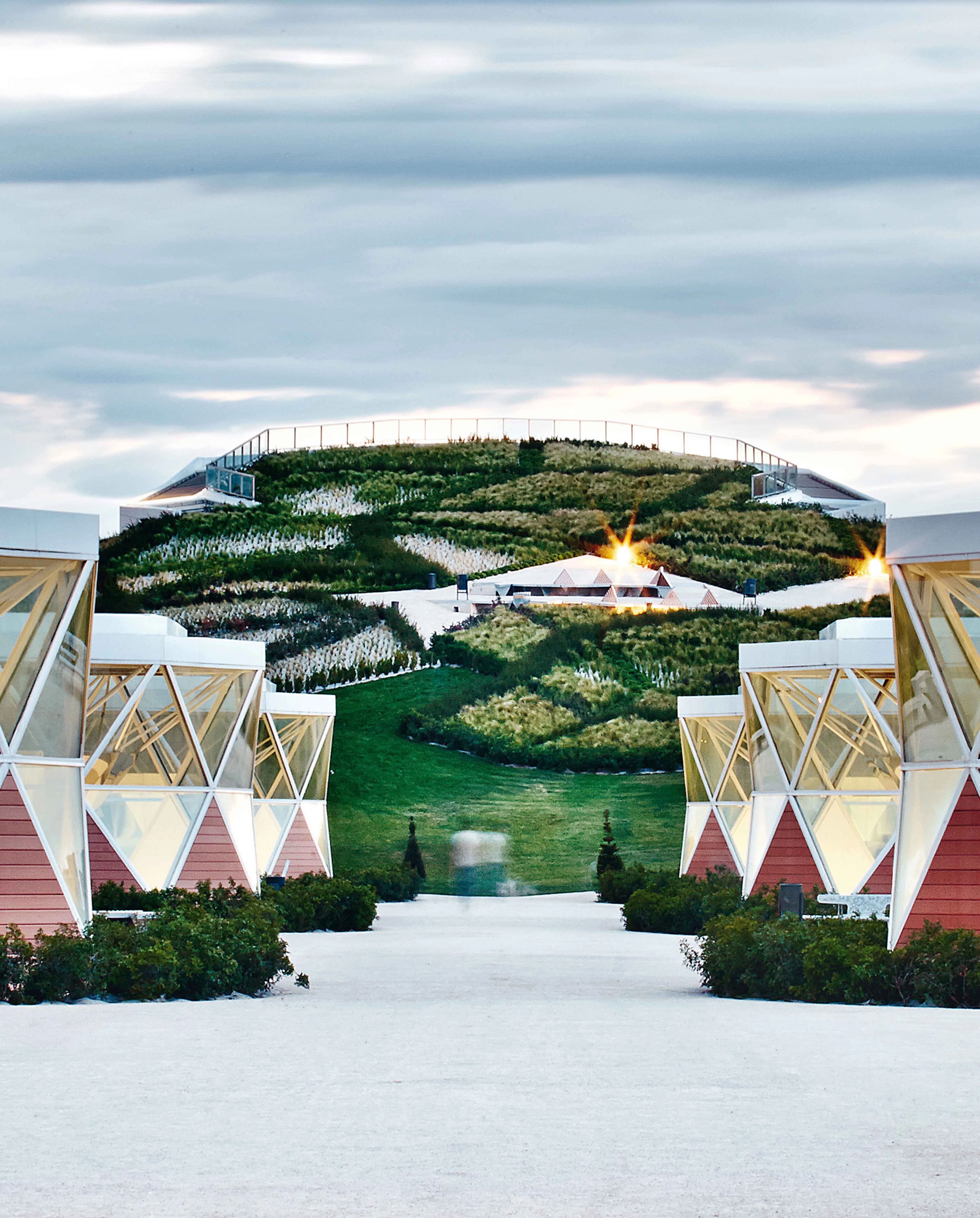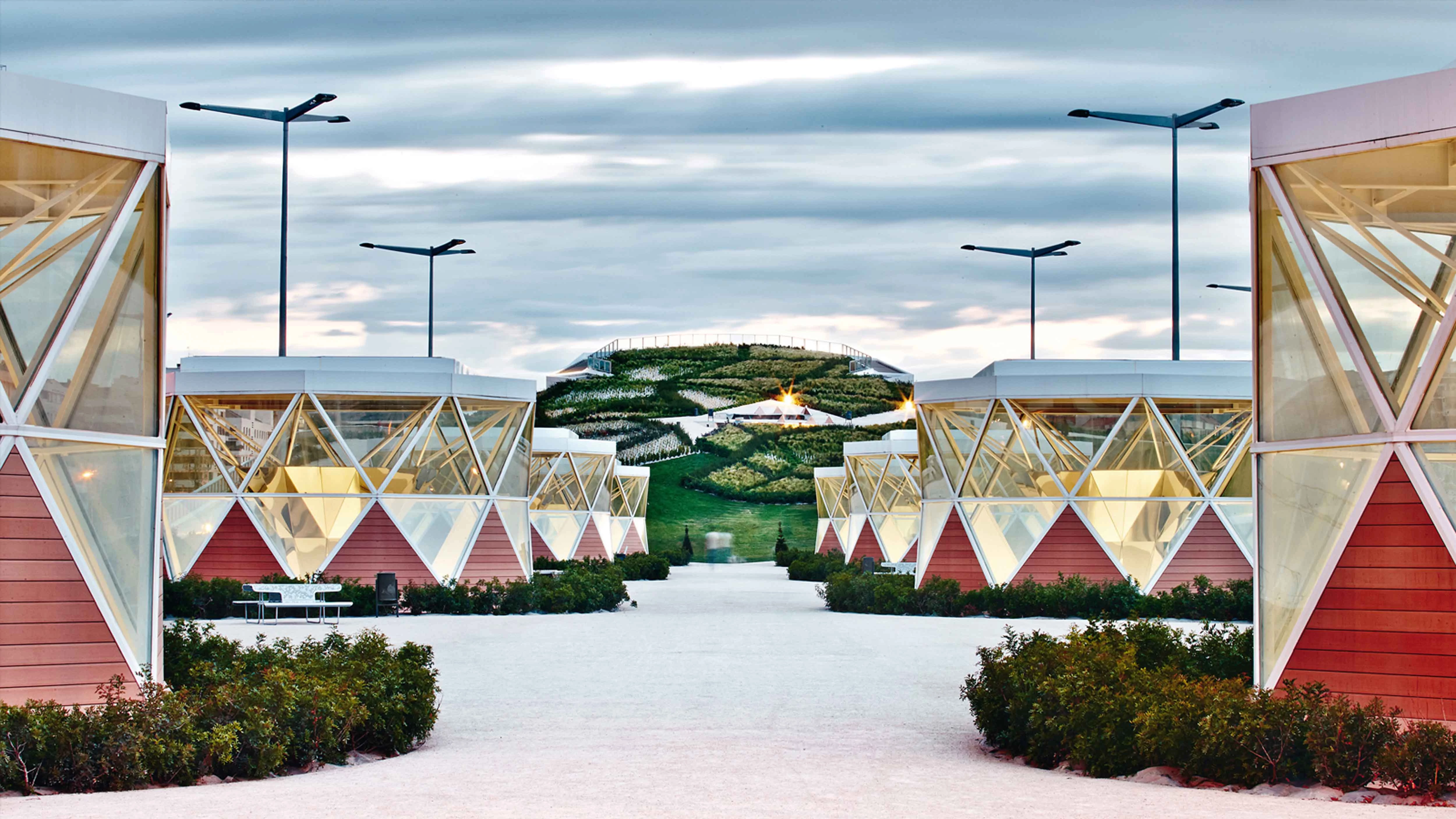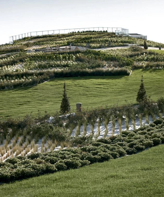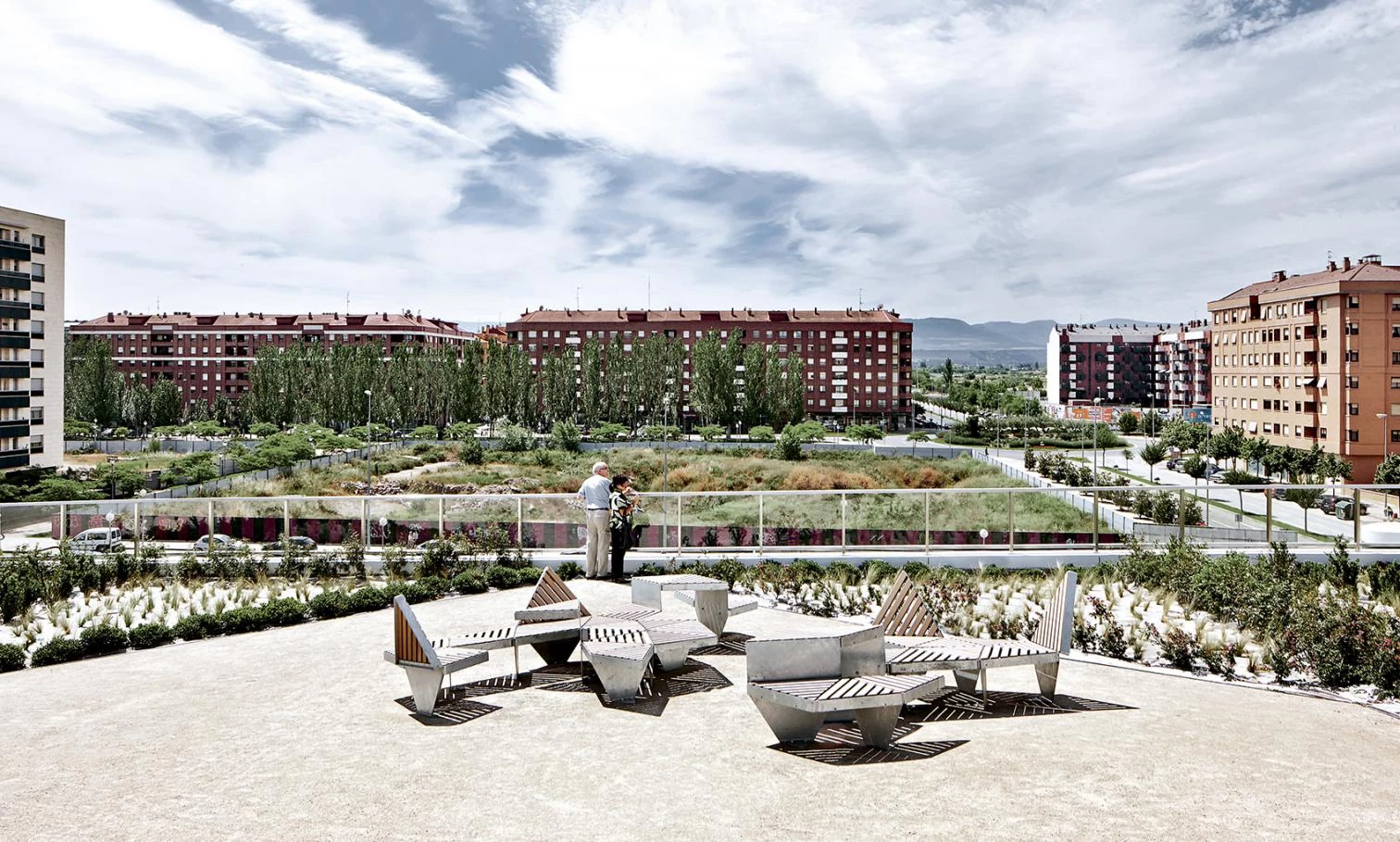 Like a sort of artificial hill, the station is covered by a large landscaped park with paths and triangulated parterres; a breakout space that fosters interaction among neighbors and offers views of the city.