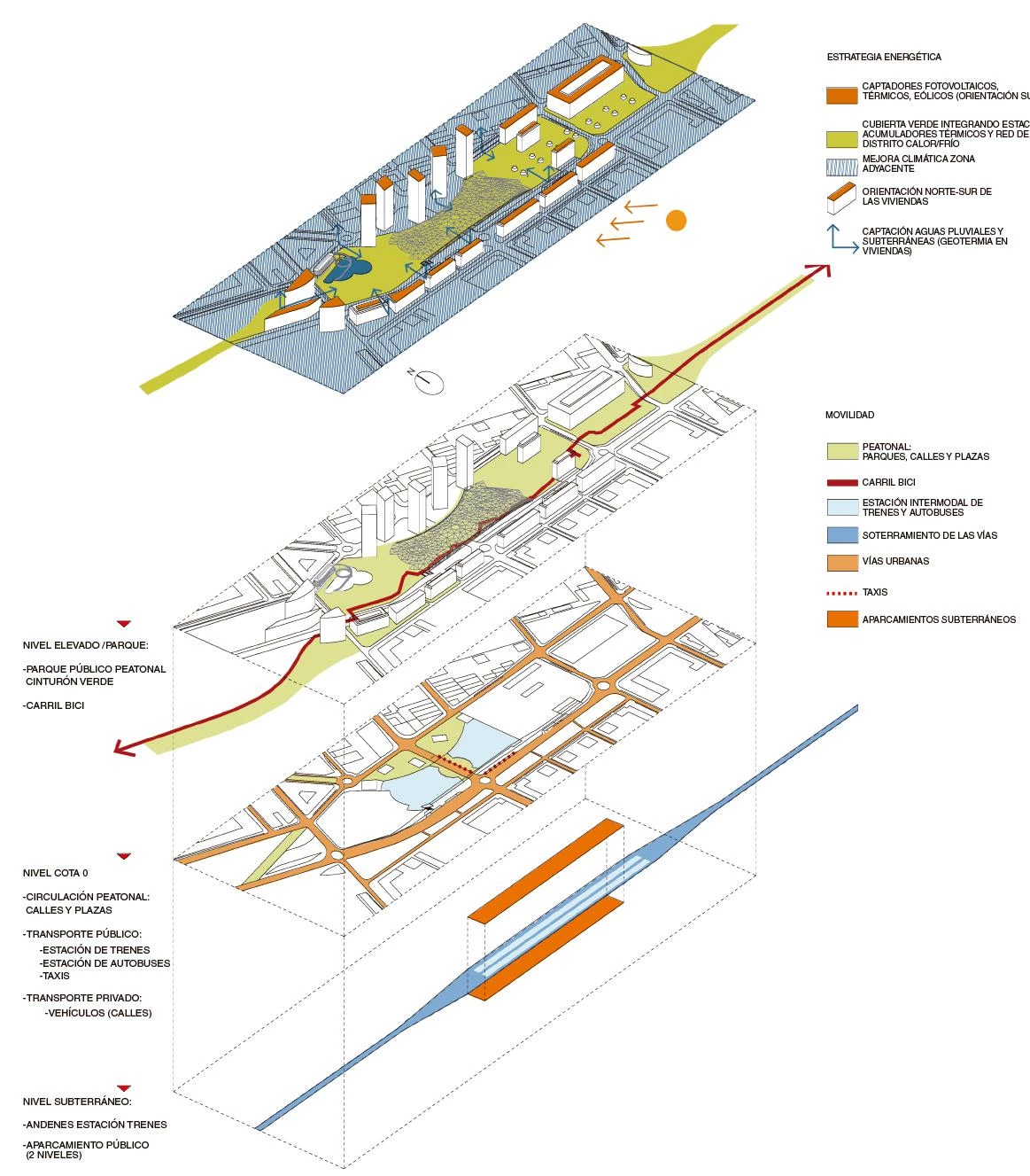 Train stations built at street level often involve an abrupt interruption of urban connectivity, and that same infrastructure that was meant to link the city with the territory ends up leaving a void that generates both physical and social segregation. The project to bury the railway tracks and to recover the free-flowing character of the urban pattern also encouraged to rethink the train station as building type from a different perspective. In this case it meant paying special attention to public spaces by developing green belts and by promoting alternative mobility means for pedestrians and bicycles. The new Transportation Hub of Logroño is set forth as a totalizing topography – and, in this sense, it becomes a pioneering experience in the fields of ‘landform architecture’ or ‘ecological urbanism’–, dealing with a broad range of aspects: infrastructure and urbanism, landscape and architecture, ecology and economy.