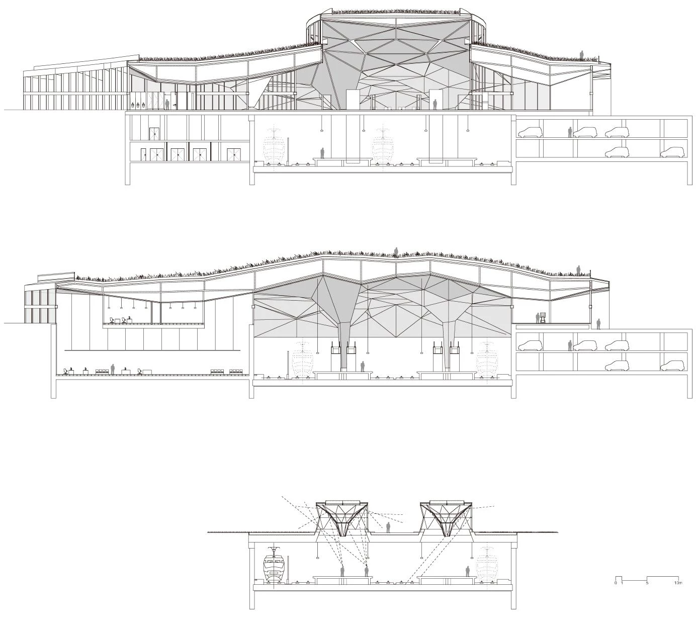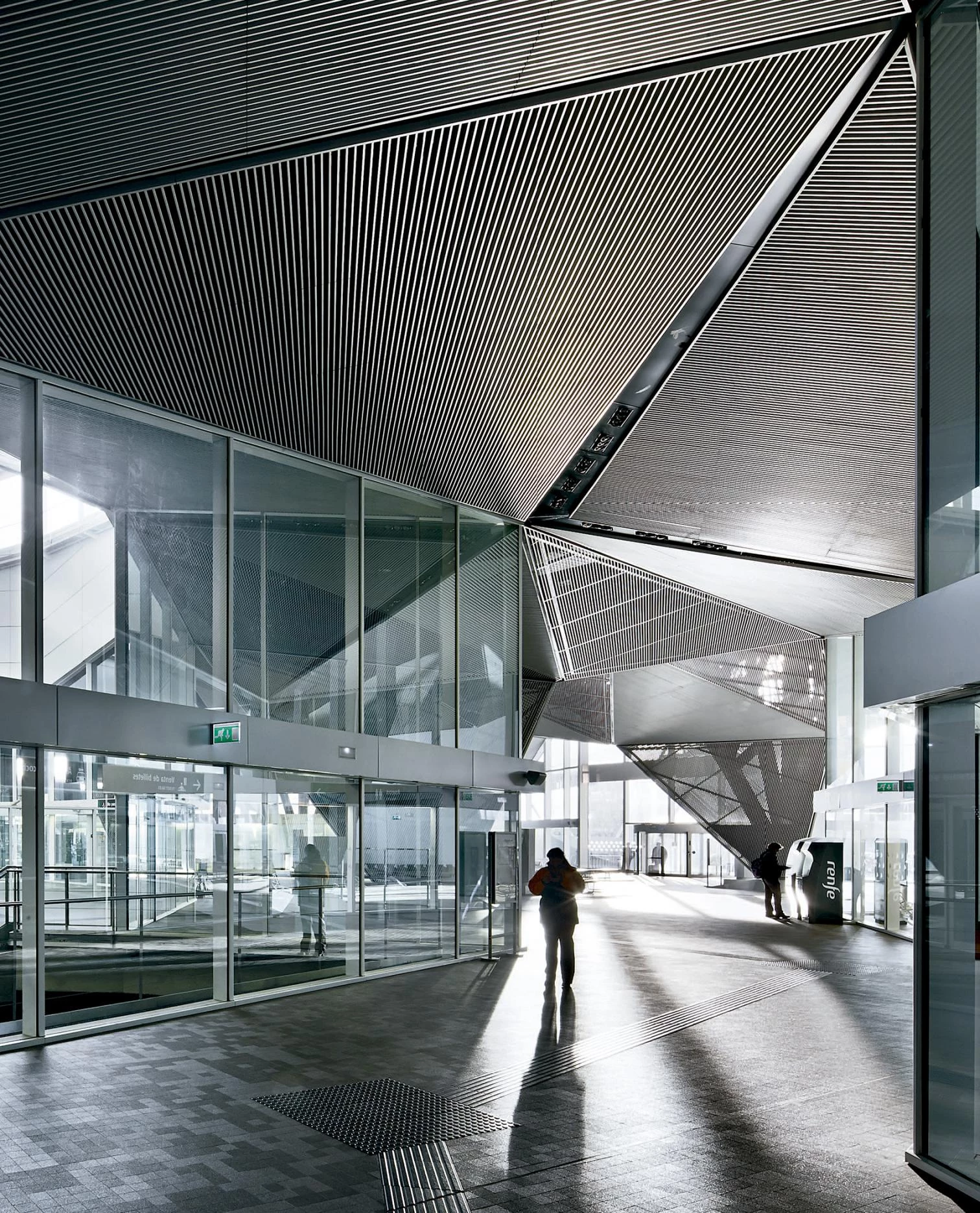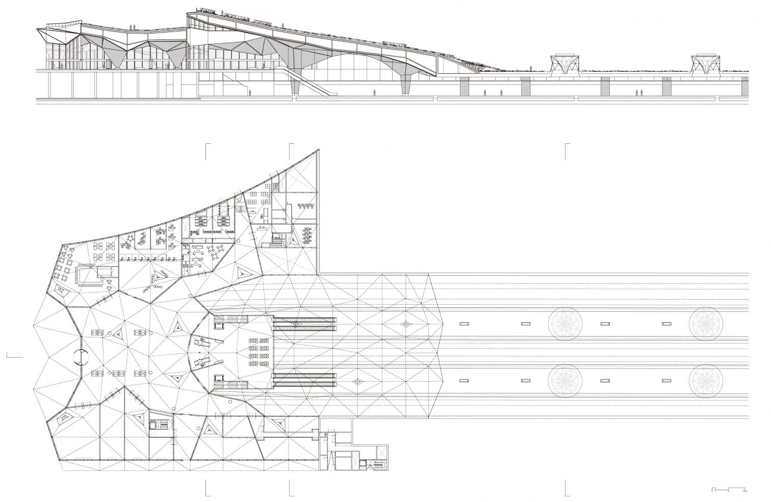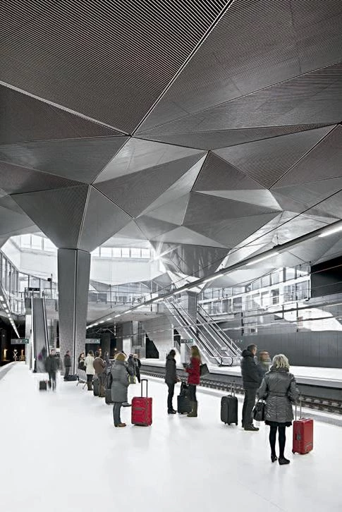 The building stems from the initial idea of gathering the high-speed train station and the bus station in one single formal gesture, bringing them together in one volume with a green roof, becoming above grade a large green belt that takes up the space where once the train tracks split the city in two. With an organic appearance, but a tectonic core, this volume harbors the complex program in spaces configured from tetrahedral forms, and organized around a central dome in two hypostyle aisles that further extend the public dimension of the park.