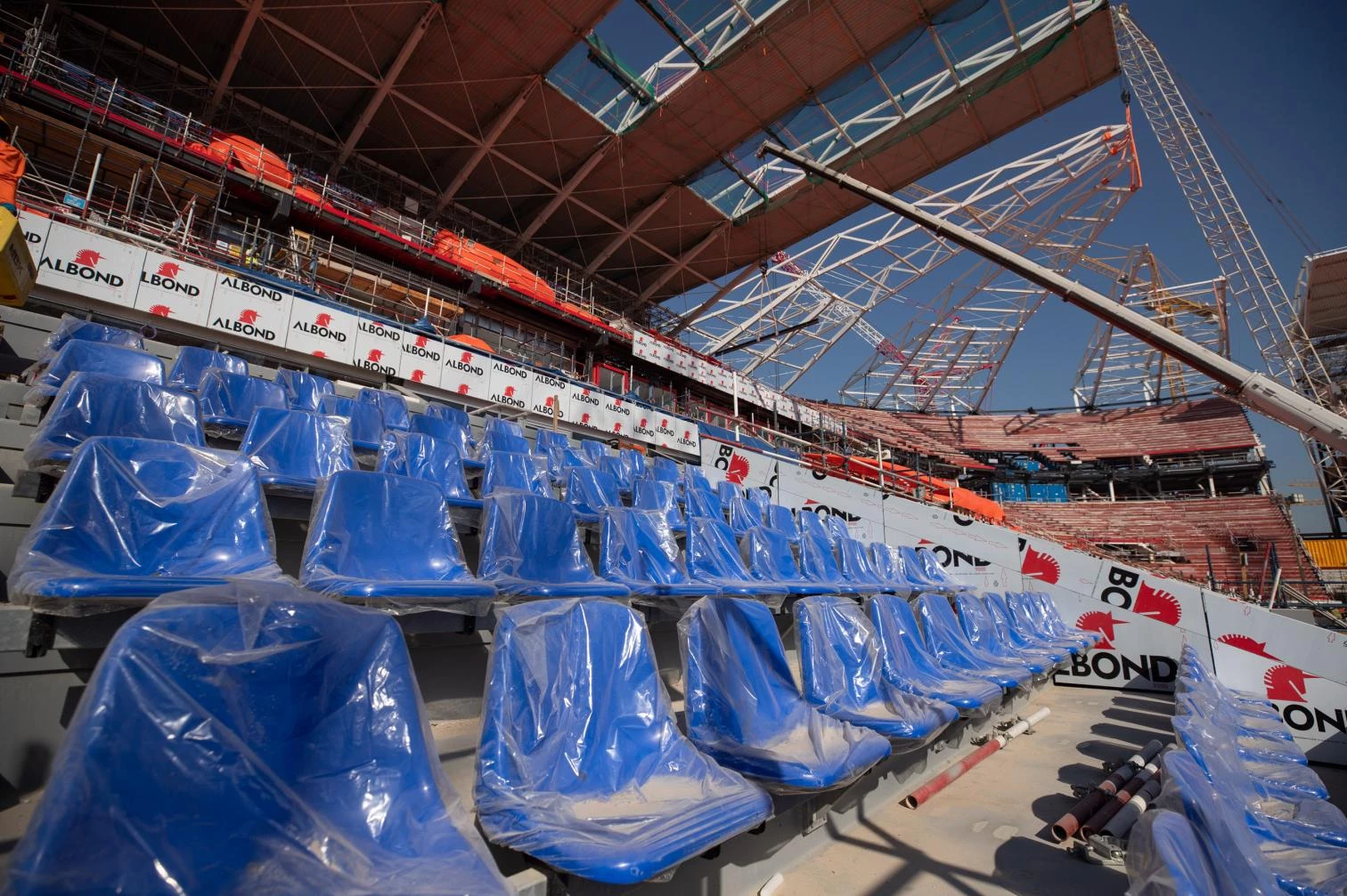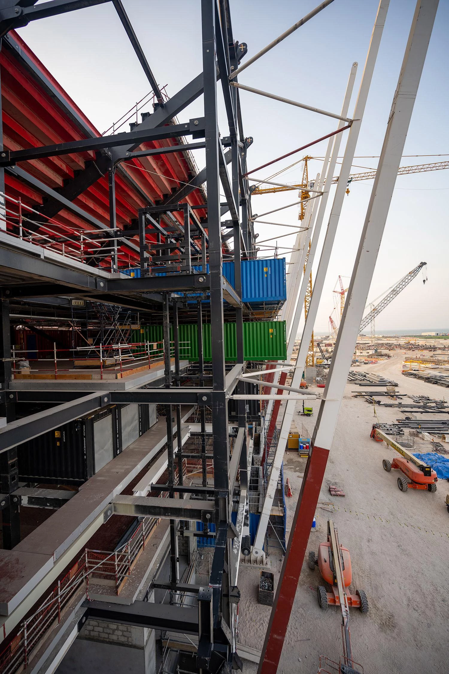 The stadium goes up by the main port of the capital of Qatar. This location inspired a ‘facadeless’ construction using 974 recycled shipping containers to favor natural ventilation and reduce the need for climate control systems.