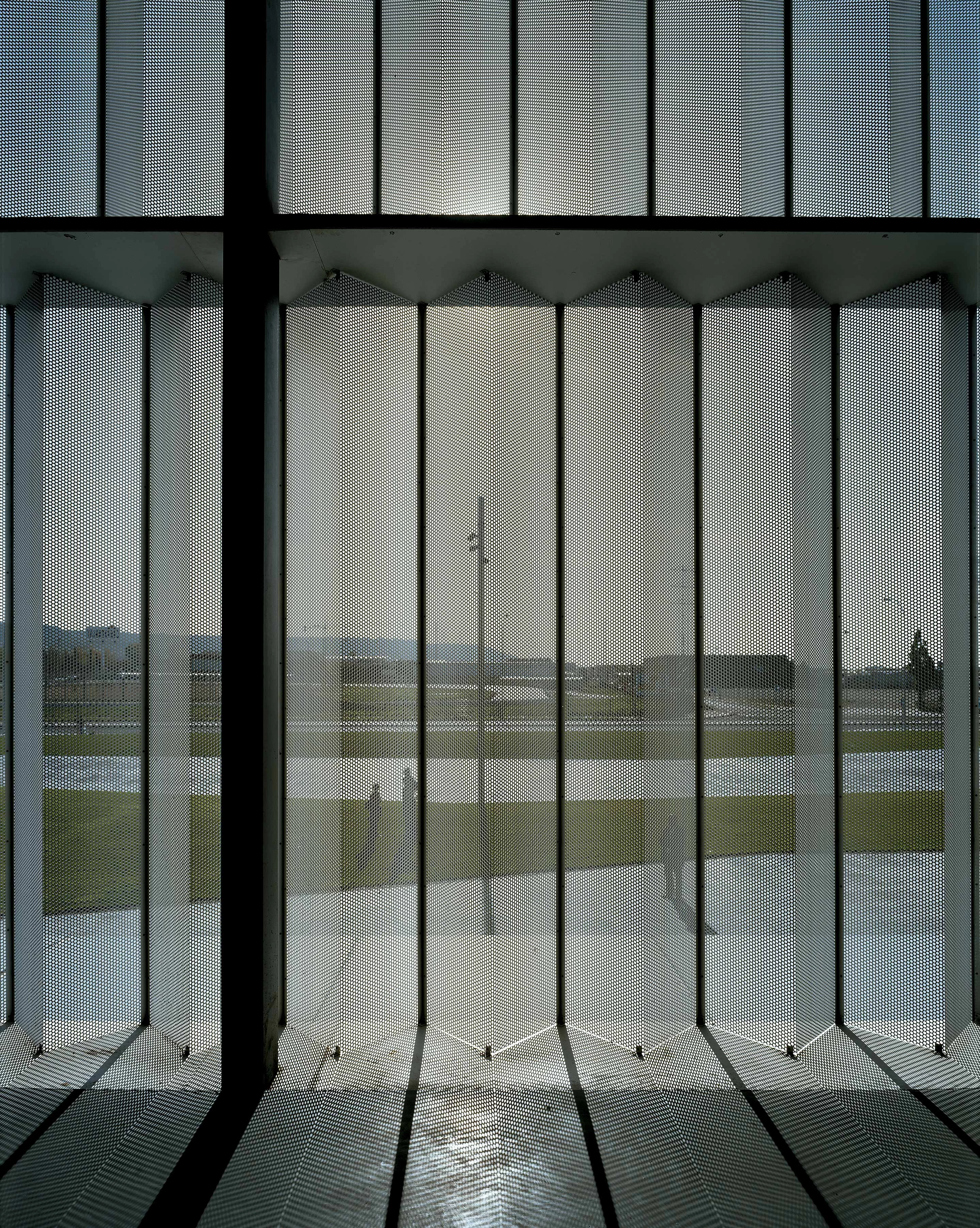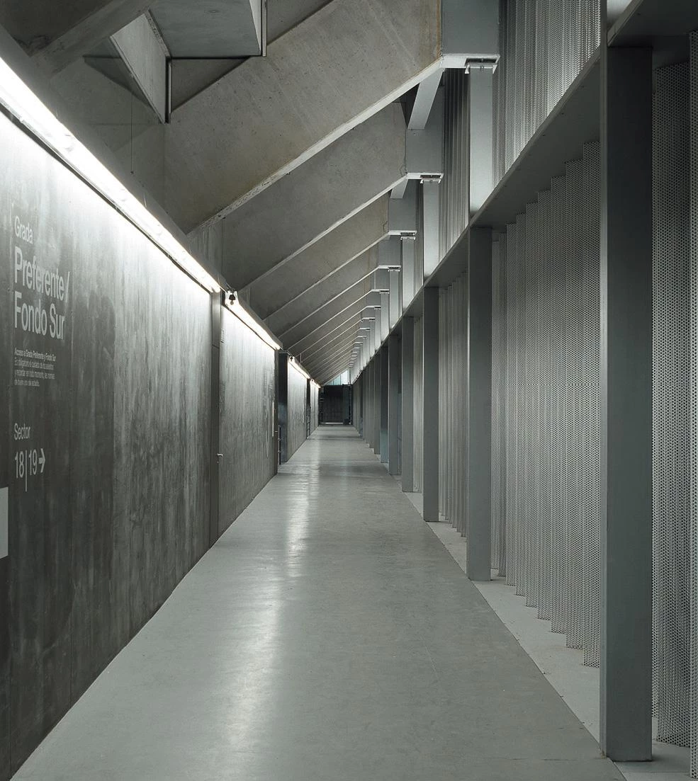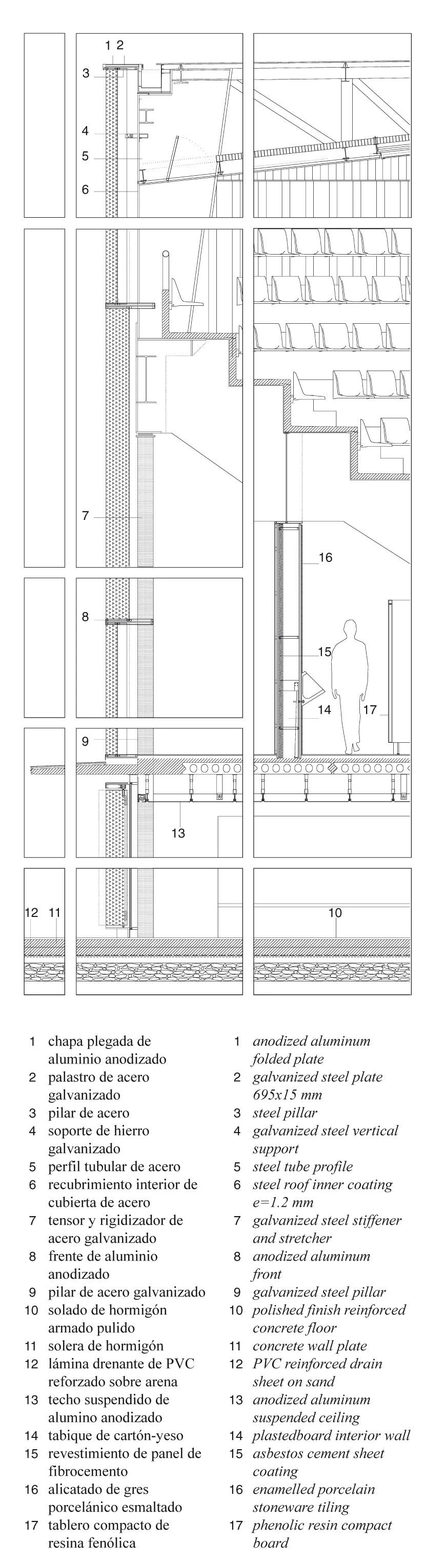 The differentiation of uses is emphasized by the change of materials on the different levels, accentuating the horizontality of the facades. The ground floor is rounded off with a transparent glass enclosure that reflects the more public area of the structure like a shop window, and at the same time improves the conditions of lighting and ventilation in the interior. The upper levels are clad in perforated aluminum sheet that filters the light that bathes the prefabricated concrete grandstands, achieving a degree of translucency that helps to moderate the massive presence of the building’s facades. The roof is made out of steel sheet held by metal trusses.